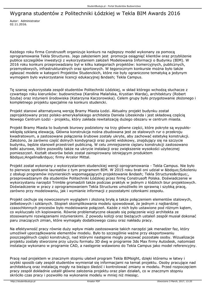 StudentBuduje.pl - Portal Studentów Budownictwa Wygrana studentów z Politechniki Łódzkiej w Tekla BIM Awards 2016 Autor: Administrator 02.11.2016. Każdego roku firma Construsoft organizuje konkurs na najlepszy model wykonany za pomocą oprogramowania Tekla Structures. Jego założeniem jest promocja osiągnięć klientów oraz przybliżenie publice szczegółów inwestycji z wykorzystaniem założeń Modelowania Informacji o Budynku (BIM). W 2016 roku konkurs przeprowadzany był w kilku kategoriach projektów: komercyjnych, publicznych, przemysłowych, infrastrukturalnych oraz sportowych. W tegorocznym konkursie można było także zgłaszać modele w kategorii Projektów Studenckich, które nie były ograniczone tematyką a jedynym wymogiem było wykorzystanie licencji edukacyjnej – Tekla Campus. Tę szansę wykorzystała zespół studentów Politechniki Łódzkiej, w skład którego wchodzą słuchacze z czwartego roku kierunków: budownictwa (Karolina Malańska, Krystian Warda), architektury (Robert Szuba) oraz inżynierii środowiska (Katarzyna Kaczorowska). Celem grupy było przygotowanie złożonego i kompletnego projektu specjalnie na konkurs studencki. Projekt stanowi alternatywną wersję Bramy Miasta Łodzi. Aktualny projekt budynku został zaprojektowany przez polsko-amerykańskiego architekta Daniela Libeskinda i jest składową częścią Nowego Centrum Łodzi - projektu, który zakłada rewitalizację dużego obszaru w centrum miasta. Projekt Bramy Miasta to budynek biurowy podzielony na trzy główne części, które pokryte są wypukłowklęsłą szklaną elewacją. Główna konstrukcja nośna zbudowana jest ze stalowych rur o przekroju kwadratowym, a zastosowane połączenia śrubowe zostały ukryte, aby zachować estetykę konstrukcji. Założono, że zarówno część dolnych kondygnacji oraz punkt widokowy, znajdujący się na szczycie budynku, będzie stanowił przestrzeń publiczną. W celu zmniejszenie ciężaru konstrukcji zastosowano belki ażurowe, które pozwoliły także na ukrycie instalacji oraz zwiększenie wysokości użytecznej pomieszczeń. Kształt otworów belek został zainspirowany istniejącym produktem „Angelina” firmy Arcelor Mittal. Projekt został wykonany z wykorzystaniem studenckiej wersji oprogramowania - Tekla Campus. Nie było to pierwsze spotkanie laureatów z tym programem BIM. W 2015 roku brali oni udział w „Szkoleniu z obsługi programów inżynierskich wspomagających projektowanie – Tekla Structures”, przeprowadzanym dla studentów Politechniki Łódzkiej przez firmę Construsoft Polska. Doświadczenie w wykorzystaniu narzędzi Trimble gromadzili także podczas praktyk w jednym z łódzkich biur projektowych. Doświadczenie w pracy z oprogramowaniem Tekla Structures umożliwiło im sprawną i szybką pracę, zarówno przy modelowaniu, jak i wymianie informacji z pozostałymi członkami zespołu. Projekt cechuje się nowoczesnym wyglądem i złożoną bryłą a także połączeniem elementów stalowych, żelbetowych i szklanych. Stopień skomplikowania modelu spowodował, że jednym z najbardziej czasochłonnych procesów było modelowanie połączeń. Każde z nich było ustawione pod różnym kątem, co wykluczało ich kopiowanie. Równie problematyczne okazało się połączenie wizji architekta ze stosowanymi rozwiązaniami inżynierskimi. Z powodu kolizji oraz bieżących ustaleń zespół musiał dokonać paru znaczących zmian, które wymagały dodatkowego czasu oraz nakładu pracy. Na efektywność pracy równie duży wpływ miało zastosowanie takich narzędzi jak menadżer faz, który umożliwił uporządkowanie elementów modelu. Było to szczególnie ważne przy eksportowaniu poszczególnych części konstrukcji, nad którymi następnie mogły pracować pozostałe osoby. Wizualizacje projektu zostały stworzone przy użyciu formatu 3D dwg w programie 3ds Max firmy Autodesk, natomiast instalacje wykonano w programie CAD, a następnie wstawiono do Tekla Campus jako model referencyjny. Pracę nad projektem w znacznym stopniu ułatwił program Tekla BIMsight, dzięki któremu w łatwy i szybki sposób cały zespół studentów wymieniał się informacjami na temat projektu. Osoby pracujące nad architekturą oraz instalacją mogły na bieżąco śledzić i kontrolować zmiany w modelu. Przed rozpoczęciem pracy zespół dokładnie ustalił główne założenia projektu oraz plan działań, co w znacznym stopniu skróciło czas pracy i pozwoliło na wykonanie modelu w mniej niż miesiąc. http://studentbuduje.pl Kreator PDF Utworzono 3 March, 2017, 13:20 StudentBuduje.pl - Portal Studentów Budownictwa Doskonała współpraca między studentami, nowoczesna i złożona konstrukcja, użycie różnorodnych materiałów wpłynęły na uzyskanie 1 miejsca w lokalnej edycji konkursu oraz przejście do fazy międzynarodowej. We wrześniu, na podstawie decyzji jury złożonego ze specjalistów BIM z całego świata, „Lodz City Gate” został najlepszym projektem studenckim w Tekla Global BIM Awards 2016. Czworo laureatów konkursu jest członkami Studenckiego Koła Naukowego Projektowania Konstrukcji Stalowych przy Politechnice Łódzkiej, którego działalność nastawiona jest przede wszystkim na praktyczne poszerzanie wiedzy i umiejętności zarówno poprzez pracę zespołową, jak i rozwój indywidualny. Założenia te na pewno zostały wykorzystane przez czworo naszych zwycięzców i także przyczyniły się do osiągnięcia sukcesu na skalę światową. (źródło rysunków i zdjęć: Zespół studentów Politechniki Łódzkiej) http://studentbuduje.pl Kreator PDF Utworzono 3 March, 2017, 13:20