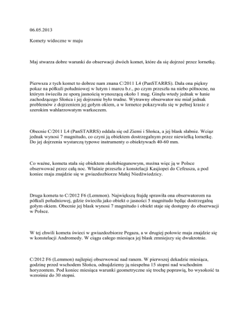 06.05.2013 Komety widoczne w maju Maj stwarza dobre warunki do