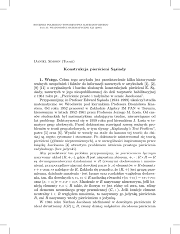 ROCZNIKI POLSKIEGO TOWARZYSTWA MATEMATYCZNEGO Seria II: WIADOMOŚCI MATEMATYCZNE XLI (2005) Daniel Simson (Toruń) Konstrukcja pierścieni Sąsiady 1. Wstęp. Celem tego artykułu jest przedstawienie kilku historycznie ważnych uzupełnień i faktów do informacji zawartych w artykułach [1], [2], [9]–[11] o oryginalnych i bardzo złożonych konstrukcjach pierścieni E. Sąsiady, zawartych w jego nieopublikowanej do dziś rozprawie habilitacyjnej z 1961 roku pt. „Pierścienie proste i radykalne w sensie Jacobsona”. Przypomnijmy, że Profesor Edward Sąsiada (1934–1999) ukończył studia matematyczne we Wrocławiu pod kierunkiem Profesora Bronisława Knastera. Od roku 1952 pracował w Zakładzie Algebry IM PAN w Toruniu, kierowanym w latach 1952–1961 przez Profesora Jerzego M. Łosia. Od czasów studenckich był matematykiem atakującym trudne, nierozwiązane od lat problemy. Doktoryzował się w 1959 roku pod kierunkiem J. Łosia w tematyce grup abelowych. Przed doktoratem rozwiązał szereg ważnych problemów w teorii grup abelowych, w tym słynny „Kaplansky’s Test Problem”, patrz [5] oraz [6]. Wyniki te weszły na stałe do kanonu tej teorii; do dzisiaj są często cytowane i stosowane. Po doktoracie zainteresował się teorią pierścieni (głównie nieprzemiennych), a w szczególności inspirowanym przez książkę Jacobsona [4] otwartym problemem istnienia prostego pierścienia radykalnego (bez jedynki). Aby przedstawić ten problem przypomnijmy, że pierścieniem łącznym nazywamy układ (R, +, ·), gdzie R jest niepustym zbiorem, +, · : R×R → R są dwuargumentowymi działaniami w R (zwanymi dodawaniem i mnożeniem), przyporządkowującymi dowolnej parze (r, s) elementów w R elementy r + s oraz rs należące do R. Zakłada się ponadto, że (R, +) jest grupą przemienną, działanie mnożenia · jest łączne oraz rozdzielne względem dodawania, tzn. dla dowolnych r, s1 , s2 ∈ R zachodzą równości r(s1 +s2 ) = rs1 +rs2 oraz (s1 + s2 )r = s1 r + s2 r. Mnożenie w R nazywamy niezerowym, jeśli istnieją elementy r, s ∈ R takie, że iloczyn rs jest różny od zera, tzn. różny od elementu neutralnego grupy przemiennej (G, +). Jeśli istnieje element neutralny 1 ∈ R względem mnożenia, to nazywamy go jedynką pierścienia R, zaś R nazywamy wtedy pierścieniem z jedynką. W 1945 roku Nathan Jacobson zdefiniował w dowolnym pierścieniu R ideał dwustronny J(R) ⊆ R, zwany dzisiaj radykałem Jacobsona pierścienia 120 D. S i m s o n R, jako zbiór wszystkich elementów r ∈ R takich, że dla dowolnego x ∈ R istnieje y ∈ R, dla którego zachodzą równości xr + y + xry = rx + y + yrx = 0, patrz [4]. Oryginalna definicja radykału podana przez Jacobsona różni się od powyższej, ale nieskomplikowany rachunek pokazuje, że obie definicje są równoważne (patrz wstęp w monografii C. Faitha [3]). Jeśli pierścień R posiada jedynkę 1 ∈ R, to równości powyższe przyjmują postać (1 + xr)(1 + y) = 1 = (1 + y)(1 + rx), co oznacza, że r ∈ J(R) wtedy i tylko wtedy, gdy element 1 + xr jest odwracalny w R, dla dowolnego x ∈ R. Jest to powszechnie znana obecnie postać definicji radykału Jacobsona. W tym wypadku J(R) jest dwustronnym ideałem w pierścieniu R, równym przekrojowi wszystkich prawych (bądź lewych) maksymalnych ideałów w R. Stąd wynika, że J(R) 6= R, o ile R jest pierścieniem z jedynką. Pierścień R nazywamy prostym, jeśli jedynymi jego dwustronnymi ideałami są ideał zerowy oraz cały pierścień R. Pierścień R (bez jedynki) nazywamy radykalnym, jeśli J(R) = R. 2. Pobyt Edwarda Sąsiady w Moskwie. Pod koniec 1960 roku E. Sąsiada skonstruował łączny pierścień prosty R bez jedynki, z niezerowym mnożeniem i taki, że J(R) = R (tzn. prosty pierścień radykalny), rozwiązując ważny i trudny problem w teorii pierścieni, czekający na rozwiązanie ponad dziesięć lat. Było to poważne osiągnięcie w skali światowej, a idea konstrukcji takich pierścieni weszła do kanonu metod teorii pierścieni. Do dzisiaj przykład E. Sąsiady i podana przez niego metoda konstrukcji są wysoko cenione przez algebraików na całym świecie. Świadczy o tym m.in. fakt, że proste pierścienie radykalne występują w literaturze naukowej pod nazwą „Sąsiada’s rings”. Nad konstrukcją prostych pierścieni radykalnych E. Sąsiada rozpoczął pracę w Toruniu w roku 1959; kontynuował ją w czasie pobytu na stażu naukowym na Uniwersytecie im. Łomonosowa w Moskwie w roku 1960. W tym czasie uczył się podstaw szeroko rozumianej nowoczesnej algebry, uczestnicząc m.in. w seminarium z teorii pierścieni prowadzonym przez A. G. Kurosza oraz w seminariach z teorii liczb i geometrii algebraicznej prowadzonych przez I. R. Szafarewicza. Interesujące i bardzo osobiste komentarze 36-letniego wówczas Edwarda Sąsiady z moskiewskiego okresu zmagań ze skomplikowaną konstrukcją prostych pierścieni radykalnych, na około dziesięć miesięcy przed definitywnym osiągnięciem celu, a także jego relacje o atmosferze pracy naukowej w Moskwie w tym czasie, zawiera przedstawiony poniżej jego list do Stanisława Konstrukcja pierścieni Sąsiady 121 Balcerzyka z 26 listopada 1960 roku w Moskwie. Kopię tego listu otrzymałem od Prof. S. Balcerzyka 26 marca 2004 roku, tzn. na niespełna rok przed jego przedwczesną śmiercią1. List ten, oprócz dużego ładunku emocjonalnego i niewątpliwych walorów poznawczych, posiada wartość historyczną. Jest on zapewne jedynym, pisanym ręcznie dokumentem tego rodzaju, który pozostawił Prof. E. Sąsiada. Z listu tego dowiadujemy się m.in., że wielu wiodących algebraików tamtego okresu nie wierzyło w istnienie takich pierścieni, jakie chciał skonstuować Sąsiada. Jednym z tych, którzy w to wierzyli, był V. A. Andrunakijewicz. Swoją skomplikowaną konstrukcję prostych pierścieni radykalnych E. Sąsiada przedstawił 20 grudnia 1960 roku na posiedzeniu Moskiewskiego Towarzystwa M