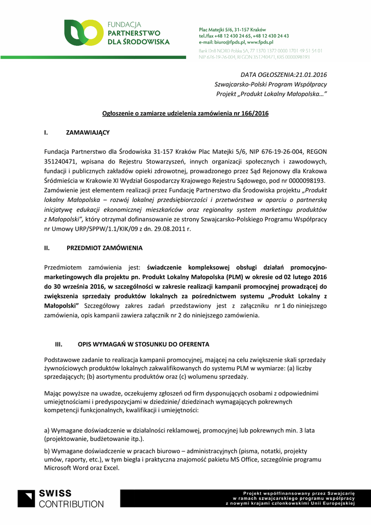 DATA OGŁOSZENIA:21.01.2016 OGŁOSZENIA Szwajcarsko-Polski Polski Program Współpracy Projekt „Produkt Lokalny Małopolska…” Ogłoszenie o zamiarze udzielenia zamówienia nr 166/2016 6 I. ZAMAWIAJĄCY Fundacja Partnerstwo dla Środowiska 31-157 31 Kraków Plac Matejki 5/6, NIP 676-19-26-004, 676 REGON 351240471, wpisana do Rejestru Stowarzyszeń, innych organizacji społecznych i zawodowych, fundacji i publicznych zakładów opieki zdrowotnej, prowadzonego przez Sąd Rejonowy dla Krakowa Śródmieścia w Krakowie XI Wydział Gospodarczy Krajowego Rejestru Sądowego, pod nr 0000098193. Zamówienie jest elementem realizacji przez Fundację Partnerstwo dla Środowiska projektu „Produkt lokalny Małopolska – rozwój lokalnej przedsiębiorczości i przetwórstwa w oparciu o partnerską inicjatywę edukacji ekonomicznej mieszkańców oraz regionalny system marketingu produktów z Małopolski”, który otrzymał dofinansowanie ze strony Szwajcarsko-Polskiego Szwajcarsko Polskiego Programu Współpracy nr Umowy URP/SPPW/1.1/KIK/09 /1.1/KIK/09 z dn. 29.08.2011 r. PRZEDMIOT ZAMÓWIENIA II. Przedmiotem zamówienia jest: jest świadczenie kompleksowej obsługi działań promocyjnomarketingowych dla projektu pn. p Produkt Lokalny Małopolska (PLM) w okresie od 02 lutego 2016 do 30 września 2016,, w szczególności w zakresie realizacji kampanii promocyjnej prowadzącej do zwiększenia sprzedaży produktów lokalnych za pośrednictwem systemu „Produkt Lokalny z Małopolski” Szczegółowy zakres zadań przedstawiony przedstawiony jest z załączniku nr 1 do niniejszego zamówienia,, opis kampanii zawiera załącznik nr 2 do niniejszego zamówienia. III. OPIS WYMAGAŃ W STOSUNKU DO OFERENTA Podstawowe zadanie to realizacja realizacj kampanii promocyjnej, mającej na celu zwiększenie skali sprzedaży żywnościowych produktów lokalnych zakwalifikowanych do systemu PLM w wymiarze: (a) liczby sprzedających; (b) asortymentu produktów oraz (c) wolumenu wolumen sprzedaży. Mając powyższe na uwadze, oczekujemy czekujemy zgłoszeń od firm dysponujących osobami z odpowiednimi umiejętnościami i predyspozycjaami w dziedzinie/ dziedzinach wymagających pokrewnych kompetencji funkcjonalnych, kwalifikacji i umiejętności: a) Wymagane doświadczenie w działalności reklamowej, promocyjnej lub pokrewnych pokrewny min. 3 lata (projektowanie, budżetowanie itp.). itp.) b) Wymagane doświadczenie w pracach biurowo – administracyjnych (pisma, notatki, projekty umów, raporty, etc.), w tym biegła i praktyczna znajomość pakietu MS Office, szczególnie programu Microsoft Word oraz Excel. c) Wymagane wyższe wykształcenie cenie w zakresie dziennikarstwa lub/i marketingu lub/i Public Relations kierunkowe lub podyplomowe. d) Wymagana znajomość języka angielskiego w stopniu umożliwiającym swobodną komunikację. e)) Wymagana znajomość narzędzi marketingowych, w tym umiejętność planowana, planowana realizacji i monitoringu kampanii reklamowych amowych,, w tym produkcja materiałów reklamowych i promocyjnych f)) Wymagana znajomość programów graficznych i DTP, w tym posiadanie licencji na odpowiednie programy i doświadczenie w projektowaniu materiałów promocyjnych. g) Wymagana znajomość HTML i tworzenia stron internetowych. h) Wymagane lekkie pióro oraz doświadczenie w tworzeniu materiałów materiałów prasowych oraz współpracy z mediami ogólnoinformacyjnymi oraz branżowymi. i) Wymagane magane doświadczenie w organizacji i obsłudze eventów promocyjnych, tj. targi, ta festiwale, akcje promocyjne. j) Wymagana znajomość w zakresie fotografii produktowej oraz reportażowej, w tym posiadanie własnego sprzętu fotograficznego. k) Mile widziane doświadczenie iadczenie w pracy przy projektach finansowanych ze środków UE lub podobnych. l) Mile widziane doświadczenie w kreowaniu wizerunku organizacji pozarządowych. IV. OPIS SPOSOBU PRZYGOTOWANIA OFERTY Oferta powinna zostać przygotowana i złożona w formie elektronicznej na adres: [email protected] Oferta powinna zawierać: • datę sporządzenia, • adres oferenta, adres e-mail, mail, numer telefonu kontaktowego, • opis oraz niezbędną dokumentację, dokumentację wykazujące w jednoznaczny sposób, że Oferent spełnia wymagania opisane w pkt. III., promocyjno • zakres oferowanych usług promocyjno-marketingowych, • cenę za roboczogodzinę zgodnie z przedstawionym zakresem zadań. V. MIEJSCE ORAZ TERMIN SKŁADANIA OFERT Oferty należy składać na adres [email protected] w terminie do dnia 01.02.2016 .2016 /poniedziałek/, do godziny 14.00. Przed upływem terminu erminu składania ofert Oferent może zmienić lub wycofać swoją ofertę. Oferty złożone po terminie składania ofert nie będą rozpatrywane. Zamawiający nie dopuszcza składania ofert w częściowych lub wariantowych. Zamawiający nie dopuszcza składania ofert w formie faksu. VI. OCENA OFERT Zamawiający dokona oceny ważnych ofert na podstawie następujących kryteriów: 1. Doświadczenie w zakresie tworzenia i realizowania działań marketingowych oraz PR, w tym działań dot. produktu lokalnego (0-2 2 pkt.). pkt.) 2. Wymagane doświadczenie w pracach biurowo – administracyjnych (pisma, notatki, projekty umów, raporty, etc.), w tym biegła i praktyczna znajomość pakietu MS Office, szczególnie programu Microsoft Word oraz Excel. (0-2 2 pkt.) 3. Wymagane wyższe wykształcenie pracowników w zakresie dziennikarstwa lub/i marketingu ma lub/i Public Relations kierunkowe lub podyplomowe. (0-3 pkt.) 4. Cena jednostkowa (roboczo-godzinowa godzinowa o wartości brutto oraz netto)) oferowanych usług (0-10 (0 pkt.). 5. Zakres oferowanych owanych usług promocyjno-marketingowych promocyjno (0-1 pkt.). 6. Wymagana znajomość języka angielskiego w stopniu umożliwiającym swobodną komunikację (0-1 (0 pkt.). 7. Wymagana znajomość narzędzi marketingowych, w tym umiejętność planowana, realizacji i monitoringu kampanii reklamowych (0-1 (