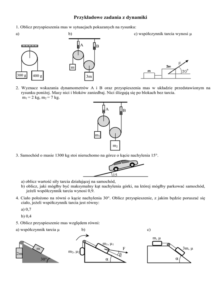 Przykładowe zadania z dynamiki 1. Oblicz przyspieszenia mas w sytuacjach pokazanych na rysunku: a) c) współczynnik tarcia wynosi µ b) A B m 300 g 400 g 3m 2. Wyznacz wskazania dynamometrów A i B oraz przyspieszenia mas w układzie przedstawionym na rysunku poniżej. Masy nici i bloków zaniedbaj. Nici ślizgają się po blokach bez tarcia. m1 = 2 kg, m2 = 7 kg. A B m1 m2 3. Samochód o masie 1300 kg stoi nieruchomo na górce o kącie nachylenia 15. 15 a) oblicz wartość siły tarcia działającej na samochód, b) oblicz, jaki mógłby być maksymalny kąt nachylenia górki, na której mógłby parkować samochód, jeżeli współczynnik tarcia wynosi 0,9. 4. Ciało położono na równi o kącie nachylenia 30. Oblicz przyspieszenie, z jakim będzie poruszać się ciało, jeżeli współczynnik tarcia jest równy: a) 0,7 b) 0,4 5. Oblicz przyspieszenie mas względem równi: a) współczynnik tarcia µ b) c) m, µ m1, µ1 m 2m 30 3m, µ F m2, µ2 α α 6. Oblicz, jaka musi być minimalna wartość przyspieszenia a0, aby ciało zaczęło się wznosić w górę równi, jeśli współczynnik tarcia jest równy 0,8 i = 30. α a0 7. Oblicz przyspieszenie mas 5 kg i 8 kg względem wózka w sytuacji pokazanej na rysunku. Współczynnik tarcia obu mas o podłoże wynosi 0,2, natomiast przyspieszenie wózka wynosi 3 m/s 2. Sprawdź, wykonując odpowiednie obliczenia, czy masy mogłyby poruszać się w lewo, dla odpowiedniej wartości przyspieszenia wózka. Nić ślizga się po bloku bez tarcia. 5 aW 8 8. Oblicz przyspieszenie mas względem równi: a) b) c) 4m, µ F m1, µ1 m1, µ1 m2, µ2 m, µ m2, µ2 α α α aR aR 9. Oblicz przyspieszenie mas względem windy" a) b) aw m 3m aw m 3m 10. Oblicz, jaki jest współczynnik tarcia opon o asfalt, jeśli samochód wypadł z zakrętu o promieniu 30 m przy prędkości 100 km/h? 11. Współczynnik tarcia opon samochodu o asfalt jest równy 1. Samochód ten pokonuje zakręt po suchym asfalcie z maksymalną prędkością 110 km/h. Z jaką prędkością samochód pokona ten sam zakręt po deszczu, gdy współczynnik tarcia zmaleje o 40%? 12. Z jaką najmniejszą szybkością może jechać motocyklista po wewnętrznej stronie pionowej powierzchni walcowej o promieniu 10 m, jeżeli współczynnik tarcia między oponami i powierzchnią ściany jest równy 0,5, a środek ciężkości motocykla wraz z motocyklistą znajduje się w odległości 1 m od ściany? 13. Dwie łódki o takiej samej masie 100 kg płyną jedna za drugą z prędkościami 2 m/s. W pewnej chwili z 1 łódki przerzucono na drugą ciało o masie 5 kg z prędkością 6 m/s względem łódki a gdy spadło na łódkę odrzucono je z powrotem z taką samą prędkością względem łódki. Wyznaczyć końcowe prędkości łódek. 14. Dwie łódki o masach 150 kg płyną naprzeciw siebie z prędkościami 3 m/s. W momencie mijania człowiek z 1 łódki upuścił na drugą ciężar o masie 30 kg. Wyznaczyć prędkości końcowe łódek. 15. Trzy łódki o identycznych masach M płyną jedna za drugą, z prędkościami v. W pewnej chwili z pierwszej i ostatniej przerzucono do środkowej łódki masy m z prędkością u względem łódki. Oblicz końcowe prędkości łódek. 16. Na krawędzi murku o wysokości 2m leży klocek o masie 3 kg. W pewnej chwili w klocek uderzył pocisk o masie 20 g lecący poziomo z prędkością 50 m/s i utkwił w nim. Oblicz, jakiej odległości od murku spadnie klocek? 17. Piłka o masie 200 g poruszająca się z szybkością 9 m/s zderza się ze ścianą tak, że kąt między kierunkami ruchu jest równy 60°. Znaleźć czas trwania zderzenia, jeżeli średnia siła zderzenia jest równa 20 N i jest ono doskonale sprężyste. 18. Piłka o masie 200 g lecąca z prędkością 20 m/s uderzyła prostopadle w ścianę i odbiła się od niej sprężyście. Wiedząc, że zderzenie trwało 0,2 s obliczyć siłę z jaką ściana działała na piłkę. 19. Oblicz, z jakiej najmniejszej wysokości musi zsuwać się ciało, aby pokonać pętlę jak na rysunku? 20. Kulka o masie 20 g lecąca poziomo z prędkością 100 m/s uderzyła w wahadło balistyczne o masie 5 kg i długości 1,5 m i utkwiła w nim. Oblicz, o jaki kąt odchyliło się wahadło i ile wydzieliło się ciepła w wyniku tego zderzenia? 21. Dwie kule o masach 1 kg i 4 kg zawieszone są na dwóch równoległych niciach o długości 1 m i stykają się ze sobą. Kula o masie 1 kg została odchylona o kąt 90° od początkowego położenia i puszczona. Znaleźć szybkości kul po zderzeniu, zakładając, że było ono doskonale niesprężyste. 22. Dwie kulki z plasteliny o masach 100 g i 300 g lecące naprzeciw siebie z prędkościami odpowiednio 20 m/s i 8 m/s zderzyły się, w wyniku czego zlepiły się. Z jaką prędkością porusza się powstała bryła z plasteliny? 23. Dwie kulki o masach 60 g i 150 g lecące naprzeciw siebie z prędkościami odpowiednio 80 m/s i 40 m/s zderzyły się, w wyniku czego mniejsza kulka porusza się w przeciwną stronę niż przed zderzeniem z prędkością 10 m/s. Wyznaczyć kierunek ruchu i prędkość większej kulki. 24. Kulka o masie 20 g, lecąca z prędkością 20 m/s, uderzyła w wiszącą na nici o długości 1,5 m kulę, odbiła się od niej i leci z powrotem prędkością 10 m/s. W wyniku tego zderzenia kula uzyskała prędkość 0,5 m/s. Zderzenie trwało 0,02 s. a) oblicz masę kuli wiszącej na nici, b) sprawdź, czy zderzenie było sprężyste, c) oblicz, o jaki maksymalny kąt wychyliła się kula wisząca na nici 25. Dwie kule o masach m1 = 2 kg i m2 = 5 kg, wiszące na cieniutkich, nieważkich i nierozciągliwych nitkach o długości 1 m, odchylono na wysokość 1 m każdą. Spadające kule zderzyły się ze sobą sprężyście. Oblicz kąty, o jakie odchylą się kulki po zderzeniu. 26. Dwie kulki o masach 0,15 kg i 0,8 kg wiszą na nitkach o długości 1,5 m, stykając się ze sobą. W pewnej chwili odchylono je o 90 jedną w lewo, a drugą w prawo i puszczono. Spa