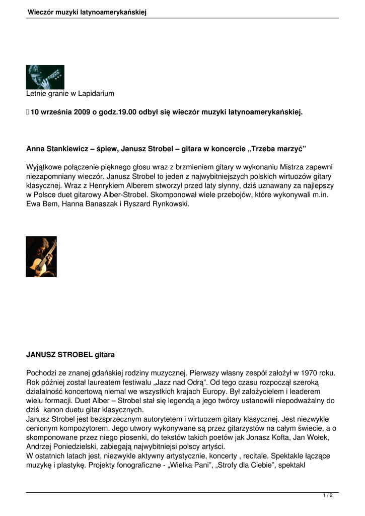 Wieczór muzyki latynoamerykańskiej Letnie granie w Lapidarium 10 września 2009 o godz.19.00 odbył się wieczór muzyki latynoamerykańskiej. Anna Stankiewicz – śpiew, Janusz Strobel – gitara w koncercie „Trzeba marzyć” Wyjątkowe połączenie pięknego głosu wraz z brzmieniem gitary w wykonaniu Mistrza zapewni niezapomniany wieczór. Janusz Strobel to jeden z najwybitniejszych polskich wirtuozów gitary klasycznej. Wraz z Henrykiem Alberem stworzył przed laty słynny, dziś uznawany za najlepszy w Polsce duet gitarowy Alber-Strobel. Skomponował wiele przebojów, które wykonywali m.in. Ewa Bem, Hanna Banaszak i Ryszard Rynkowski. JANUSZ STROBEL gitara Pochodzi ze znanej gdańskiej rodziny muzycznej. Pierwszy własny zespół założył w 1970 roku. Rok później został laureatem festiwalu „Jazz nad Odrą”. Od tego czasu rozpoczął szeroką działalność koncertową niemal we wszystkich krajach Europy. Był założycielem i leaderem wielu formacji. Duet Alber – Strobel stał się legendą a jego twórcy ustanowili niepodważalny do dziś kanon duetu gitar klasycznych. Janusz Strobel jest bezsprzecznym autorytetem i wirtuozem gitary klasycznej. Jest niezwykle cenionym kompozytorem. Jego utwory wykonywane są przez gitarzystów na całym świecie, a o skomponowane przez niego piosenki, do tekstów takich poetów jak Jonasz Kofta, Jan Wołek, Andrzej Poniedzielski, zabiegają najwybitniejsi polscy artyści. W ostatnich latach jest, niezwykle aktywny artystycznie, koncerty , recitale. Spektakle łączące muzykę i plastykę. Projekty fonograficzne - „Wielka Pani”, „Strofy dla Ciebie”, spektakl 1/2 Wieczór muzyki latynoamerykańskiej muzyczny do tekstów Jana Wołka - „Dwoje na jednośladzie”. Muzyka Janusza Strobla, jego kompozycje oraz oryginalny sposób gry na gitarze klasycznej to wartość sama dla siebie. Jest on artystą wiernym tradycji, traktuje ją z pokorą i skromnością. Dzięki swej wyobraźni porusza się jednak w jej kanonie z wielką swobodą. Trafnie oddają specyfikę jego osobowości słowa Jarosława Śmietany, recenzującego jedną z płyt: „...Wyjątkowość Janusza polega głównie na tym, że należy on do tej grupy artystów, którzy ponad wszystko, cenią sobie poczucie dobrego smaku we wszystkich działaniach artystycznych...” (Muzyk, 05.94.) Foto Dariusz Berdys 2/2