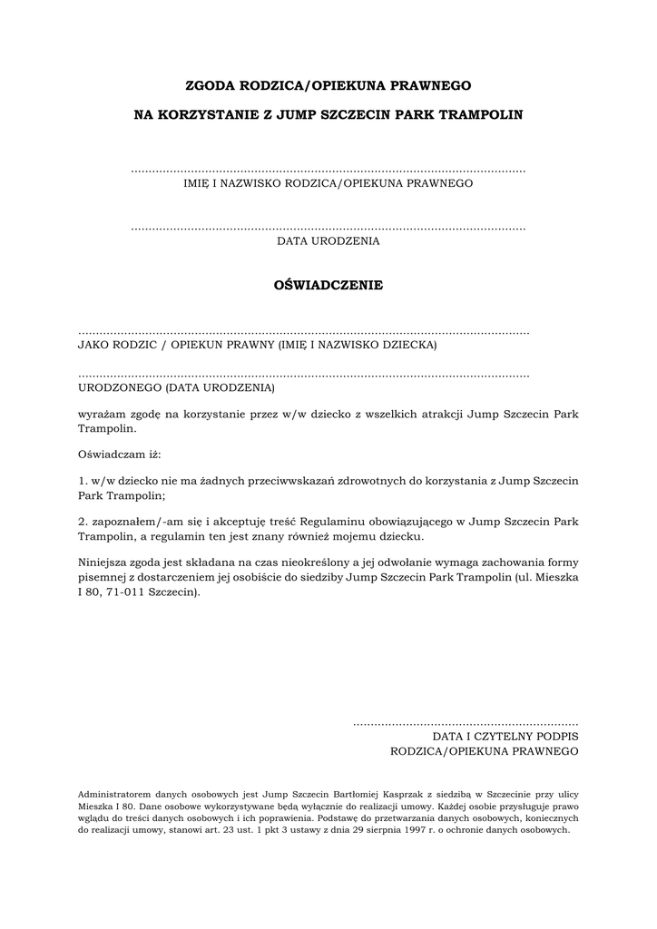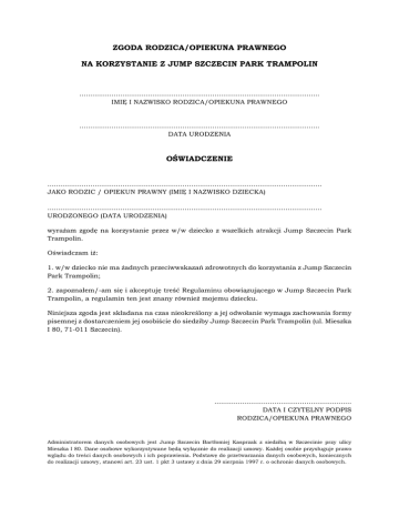 ZGODA RODZICA/OPIEKUNA PRAWNEGO NA KORZYSTANIE Z JUMP SZCZECIN PARK TRAMPOLIN ................................................................................................................ IMIĘ I NAZWISKO RODZICA/OPIEKUNA PRAWNEGO ................................................................................................................ DATA URODZENIA OŚWIADCZENIE ................................................................................................................................ JAKO RODZIC / OPIEKUN PRAWNY (IMIĘ I NAZWISKO DZIECKA) ................................................................................................................................ URODZONEGO (DATA URODZENIA) wyrażam zgodę na korzystanie przez w/w dziecko z wszelkich atrakcji Jump Szczecin Park Trampolin. Oświadczam iż: 1. w/w dziecko nie ma żadnych przeciwwskazań zdrowotnych do korzystania z Jump Szczecin Park Trampolin; 2. zapoznałem/-am się i akceptuję treść Regulaminu obowiązującego w Jump Szczecin Park Trampolin, a regulamin ten jest znany również mojemu dziecku. Niniejsza zgoda jest składana na czas nieokreślony a jej odwołanie wymaga zachowania formy pisemnej z dostarczeniem jej osobiście do siedziby Jump Szczecin Park Trampolin (ul. Mieszka I 80, 71-011 Szczecin). ................................................................ DATA I CZYTELNY PODPIS RODZICA/OPIEKUNA PRAWNEGO Administratorem danych osobowych jest Jump Szczecin Bartłomiej Kasprzak z siedzibą w Szczecinie przy ulicy Mieszka I 80. Dane osobowe wykorzystywane będą wyłącznie do realizacji umowy. Każdej osobie przysługuje prawo wglądu do treści danych osobowych i ich poprawienia. Podstawę do przetwarzania danych osobowych, koniecznych do realizacji umowy, stanowi art. 23 ust. 1 pkt 3 ustawy z dnia 29 sierpnia 1997 r. o ochronie danych osobowych.