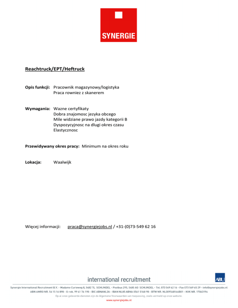 Reachtruck/EPT/Heftruck Opis funkcji: Pracownik magazynowy/logistyka Praca rowniez z skanerem Wymagania: Wazne certyfikaty Dobra znajomosc jezyka obcego Mile widziane prawo jazdy kategorii B Dyspozycyjnosc na dlugi okres czasu Elastycznosc Przewidywany okres pracy: Minimum na okres roku Lokacja: Waalwijk Więcej informacji: [email protected] / +31-(0)73-549 62 16