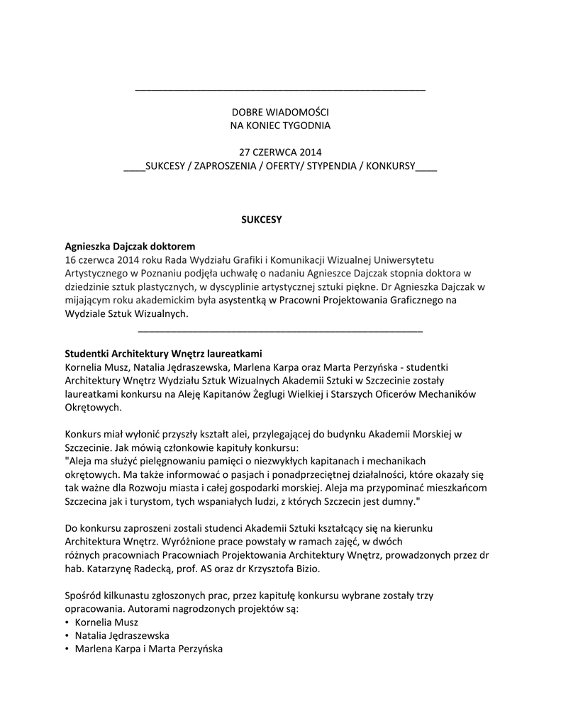 _____________________________________________________ DOBRE WIADOMOŚCI NA KONIEC TYGODNIA 27 CZERWCA 2014 ____SUKCESY / ZAPROSZENIA / OFERTY/ STYPENDIA / KONKURSY____ SUKCESY Agnieszka Dajczak doktorem 16 czerwca 2014 roku Rada Wydziału Grafiki i Komunikacji Wizualnej Uniwersytetu Artystycznego w Poznaniu podjęła uchwałę o nadaniu Agnieszce Dajczak stopnia doktora w dziedzinie sztuk plastycznych, w dyscyplinie artystycznej sztuki piękne. Dr Agnieszka Dajczak w mijającym roku akademickim była asystentką w Pracowni Projektowania Graficznego na Wydziale Sztuk Wizualnych. ____________________________________________________ Studentki Architektury Wnętrz laureatkami Kornelia Musz, Natalia Jędraszewska, Marlena Karpa oraz Marta Perzyńska -‐ studentki Architektury Wnętrz Wydziału Sztuk Wizualnych Akademii Sztuki w Szczecinie zostały laureatkami konkursu na Aleję Kapitanów Żeglugi Wielkiej i Starszych Oficerów Mechaników Okrętowych. Konkurs miał wyłonić przyszły kształt alei, przylegającej do budynku Akademii Morskiej w Szczecinie. Jak mówią członkowie kapituły konkursu: "Aleja ma służyć pielęgnowaniu pamięci o niezwykłych kapitanach i mechanikach okrętowych. Ma także informować o pasjach i ponadprzeciętnej działalności, które okazały się tak ważne dla Rozwoju miasta i całej gospodarki morskiej. Aleja ma przypominać mieszkańcom Szczecina jak i turystom, tych wspaniałych ludzi, z których Szczecin jest dumny." Do konkursu zaproszeni zostali studenci Akademii Sztuki kształcący się na kierunku Architektura Wnętrz. Wyróżnione prace powstały w ramach zajęć, w dwóch różnych pracowniach Pracowniach Projektowania Architektury Wnętrz, prowadzonych przez dr hab. Katarzynę Radecką, prof. AS oraz dr Krzysztofa Bizio. Spośród kilkunastu zgłoszonych prac, przez kapitułę konkursu wybrane zostały trzy opracowania. Autorami nagrodzonych projektów są: • Kornelia Musz • Natalia Jędraszewska • Marlena Karpa i Marta Perzyńska Laureatom oraz prowadzącym serdecznie gratulujemy. Obecnie wyróżnione prace prezentowane są na wystawie w Muzeum Techniki w Szczecinie, przy ulicy Niemierzyńskiej, która trwa do 22 czerwca 2014. Kapituła konkursu zobowiązała się do prezentacji wszystkich prac zgłoszonych do konkursu na trzech różnych wystawach, które w terminie późniejszym, zorganizowane zostaną w Szczecinie. ____________________________________________________ Stypendia Prezydenta Szczecina dla studentek AS Wśród stypendystów Prezydenta Miasta znalazły się studentki Akademii Sztuki w Szczecinie: Teresa Otulak oraz Aleksandra Zielińska – obie studiują Architekturę Wnętrz na Wydziale Sztuk Wizualnych. Stypendia Prezydenta Miasta dla najzdolniejszych studentów i doktorantów otrzymało łącznie 12 osób. Program stypendialny dla najzdolniejszych studentów i doktorantów ma zapobiegać odpływowi najzdolniejszych absolwentów szkół wyższych i naukowców ze Szczecina. O Stypendium Prezydenta może się ubiegać wyłącznie student lub doktorant będący mieszkańcem Szczecina, który w momencie składania wniosku o przyznanie stypendium nie osiągnął wieku 26 lat (dla studenta) oraz lat 30 (dla doktorantów). Laureatami nagród są studenci/doktoranci mogący wykazać się (oprócz odpowiedniej średniej ocen w przypadku studentów) publikacjami książkowymi, artykułami opublikowanymi w czasopismach specjalistycznych, nagrodami i wyróżnieniami w konkursach krajowych i zagranicznych, otrzymaniem grantów badawczych, wystąpieniami na konferencjach, sympozjach, certyfikatami, uzyskanymi patentami, współpracą w preferowanych dziedzinach z przedstawicielem gospodarki (przedsiębiorcą). Program stypendialny dla najzdolniejszych studentów i doktorantów funkcjonuje od października 2010 roku. ____________________________________________________ Studentki AS nagrodzone | REC.enzje Zwyciężczynią II edycji konkursu REC.enzje organizowanego przez Filharmonię im. M. Karłowicza w Szczecinie została Anna Wołowczyk studentka I roku studiów II st. Wydziału Edukacji Muzycznej. II miejsce przypadło Karolinie Kruczyk z I roku studiów I st. Wydziału Instrumentalnego. III miejsce uzyskała również Karolina Kruczyk i Dianna Domagała studentka II roku studiów II st. Wydziału Edukacji Muzycznej. ____________________________________________________ Agnieszka Dajczak nagrodzona Nagrodę Tarasti Prix Lauri za plakat Bird, otrzymała na Lahti Triennale 2014 dr Agnieszka Dajczak, wykładowczyni Wydziału Sztuk Wizualnych. http://www.lahdenmuseot.fi/museot/en/poster-‐museum/lahti-‐poster-‐biennial-‐2011/ Na triennale wpłynęło około 2500 plakatów, z których międzynarodowe jury zakwalifikowało do konkursu 327 prac. Na wystawie wyeksponowane zostaną również prace wykładowców Wydziału Sztuk Wizualnych: dr hab. Lexa Drewinskiego, profesora nadzwyczajnego oraz dr hab. Leszka Żebrowskiego, profesora nadzwyczajnego, a także dr Agnieszki Dajczak i Adama Klasy. link: http://www.postertriennial.fi/pdf/approved.pdf Gratulujemy! ZAPROSZENIA / SZCZECIN Najlepsze dyplomy WSW 2014 czwartek | 3 lipca 2014 | godzina 18.00 | TRAFO Trafostacja Sztuki w Szczecinie Zapraszamy na wernisaż oraz wystawę najlepszych dyplomów licencjackich i magisterskich Wydziału Sztuk Wizualnych Akademii Sztuki Szczecinie. Prezentowane prace postały w roku 2014 na kierunkach grafika oraz architektura wnętrz. Wystawa czynna do 18 lipca. _____________________________________________________ WMiNM | Patrzeć do bólu piątek | 04 lipca 2014 | godzina 18.00| Miejsce 44| Świnoujście Zapraszamy na wystawę „Patrzeć do bólu”, kuratorowaną przez wykładowczynie Hannę Nowicką i Małgorzatę Szymankiewicz, na którą składają się pracę studentów Wydziału Malarstwa i Nowych Mediów. Artyści: Paulina Bieniek, Zuzanna Klein, Amanda Korol, Bożena Mozolewska, Aleksandra Mrozowska, Katarzyna Nawrocka, Andrzej Pater, Francisz