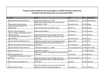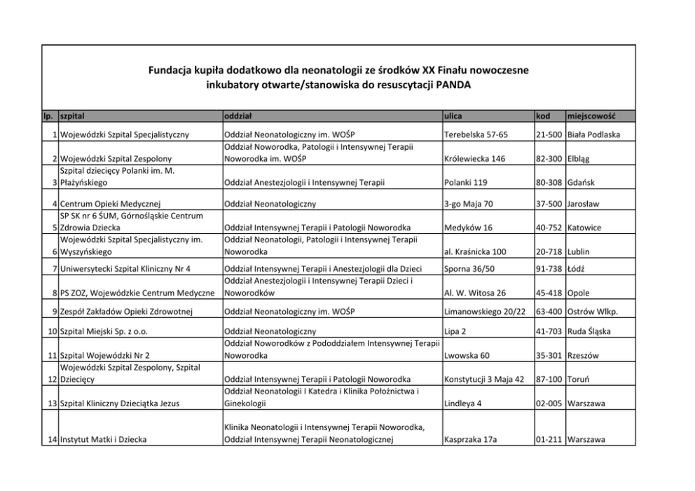 Fundacja kupiła dodatkowo dla neonatologii ze środków XX Finału nowoczesne inkubatory otwarte/stanowiska do resuscytacji PANDA lp. szpital oddział ulica kod Oddział Neonatologiczny im. WOŚP Oddział Noworodka, Patologii i Intensywnej Terapii Noworodka im. WOŚP Terebelska 57-65 21-500 Biała Podlaska Królewiecka 146 82-300 Elbląg Oddział Anestezjologii i Intensywnej Terapii Polanki 119 80-308 Gdańsk 4 Centrum Opieki Medycznej SP SK nr 6 ŚUM, Górnośląskie Centrum 5 Zdrowia Dziecka Wojewódzki Szpital Specjalistyczny im. 6 Wyszyńskiego Oddział Neonatologiczny 3-go Maja 70 37-500 Jarosław Oddział Intensywnej Terapii i Patologii Noworodka Oddział Neonatologii, Patologii i Intensywnej Terapii Noworodka Medyków 16 40-752 Katowice al. Kraśnicka 100 20-718 Lublin 7 Uniwersytecki Szpital Kliniczny Nr 4 Sporna 36/50 91-738 Łódź 8 PS ZOZ, Wojewódzkie Centrum Medyczne Oddział Intensywnej Terapii i Anestezjologii dla Dzieci Oddział Anestezjologii i Intensywnej Terapii Dzieci i Noworodków Al. W. Witosa 26 45-418 Opole 9 Zespół Zakładów Opieki Zdrowotnej Oddział Neonatologiczny im. WOŚP Limanowskiego 20/22 63-400 Ostrów Wlkp. 1 Wojewódzki Szpital Specjalistyczny 2 Wojewódzki Szpital Zespolony Szpital dziecięcy Polanki im. M. 3 Płażyńskiego 10 Szpital Miejski Sp. z o.o. miejscowość Oddział Neonatologiczny Lipa 2 Oddział Noworodków z Pododdziałem Intensywnej Terapii Noworodka Lwowska 60 41-703 Ruda Śląska Konstytucji 3 Maja 42 87-100 Toruń 13 Szpital Kliniczny Dzieciątka Jezus Oddział Intensywnej Terapii i Patologii Noworodka Oddział Neonatologii I Katedra i Klinika Położnictwa i Ginekologii Lindleya 4 02-005 Warszawa 14 Instytut Matki i Dziecka Klinika Neonatologii i Intensywnej Terapii Noworodka, Oddział Intensywnej Terapii Neonatologicznej Kasprzaka 17a 01-211 Warszawa 11 Szpital Wojewódzki Nr 2 Wojewódzki Szpital Zespolony, Szpital 12 Dziecięcy 35-301 Rzeszów Samodzielny Publiczny Szpital Kliniczny im. 15 Orłowskiego Oddział Kliniczny Neonatologii Czerniakowska 231 00-416 Warszawa 16 Szpital Kliniczny im. ks. Anny Mazowieckiej Klinika Neonatologii i Intensywnej Terapii Noworodka Karowa 2 00-315 Warszawa 17 Centrum Medyczne ŻELAZNA Sp. z o.o. Oddział Wczesników i Patologii Noworodka im. WOŚP Żelazna 90 01-004 Warszawa 18 Wojewódzki Szpital Specjalistyczny Oddział Neonatologiczny Oddział Noworodkowy z Pododdziałem Intensywnej Terapii i Patologii Noworodka Kamieńskiego 73a 51-124 Wrocław Zyty 26 05-046 Zielona Góra 19 Szpital Wojewódzki SP ZOZ