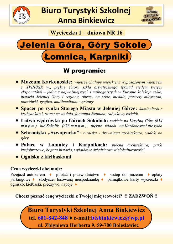 Wycieczka 1 – dniowa NR 16 Jelenia Góra, Góry Sokole Łomnica, Karpniki W programie:  Muzeum Karkonoskie: wnętrze chałupy wiejskiej z wyposażonym wnętrzem z XVIII/XIX w., piękne zbiory szkła artystycznego (ponad siedem tysięcy eksponatów) – jedna z najważniejszych i najbogatszych w Europie kolekcja szkła, historia Jeleniej Góry i regionu, obrazy na szkle, medale, portrety mieszczan, pocztówki, grafika, multimedialne wystawy  Spacer po rynku Starego Miasta w Jeleniej Górze: kamieniczki z krużgankami, ratusz ze studnią, fontanna Neptuna, zabytkowy kościół  Łatwa wędrówka po Górach Sokolich: wejście na Krzyżną Górę (654 m n.p.m.) lub Sokolik (623 m n.p.m.), piękne widoki na Karkonosze i nie tylko  Schronisko „Szwajcarka”: tyrolska - drewniana architektura, widoki na góry  Pałace w Łomnicy i Karpnikach: piękna architektura, krajobrazowe, bogata historia, wyjątkowe dziedzictwo wielokulturowości parki  Ognisko z kiełbaskami Cena wycieczki obejmuje: Przejazd autokarem ♦ pilotaż i przewodnictwo ♦ wstęp do muzeum ♦ opłaty parkingowe ♦ słodycze, losowaną niespodziankę ♦ pamiątkowe karty wycieczki ♦ ognisko, kiełbaski, pieczywo, napoje ♦ Chcesz poznać cenę wycieczki z Twojej miejscowości? !! ZADZWOŃ !! Biuro Turystyki Szkolnej Anna Binkiewicz tel. 601-842-848 ♦ e-mail:[email protected] ul. Zbigniewa Herberta 9, 59-700 Bolesławiec