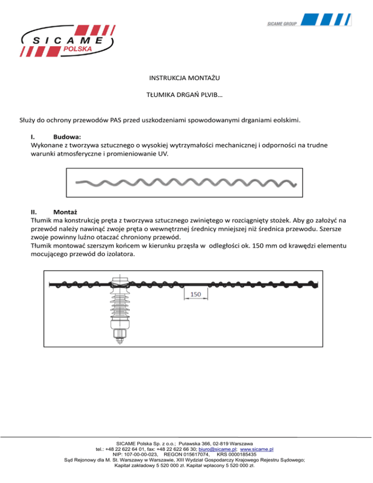 INSTRUKCJA MONTAŻU TŁUMIKA DRGAŃ PLVIB… Służy do ochrony przewodów PAS przed uszkodzeniami spowodowanymi drganiami eolskimi. I. Budowa: Wykonane z tworzywa sztucznego o wysokiej wytrzymałości mechanicznej i odporności na trudne warunki atmosferyczne i promieniowanie UV. II. Montaż Tłumik ma konstrukcję pręta z tworzywa sztucznego zwiniętego w rozciągnięty stożek. Aby go założyć na przewód należy nawinąć zwoje pręta o wewnętrznej średnicy mniejszej niż średnica przewodu. Szersze zwoje powinny luźno otaczać chroniony przewód. Tłumik montować szerszym końcem w kierunku przęsła w odległości ok. 150 mm od krawędzi elementu mocującego przewód do izolatora. SICAME Polska Sp. z o.o.; Puławska 366, 02-819 Warszawa tel.: +48 22 622 64 01, fax: +48 22 622 66 30; [email protected]; www.sicame.pl NIP: 107-00-00-023, REGON 015617074, KRS 0000185435 Sąd Rejonowy dla M. St. Warszawy w Warszawie, XIII Wydział Gospodarczy Krajowego Rejestru Sądowego; Kapitał zakładowy 5 520 000 zł. Kapitał wpłacony 5 520 000 zł.