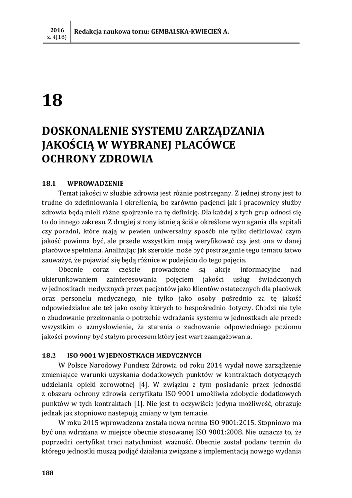 2016 z. 4(16) Redakcja naukowa tomu: GEMBALSKA-KWIECIEŃ A. 18 DOSKONALENIE SYSTEMU ZARZĄDZANIA JAKOŚCIĄ W WYBRANEJ PLACÓWCE OCHRONY ZDROWIA 18.1 WPROWADZENIE Temat jakości w służbie zdrowia jest różnie postrzegany. Z jednej strony jest to trudne do zdefiniowania i określenia, bo zarówno pacjenci jak i pracownicy służby zdrowia będą mieli różne spojrzenie na tę definicję. Dla każdej z tych grup odnosi się to do innego zakresu. Z drugiej strony istnieją ściśle określone wymagania dla szpitali czy poradni, które mają w pewien uniwersalny sposób nie tylko definiować czym jakość powinna być, ale przede wszystkim mają weryfikować czy jest ona w danej placówce spełniana. Analizując jak szerokie może być postrzeganie tego tematu łatwo zauważyć, że pojawiać się będą różnice w podejściu do tego pojęcia. Obecnie coraz częściej prowadzone są akcje informacyjne nad ukierunkowaniem zainteresowania pojęciem jakości usług świadczonych w jednostkach medycznych przez pacjentów jako klientów ostatecznych dla placówek oraz personelu medycznego, nie tylko jako osoby pośrednio za tę jakość odpowiedzialne ale też jako osoby których to bezpośrednio dotyczy. Chodzi nie tyle o zbudowanie przekonania o potrzebie wdrażania systemu w jednostkach ale przede wszystkim o uzmysłowienie, że starania o zachowanie odpowiedniego poziomu jakości powinny być stałym procesem który jest wart zaangażowania. 18.2 ISO 9001 W JEDNOSTKACH MEDYCZNYCH W Polsce Narodowy Fundusz Zdrowia od roku 2014 wydał nowe zarządzenie zmieniające warunki uzyskania dodatkowych punktów w kontraktach dotyczących udzielania opieki zdrowotnej [4]. W związku z tym posiadanie przez jednostki z obszaru ochrony zdrowia certyfikatu ISO 9001 umożliwia zdobycie dodatkowych punktów w tych kontraktach [1]. Nie jest to oczywiście jedyna możliwość, obrazuje jednak jak stopniowo następują zmiany w tym temacie. W roku 2015 wprowadzona została nowa norma ISO 9001:2015. Stopniowo ma być ona wdrażana w miejsce obecnie stosowanej ISO 9001:2008. Nie oznacza to, że poprzedni certyfikat traci natychmiast ważność. Obecnie został podany termin do którego jednostki muszą podjąć działania związane z implementacją nowego wydania 188 SYSTEMY WSPOMAGANIA w INŻYNIERII PRODUKCJI Metody i narzędzia Inżynierii Produkcji dla rozwoju inteligentnych specjalizacji 2016 z. 4(16) normy, a są to 3 lata od wejścia w życie nowego wydania. W przypadku jednostek które są w trakcie certyfikacji lub ich certyfikat straci ważność w okresie zmian mogą być podejmowane działania mające na celu wdrożenie nowego wydania od momentu wejścia w życie nowelizacji. 18.3 ANALIZA BADANIA ANKIETOWEGO W WYBRANEJ PLACÓWCE MEDYCZNEJ – WYNIKI BADAŃ Badania ankietowe zostały przeprowadzone w Szpitalu Wielospecjalistycznym w jednym z większych miast na Śląsku, wśród pracowników na zróżnicowanych stanowiskach pracy oraz bez uwzględniania podziału na istniejące w szpitalu oddziały. W ankiecie brało udział 58 pracowników. Szpital ten posiada wdrożony certyfikat jakości zgodności z ISO 9001:2008. Pierwszą certyfikacje placówka ta przeszła w roku 2003 i od tego czasu stale jest on odnawiany. Rys. 18.1 Podział ankietowanych ze względu na płeć Źródło : Opracowanie własne. Większość z ankietowanych pracowników stanowiły kobiety, tj. 93%. Podział ten przedstawiony jest na rysunku 18.1. Jest to silnie związane ze specyfiką branży. Obecnie nadal większość personelu medycznego stanowią kobiety. Ze względu na specyfikę badanej jednostki medycznej wiele z oddziałów jest zdominowanych przez pracowników płci żeńskiej, co potwierdzają badania przeprowadzone przez biuletyn statystyczny Ministerstwa Zdrowia [3]. Tabela 18.1 ilustruje jakie różnice są w zatrudnieniu na określonych stanowiskach w ochronie zdrowia w Polsce i województwie śląskim. Dane zostały zawężone do trzech zawodów. Tabela 18.1 Zatrudnienie w służbie zdrowia Lekarze Pielęgniarki Położne Polska Razem 141390 282472 35468 W tym kobiety 81646 277295 35403 Województwo Śląskie Razem 17100 37606 4400 W tym kobiety 9955 37221 4397 Źródło: Opracowanie własne na podstawie danych GUS [2]. 189 2016 z. 4(16) Redakcja naukowa tomu: GEMBALSKA-KWIECIEŃ A. Na potrzeby prowadzonych badań ostały przyjęte trzy rodzaje stanowisk pracy, tj. lekarz, pielęgniarka i pracownik administracyjny. Pozwoliło to na uniknięcie zbytniego rozdrobnienia pomimo dużej jednostki szpitalnej. Prawie połowę ankietowanych stanowiły pielęgniarki, tj. 48%. W grupie tej znalazły się także położne. Ilość przeprowadzonych ankiet wśród lekarzy i pracowników administracyjnych w danej jednostce rozłożyła się dość równomiernie. Dokładny podział przedstawia rysunek 18.2. Rys. 18.2 Podział ankietowanych ze względu na stanowiska pracy Źródło: Opracowanie własne. Analizując okres zatrudnienia zdecydowana większość pracowników ma długi staż pracy w danej jednostce, tj. powyżej 9 lat pracy zadeklarowało 62% osób. W kolejnych grupach ilość osób ankietowanych rozłożyła się podobnie, co zostało zobrazowane na rysunku 18.3. Rys. 18.3 Podział ankietowanych ze względu na okres zatrudnienia w danej jednostce Źródło: Opracowanie własne. Największą grupę wśród badanych stanowili pracownicy od 41 roku życia, dokładnie 67% badanych. Biorąc pod uwagę wcześniejszy wykres, rysunek 3 powiązany z okresem zatrudnienia, można zauważyć, że są to osoby mające długi staż pracy w jednej jednostce. Dzięki temu mają świadomość jakie z biegiem czasu następowały w niej zmiany. Ma to niestety także drugą stronę, ponieważ jest to 190 SYSTEMY WSPOMAGANIA w INŻYNIERII PRODUKCJI Metody i narzędzia Inżynierii Produkcji dla rozwoju inteligentnych specjalizacji 2016 z. 4(16) zwykle grupa pracowników którą najtrudniej przekonać do wprowadzania zmian w zakresie czy 