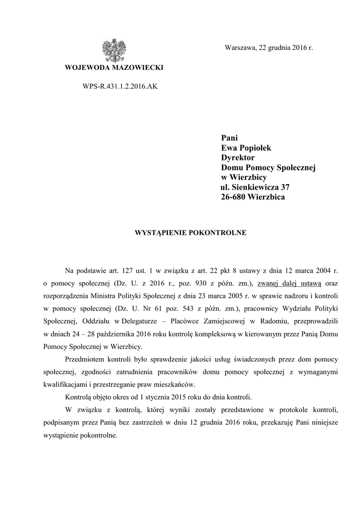 Warszawa, 22 grudnia 2016 r. WOJEWODA MAZOWIECKI WPS-R.431.1.2.2016.AK Pani Ewa Popiołek Dyrektor Domu Pomocy Społecznej w Wierzbicy ul. Sienkiewicza 37 26-680 Wierzbica WYSTĄPIENIE POKONTROLNE Na podstawie art. 127 ust. 1 w związku z art. 22 pkt 8 ustawy z dnia 12 marca 2004 r. o pomocy społecznej (Dz. U. z 2016 r., poz. 930 z późn. zm.), zwanej dalej ustawą oraz rozporządzenia Ministra Polityki Społecznej z dnia 23 marca 2005 r. w sprawie nadzoru i kontroli w pomocy społecznej (Dz. U. Nr 61 poz. 543 z późn. zm.), pracownicy Wydziału Polityki Społecznej, Oddziału w Delegaturze – Placówce Zamiejscowej w Radomiu, przeprowadzili w dniach 24 – 28 października 2016 roku kontrolę kompleksową w kierowanym przez Panią Domu Pomocy Społecznej w Wierzbicy. Przedmiotem kontroli było sprawdzenie jakości usług świadczonych przez dom pomocy społecznej, zgodności zatrudnienia pracowników domu pomocy społecznej z wymaganymi kwalifikacjami i przestrzeganie praw mieszkańców. Kontrolą objęto okres od 1 stycznia 2015 roku do dnia kontroli. W związku z kontrolą, której wyniki zostały przedstawione w protokole kontroli, podpisanym przez Panią bez zastrzeżeń w dniu 12 grudnia 2016 roku, przekazuję Pani niniejsze wystąpienie pokontrolne. Dom Pomocy Społecznej w Wierzbicy jest publiczną placówką, przeznaczoną dla dzieci i młodzieży niepełnosprawnych intelektualnie (88 miejsc) oraz osób przewlekle somatycznie chorych (38 miejsc). Jednostka posiada Statut oraz Regulamin Organizacyjny. Organem prowadzącym placówkę jest Powiat Radomski, który Decyzją Wojewody Mazowieckiego nr 26/2010 z dnia 27 grudnia 2010 r. uzyskał zezwolenie na prowadzenie Domu Pomocy Społecznej w Wierzbicy dla dzieci i młodzieży niepełnosprawnych intelektualnie oraz osób przewlekle somatycznie chorych na czas nieokreślony. Ponadto, Wydział Polityki Społecznej Mazowieckiego Urzędu Wojewódzkiego pismem znak WPS-II.9423.1.7.2014.AB z dnia 22 maja 2014 r. wyraził zgodę na rozszerzenie zakresu świadczonych usług w postaci wyodrębnienia części budynku dla osób przewlekle somatycznie chorych na rzecz osób z chorobą Alzheimera. W dniu kontroli w Domu przebywało łącznie 120 mieszkańców, w tym 88 o różnym stopniu niepełnosprawności intelektualnej (z tego 10 nieletnich) oraz 32 przewlekle somatycznie chorych. Ubezwłasnowolnionych całkowicie i z ustanowionym opiekunem prawnym było 35 mieszkańców niepełnosprawnych intelektualnie i 3 osoby przewlekle somatycznie chore. Wobec jednej osoby toczyło się postępowanie o ubezwłasnowolnienie. Większość pozostałych mieszkańców z niepełnosprawnością intelektualną oraz 3 osoby somatycznie chore miało ustanowionego kuratora. Pracownicy kontrolowanej jednostki w większości przypadków byli ustanowieni opiekunami prawnymi/kuratorami mieszkańców. Działalność jednostki prowadzona była w pozbawionych barier architektonicznych dwóch oddzielnych budynkach oddalonych od siebie około jednego kilometra, tj. usytuowanych przy ul. Sienkiewicza 37 oraz przy ul. Partyzantów 3. W obydwu budynkach wydzielone zostały pomieszczenia użyteczności wspólnej. Spełniono wymagania w zakresie wyposażenia w instalację przyzywowo – alarmową i system alarmowo – przeciwpożarowy oraz warunków sanitarnych. Z ustaleń kontroli wynika, że pod względem powierzchni i liczby zamieszkujących je osób, jeden z pokoi znajdujących się w budynku przy ul. Sienkiewicza 37 nie spełniał standardów określonych w § 6 ust. 1 pkt 3 rozporządzenia Ministra Pracy i Polityki Społecznej z dnia 23 sierpnia 2012 r. w sprawie domów pomocy społecznej (Dz. U. z 2012 poz. 964), na podstawie którego w wieloosobowym pokoju powinno przypadać na osobę nie mniej niż 6 m2 i w czteroosobowym pokoju mieszkalnym mogą przebywać wyłącznie osoby leżące. W okresie objętym kontrolą Dom zapewniał usługi opiekuńcze oraz wspomagające, a dzieciom i młodzieży pobieranie nauki oraz udział w zajęciach rewalidacyjno – wychowawczych. Personel udzielał mieszkańcom pomocy w podstawowych czynnościach życiowych, pielęgnacyjnych, a także w załatwianiu spraw osobistych. Zapewniano korzystanie z terapii zajęciowej, a także dostęp do podstawowych i specjalistycznych świadczeń zdrowotnych. Na 2 potrzeby mieszkańców w Domu zatrudniono psychologa w wymiarze ½ etatu. Umożliwiono zaspokajanie potrzeb kulturalnych i religijnych oraz kontakt z rodzinami i osobami bliskimi, jak również społecznością lokalną. Stworzono warunki do rozwoju samorządności mieszkańców. Zajęcia rehabilitacji społecznej, o których mowa w rozporządzenia Ministra Pracy i Polityki Społecznej z dnia 27 lutego 2014 r. w sprawie rehabilitacji społecznej w domach pomocy społecznej dla osób z zaburzeniami psychicznymi (Dz.U. poz. 250), prowadzone były na terenie budynku przeznaczonego dla dzieci i młodzieży niepełnosprawnych intelektualnie. W Domu powołano zespół terapeutyczno-opiekuńczy, który zgodnie z Zarządzeniem Nr 19/2009 z dnia 31 grudnia 2009 r. Dyrektora Domu Pomocy Społecznej w Wierzbicy w sprawie powołania zespołu terapeutyczno – opiekuńczego winien spotykać się przynajmniej raz na kwartał w celu określenia potrzeb zdrowotnych, bytowych i socjalnych podopiecznych oraz opracowania wytycznych do pracy w zakresie indywidualnej opieki. Z każdego spotkania zespołu sporządzano protokół określający skład zespołu oraz dane osób, których posiedzenie dotyczyło. Kontrola wykazała jednak, że w II kwartale 2015 r. oraz II kwartale 2016 r. posiedzenia zespołu nie odbywały się, co jest niezgodne z zapisami ww. zarządzenia. Ponadto, w jednym przypadku nie zamieszczono pełnej daty posiedzenia, a jedynie miesiąc i rok (I.2016r.). Wszystkie protokoły były odręcznie spisywane, jednakże tylko protokoły zespołu z ul. Partyzantów były czytelne. Protokoły zespołu z ul. Sienkiewicza były sporządzane przez psyc