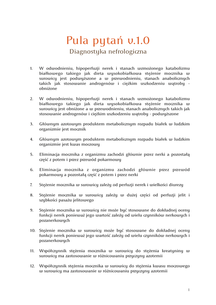 Pula pytań v.1.0 Diagnostyka nefrologiczna 1. W odwodnieniu, hipoperfuzji nerek i stanach wzmożonego katabolizmu białkowego takiego jak dieta wysokobiałkowa stężenie mocznika w surowicy jest podwyższone a w przewodnieniu, stanach anabolicznych takich jak stosowanie androgenów i ciężkim uszkodzeniu wątroby obniżone 2. W odwodnieniu, hipoperfuzji nerek i stanach wzmożonego katabolizmu białkowego takiego jak dieta wysokobiałkowa stężenie mocznika w surowicy jest obniżone a w przewodnieniu, stanach anabolicznych takich jak stosowanie androgenów i ciężkim uszkodzeniu wątroby - podwyższone 3. Głównym azotowym produktem metabolicznym rozpadu białek w ludzkim organizmie jest mocznik 4. Głównym azotowym produktem metabolicznym rozpadu białek w ludzkim organizmie jest kwas moczowy 5. Eliminacja mocznika z organizmu zachodzi głównie przez nerki a pozostałą część z potem i przez przewód pokarmowy 6. Eliminacja mocznika z organizmu zachodzi głównie przez przewód pokarmowy a pozostałą część z potem i przez nerki 7. Stężenie mocznika w surowicy zależy od perfuzji nerek i wielkości diurezy 8. Stężenie mocznika w surowicy zależy w dużej części od perfuzji jelit i szybkości pasażu jelitowego 9. Stężenie mocznika w surowicy nie może być stosowane do dokładnej oceny funkcji nerek ponieważ jego wartość zależy od wielu czynników nerkowych i pozanerkowych 10. Stężenie mocznika w surowicy może być stosowane do dokładnej oceny funkcji nerek ponieważ jego wartość zależy od wielu czynników nerkowych i pozanerkowych 11. Współczynnik stężenia mocznika w surowicy do stężenia kreatyniny w surowicy ma zastosowanie w różnicowaniu przyczyny azotemii 12. Współczynnik stężenia mocznika w surowicy do stężenia kwasu moczowego w surowicy ma zastosowanie w różnicowaniu przyczyny azotemii !1 13. Do wskazań oznaczenia stężenia mocznika w surowicy należy: różnicowanie przednerkowej i pozanerkowej azotemii, nasilenie toksemii mocznicowej u chorych z terminalną niewydolnością nerek i u chorych dializowanych w celu oceny stanu metabolicznego i nasilenie katabolizmu białkowego 14. Do wskazań oznaczenia stężenia mocznika w surowicy nie należą: różnicowanie przednerkowej i pozanerkowej azotemii, wykrywanie dny moczanowej, ocena stanu metabolicznego i nasilenie katabolizmu białkowego u osób dializowanych 15. Stężenie kreatyniny w surowicy zależy od całkowitej masy mięśniowej, płci a także ilości mięsa w diecie jednak jej stężenie jest wartością stosunkowo niezmienną 16. Stężenie kreatyniny w surowicy zależy od całkowitej masy mięśniowej, płci a także ilości mięsa w diecie jednak jej stężenie jest wartością silnie zmienną 17. Kreatynina jest wydzielana z organizmu tylko przez nerki więc ma zastosowanie w diagnostyce laboratoryjnej chorób nerek 18. Kreatynina jest wydzielana z organizmu przez nerki i przewód pokarmowy więc ma małe zastosowanie w diagnostyce laboratoryjnej chorób nerek 19. Do znamiennego podwyższenia stężenia kreatyniny w osoczu dochodzi dopiero gdy znaczna część nefronów zostaje uszkodzona i GFR obniży się do wartości około połowy wartości prawidłowej 20. Do znamiennego podwyższenia stężenia kreatyniny w osoczu dochodzi wraz z pierwszym uszkodzeniem nefronów i obniżeniem GFR 21. Kreatynina ma duże znaczenie w diagnostyce chorób nerek podczas gdy kreatyna nie znalazła zastosowania w diagnostyce chorób nerek 22. Kreatyna ma duże znaczenie w diagnostyce chorób nerek podczas gdy kreatynina ma mało zastosowań w diagnostyce chorób nerek 23. Obniżona wartość współczynnika mocznik/kreatynina przy prawidłowym stężeniu kreatyniny w surowicy może świadczyć o stanie obniżonego katabolizmu białkowego (głodzenie, dieta niskobiałkowa, ciężkie choroby wątroby) albo o ostrej martwicy cewek nerkowych 24. Obniżona wartość współczynnika mocznik/kreatynina przy prawidłowym stężeniu kreatyniny w surowicy spowodowana jest przednerkową azotemią i może świadczyć o stanach katabolicznych (dieta wysokobiałkowa, oparzenia, gorączki, steroidoterapia) albo o hipoperfuzji nerek 25. Po d w y żs zo na w a rt o ść w sp ó ł cz y n n i k a m o cz n i k / k r e a t y n i na p rz y prawidłowym stężeniu kreatyniny w surowicy spowodowana jest przednerkową azotemią i może świadczyć o stanach katabolicznych (dieta !2 wysokobiałkowa, oparzenia, gorączki, steroidoterapia) albo o hipoperfuzji nerek 26. Po d w y żs zo na w a rt o ść w sp ó ł cz y n n i k a m o cz n i k / k r e a t y n i na p rz y prawidłowym stężeniu kreatyniny w surowicy może świadczyć o stanie obniżonego katabolizmu białkowego (głodzenie, dieta niskobiałkowa, ciężkie choroby wątroby) albo o ostrej martwicy cewek nerkowych 27. Po d w y żs zo na w a rt o ść w sp ó ł cz y n n i k a m o cz n i k / k r e a t y n i na p rz y podwyższonym stężeniu kreatyniny w surowicy spowodowane jest pozanerkową azotemią np. obstrukcją dróg moczowych 28. Po d w y żs zo na w a rt o ść w sp ó ł cz y n n i k a m o cz n i k / k r e a t y n i na p rz y podwyższonym stężeniu kreatyniny w surowicy spowodowane jest przednerkową azotemią i może świadczyć o stanach katabolicznych (dieta wysokobiałkowa, oparzenia, gorączki, steroidoterapia) albo o hipoperfuzji nerek 29. Kwas moczowy jest produktem degradacji puryn eliminowanym głównie przez nerki a mniej przez przewód pokarmowy 30. Kwas moczowy jest produktem degradacji puryn eliminowanym głównie przez przewód pokarmowy a mniej przez nerki 31. Kwas moczowy w surowicy może być pomocy w monitorowaniu funkcji nerek jednak jego stężenie jest zależne od intensywności degradacji puryn i jego nieprawidłowe ilości występują w wielu stanach patologicznych niezwiązanych z patologią nerek 32. Kwas moczowy w surowicy jest głównym parametrem monitorowania funkcji nerek ponieważ jego stężenie nie zależy od 