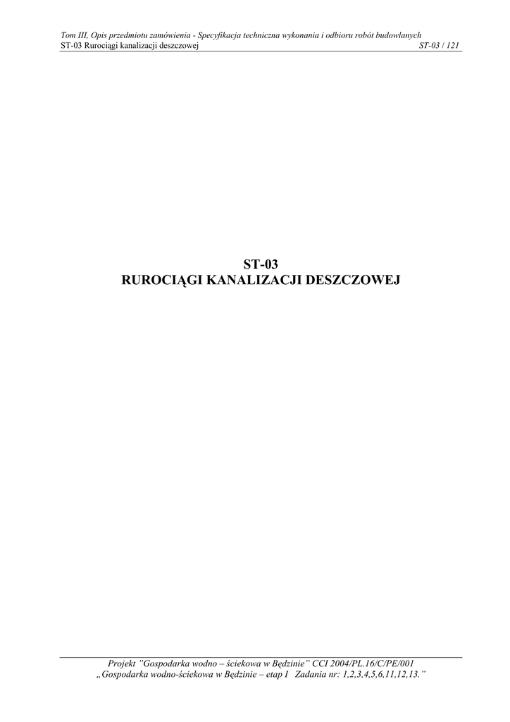 Tom III, Opis przedmiotu zamówienia - Specyfikacja techniczna wykonania i odbioru robót budowlanych ST-03 Rurociągi kanalizacji deszczowej ST-03 / 121 ST-03 RUROCIĄGI KANALIZACJI DESZCZOWEJ Projekt ”Gospodarka wodno – ściekowa w Będzinie” CCI 2004/PL.16/C/PE/001 „Gospodarka wodno-ściekowa w Będzinie – etap I Zadania nr: 1,2,3,4,5,6,11,12,13.” Tom III, Opis przedmiotu zamówienia - Specyfikacja techniczna wykonania i odbioru robót budowlanych ST-03 Rurociągi kanalizacji deszczowej ST-03 / 122 SPIS TREŚCI 1. WPROWADZENIE ..................................................................................................123 1.1. 1.2. 1.3. 1.4. Przedmiot specyfikacji ...................................................................................................................... 123 Przedmiot i zakres robot................................................................................................................... 123 Nazwy i kody WSZ dla przewidzianych robót h ............................................................................... 123 Określenia podstawowe ................................................................................................................... 123 2. WYMAGANIA DOTYCZĄCE WŁAŚCIWOŚCI MATERIAŁÓW I URZĄDZEŃ ......123 2.1. Wymagania ogólne............................................................................................................................ 123 2.2. Wymagania szczegółowe.................................................................................................................. 124 2.2.1 Materiały.......................................................................................................................................124 2.2.2 Transport......................................................................................................................................127 2.2.3 Składowanie.................................................................................................................................128 3. SPRZĘT I MASZYNY BUDOWLANE .....................................................................129 4. ŚRODKI TRANSPORTU.........................................................................................129 5. WYMAGANIA DOTYCZĄCE ROBÓT.....................................................................129 5.1. Ogólne zasady wykonywania robót................................................................................................... 129 5.2. Szczegółowe warunki wykonania robót............................................................................................. 129 5.2.1.Prace przygotowawcze i roboty ziemne ......................................................................................130 5.2.2.Zabezpieczenie drzew .................................................................................................................130 5.2.3.Wykonanie podłoża......................................................................................................................130 5.2.4.Ułożenie kanalizacji deszczowej..................................................................................................130 5.2.5. Kolizje z uzbrojeniem .................................................................................................................141 5.2.5.Obiekty na sieci............................................................................................................................144 5.2.6.Przejścia pod drogami i przeszkodami terenowymi.....................................................................144 5.2.7.Przejścia przewodów przez przegrody budowlane......................................................................144 5.2.8.Obsypka, zasypka przewodów ....................................................................................................144 5.2.9.Odtworzenie nawierzchni dróg.....................................................................................................145 6. KONTROLA JAKOŚCI ROBÓT ............................................................................145 6.1. Wymagania ogólne...................................................................................................................... 145 6.2. Wymagania szczegółowe............................................................................................................ 145 6.2.1.Materiały.......................................................................................................................................145 6.2.2.Kontrola jakości wykonanych robót..............................................................................................145 7. OBMIAR ROBÓT ...................................................................................................146 7.1. Ogólne zasady obmiaru Robót......................................................................................................... 146 7.1.1. Jednostki i zasady obmiaru robót ...............................................................................................146 7.1.2. Jednostki i zasady obmiaru robót podstawowych.......................................................................146 8. ODBIÓR ROBÓT ...................................................................................................147 8.1. Odbiór robót zanikających i ulegających zakryciu............................................................................ 147 8.2. Odbiór techniczny częściowy ............................................................................................................ 147 8.3. Odbiór techniczny końcowy............................................................................................................... 147 9. ROZLICZENIE ROBÓT..........................................................................................148 9.1. Ustalenia ogólne..........................