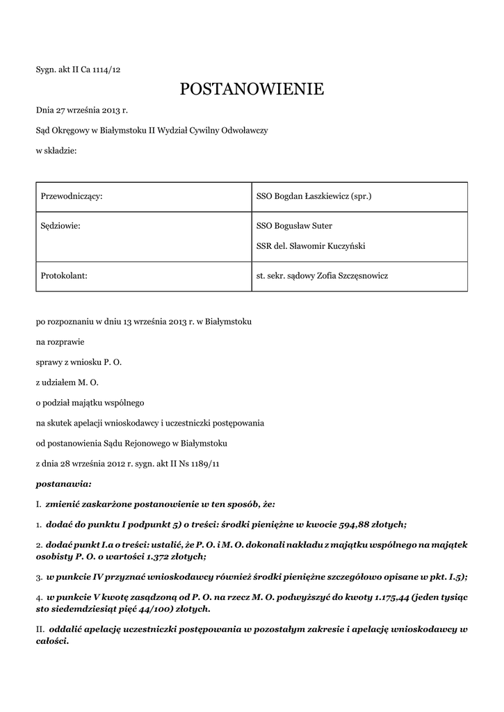 Sygn. akt II Ca 1114/12 POSTANOWIENIE Dnia 27 września 2013 r. Sąd Okręgowy w Białymstoku II Wydział Cywilny Odwoławczy w składzie: Przewodniczący: SSO Bogdan Łaszkiewicz (spr.) Sędziowie: SSO Bogusław Suter SSR del. Sławomir Kuczyński Protokolant: st. sekr. sądowy Zofia Szczęsnowicz po rozpoznaniu w dniu 13 września 2013 r. w Białymstoku na rozprawie sprawy z wniosku P. O. z udziałem M. O. o podział majątku wspólnego na skutek apelacji wnioskodawcy i uczestniczki postępowania od postanowienia Sądu Rejonowego w Białymstoku z dnia 28 września 2012 r. sygn. akt II Ns 1189/11 postanawia: I. zmienić zaskarżone postanowienie w ten sposób, że: 1. dodać do punktu I podpunkt 5) o treści: środki pieniężne w kwocie 594,88 złotych; 2. dodać punkt I.a o treści: ustalić, że P. O. i M. O. dokonali nakładu z majątku wspólnego na majątek osobisty P. O. o wartości 1.372 złotych; 3. w punkcie IV przyznać wnioskodawcy również środki pieniężne szczegółowo opisane w pkt. I.5); 4. w punkcie V kwotę zasądzoną od P. O. na rzecz M. O. podwyższyć do kwoty 1.175,44 (jeden tysiąc sto siedemdziesiąt pięć 44/100) złotych. II. oddalić apelację uczestniczki postępowania w pozostałym zakresie i apelację wnioskodawcy w całości. III. nakazać ściągnąć od wnioskodawcy i uczestniczki postępowania na rzecz Skarbu Państwa (Sądu Okręgowego w Białymstoku) kwoty po 792,67 złotych tytułem nieuiszczonych kosztów sądowych. IV. stwierdzić, że zainteresowani ponoszą we własnym zakresie pozostałe koszty postępowania odwoławczego związane ze swoim udziałem w sprawie. UZASADNIENIE Zaskarżonym postanowieniem Sąd Rejonowy w Białymstoku w pkt I ustalił, że w skład majątku wspólnego M. O. i P. O. wchodzi: 1) nieruchomość zabudowana położona w B. przy ulicy (...), o powierzchni 0,0543 ha, o numerze geodezyjnym (...), dla której to nieruchomości w Sądzie Rejonowym w IX Wydziale Ksiąg Wieczystych w B., prowadzona jest księga wieczysta nr (...), o wartości 341.000 zł., 2) nieruchomość niezabudowana położona w B. przy ulicy (...), o powierzchni 0,1476 ha, o numerze geodezyjnym (...), dla której to nieruchomości w Sądzie Rejonowym w IX Wydziale Ksiąg Wieczystych w B., prowadzona jest księga wieczysta nr (...), o wartości 279.000 zł., 3) ruchomości o łącznej wartości 6.990 zł., w postaci: a) łóżko z szufladami, b) krzesło bujane – konstrukcja kratowa, c) łóżko piętrowe dzieci, d) szafka wąska - regał pod rtv, e) komputer D., f) telewizor S., g) dvd, h) ozdoba – słoń z gipsu, i) stół pokojowy rozkładany, j) krzesła 4 szt., k) odkurzacz 2200 W, l) dzwonek z mosiądzu, ł) rowery 2 szt. z przyczepą, m) choinka z ozdobami, n) gramofon, o) pościel, ó) poduszki 2 szt. p) rakiety tenisowe 2 szt., r) walizki 2 szt., s) boxy skóropodobne, t) stół i 6 szt. krzeseł drewnianych, - szczegółowo opisanych w opinii biegłego z zakresu szacowania ruchomości J. B. z dnia 14.03.2012 r. (k. 148-190 akt), która to opinia stanowi integralną część niniejszego orzeczenia, 4) kwota70.560 zł., stanowiąca równowartość sprzedanego samochodu osobowego marki B. (...) T. z 2005 r., W pozostałym zakresie wniosek oddalił (pkt II). Ustalił, że P. O. poniósł z majątku osobistego na majątek wspólny wydatek w wysokości 1.186 zł (pkt III). W pkt IV Sąd Rejonowy dokonał podziału majątku wspólnego M. O. i P. O. w ten sposób, że : 1) przyznał wnioskodawcy P. O., synowi J. i J., własność nieruchomości niezabudowanej położonej w B. przy ulicy (...), szczegółowo opisanej w pkt. I.2) orzeczenia i prawo do kwoty 70.560 zł. szczegółowo opisanej w pkt. I.4) orzeczenia, 2) przyznał uczestniczce M. O., córce Z. i D. H. (1), własność nieruchomości zabudowanej położonej w B. przy ulicy (...), szczegółowo opisanej w pkt. I.1) orzeczenia i własność ruchomości szczegółowo opisanych w pkt. I.3) orzeczenia; Tytułem spłaty zasądził od P. O. na rzecz M. O. kwotę 192 zł. (sto dziewięćdziesiąt dwa złote) płatną w terminie 7 (siedmiu) dni od daty uprawomocnienia się orzeczenia, z ustawowymi odsetkami w wysokości 13 % w stosunku rocznym, na wypadek uchybienia w terminie płatności (pkt V). Nakazał pobrać od uczestniczki M. O. na rzecz Skarbu Państwa, tytułem brakujących kosztów sądowych tymczasowo wydatkowanych z sum Skarbu Państwa, kwotę 645,20 zł. (sześćset czterdzieści pięć złotych dwadzieścia groszy) (pkt VI). Zasądził od M. O. na rzecz P. O. kwotę 1.177,40 zł. (jeden tysiąc sto siedemdziesiąt siedem złotych czterdzieści groszy) tytułem zwrotu kosztów postępowania (pkt VII). Stwierdził, iż zainteresowani w pozostałym, zakresie ponoszą koszty postępowania związane ze swoim udziałem w sprawie (pkt VIII). Z ustaleń poczynionych przez Sąd I instancji wynika, że M. O. z domu H. i P. O. zawarli związek małżeński 22 stycznia 2002 r. w Urzędzie Stanu Cywilnego w S., zapisany w księdze małżeństw pod numerem (...). Związek małżeński został rozwiązany 19 listopada 2010 r. przez Główny Urząd Wydziału Rodzinnego Najwyższego Sądu Orzecznictwa Zjednoczonego Królestwa Wielkiej Brytanii. Orzeczenie uprawomocniło się dnia 26 stycznia 2011 r. Strony posiadają dwóch synów: K. 11 lat i K. 5 lat. W trakcie trwania małżeństwa strony obowiązywała małżeńska wspólność ustawowa. Po zawarciu związku małżeńskiego małżonkowie zamieszkali w L., gdzie jeszcze przed ślubem razem mieszkali i pracowali. Sąd I instancji wskazał, że w trakcie trwania wspólności małżeńskiej wnioskodawca i uczestniczka nabyli nieruchomość niezabudowaną położoną w B. przy ulicy (...), o powierzchni 0,1476 ha, o numerze geodezyjnym (...), dla której w Sądzie Rejonowym w IX Wydziale Ksiąg Wieczystych w B. prowadzona jest księga wieczysta nr (...). Następnie nabyli nieruchomość zabudowaną położoną w B. przy ulicy (...), o powierzchni 
