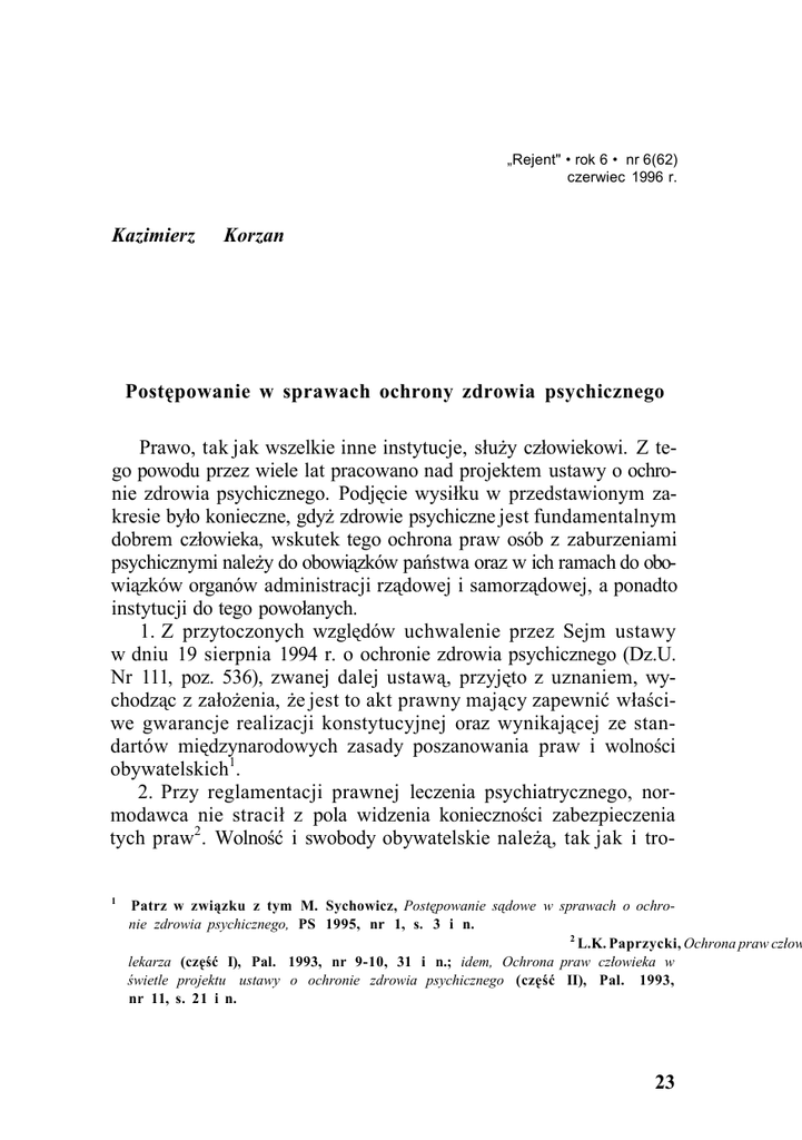 „Rejent" • rok 6 • nr 6(62) czerwiec 1996 r. Kazimierz Korzan Postępowanie w sprawach ochrony zdrowia psychicznego Prawo, tak jak wszelkie inne instytucje, służy człowiekowi. Z tego powodu przez wiele lat pracowano nad projektem ustawy o ochronie zdrowia psychicznego. Podjęcie wysiłku w przedstawionym zakresie było konieczne, gdyż zdrowie psychiczne jest fundamentalnym dobrem człowieka, wskutek tego ochrona praw osób z zaburzeniami psychicznymi należy do obowiązków państwa oraz w ich ramach do obowiązków organów administracji rządowej i samorządowej, a ponadto instytucji do tego powołanych. 1. Z przytoczonych względów uchwalenie przez Sejm ustawy w dniu 19 sierpnia 1994 r. o ochronie zdrowia psychicznego (Dz.U. Nr 111, poz. 536), zwanej dalej ustawą, przyjęto z uznaniem, wychodząc z założenia, że jest to akt prawny mający zapewnić właściwe gwarancje realizacji konstytucyjnej oraz wynikającej ze standartów międzynarodowych zasady poszanowania praw i wolności obywatelskich1. 2. Przy reglamentacji prawnej leczenia psychiatrycznego, normodawca nie stracił z pola widzenia konieczności zabezpieczenia tych praw2. Wolność i swobody obywatelskie należą, tak jak i tro1 Patrz w związku z tym M. Sychowicz, Postępowanie sądowe w sprawach o ochronie zdrowia psychicznego, PS 1995, nr 1, s. 3 i n. 2 L.K. Paprzycki, Ochrona praw człow lekarza (część I), Pal. 1993, nr 9-10, 31 i n.; idem, Ochrona praw człowieka w świetle projektu ustawy o ochronie zdrowia psychicznego (część II), Pal. 1993, nr 11, s. 21 i n. 23 Kazimier•z Korzan ska o zdrowie psychiczne człowieka, do rzędu najwyższych wartości. 3. Leżąca u podstaw założeń legislacyjnych ochrona wspomnianych wartości winna być przyjęta przez sądy jako dyrektywa interpretacyjna przepisów omawianej ustawy przy podejmowaniu decyzji w sprawach dotyczących przymusowego leczenia osób chorych lub umieszczenia ich w domach pomocy społecznej. Trzeba też mieć na uwadze, że pod pretekstem troski o zdrowie psychiczne osoby bliskiej, podmiot legitymowany do złożenia wniosku może ukryć dążenie do zagarnięcia i rozdysponowania majątku tej osoby. 4. W celu zabezpieczenia praw osób chorych psychicznie lub upośledzonych, ustawodawca w art. 43 ust. 1 ustawy upoważnił sędziego opiekuńczego wyznaczonego przez prezesa sądu wojewódzkiego do kontroli legalności przyjęcia i przebywania tych osób w szpitalu psychiatrycznym lub domu pomocy społecznej. Dla prawidłowego wykorzystywania w przedstawionym zakresie zadań, sędzia ów ma prawo wstępu do wspomnianych szpitali oraz wymienionych domów o każdej porze. Informacje o potrzebie przeprowadzenia kontroli otrzymuje z różnych źródeł. W szczególności z zawiadomień sądu opiekuńczego przez kierownika szpitala psychiatrycznego o każdorazowym przyjęciu osoby z zaburzeniami psychiatrycznymi (art. 22 pkt 6, art. 23 ust. 4 ustawy). 5. Powołana wyżej ustawa z 19 sierpnia 1994 r. o ochronie zdrowia psychicznego wymaga do przyjęcia osoby z zaburzeniami psychicznymi do szpitala psychiatrycznego wyrażenia przez nią pisemnej zgody, jeżeli lekarz wyznaczony, po jej osobistym zbadaniu, stwierdzi wskazania do przyjęcia. W wypadku osoby małoletniej lub ubezwłasnowolnionej, całkowicie zgodę na przyjęcie do szpitala psychiatrycznego wyraża jej przedstawiciel ustawowy (art. 22 ust. 1 lub 3 ustawy). W sytuacji określonej w art. 18 ustawy, a więc wtedy gdy osoba dotknięta chorobą psychiczną (o czym niżej będzie jeszcze mowa) dopuszcza się zamachu przeciwko życiu lub zdrowiu własnemu, życiu lub zdrowiu innej osoby, zagraża bezpieczeństwu powszechnemu itp. możliwe jest zastosowanie przymusu osobistego, o którego zastosowaniu decyduje lekarz (art. 18 ust. 1 i 2 ustawy). 24 Postępowanie w sprawach ochrony zdrowia psychicznego 6. Pomijając dalsze rozważania na ten temat należy stwierdzić, że poza uzyskanymi wyżej uprawnieniami wyznaczonego przez prezesa sądu wojewódzkiego sędziego wojewódzkiego do kontroli szpitali psychiatrycznych, ustawa przyznała również sądowi opiekuńczemu (o czym niżej) pewne kompetencje do podejmowania ważnych czynności kontrolnych, w formie działalności procesowej. Zakres owej kontroli został określony w wymienionej ustawie, ale w sposób bardzo ogólny. Wskutek tego, zgodnie z treścią art. 42 w sprawach dotyczących ochrony zdrowia psychicznego, stosuje się odpowiednio przepisy kodeksu postępowania cywilnego o postępowaniu nieprocesowym. Specyfika rozpoznawanych przez sąd opiekuńczy spraw uzewnętrzniająca się odmiennością regulacji ustawy sprawia, że postępowanie o ochronę zdrowia psychicznego ma charakter cywilny o szczególnym charakterze. Za takim charakterem wymienionego postępowania przemawia również użyte w cytowanym art. 42 ustawy słowo „odpowiednio". Odpowiednie zaś stosowanie przepisów prawnych z reguły polega na ich stosowaniu z pewnymi modyfikacjami. Nie da się też wykluczyć - co trafnie podkreśla się w literaturze3 - potrzeby stosowania, przy rozpoznawaniu omawianych spraw, przepisów o postępowaniu nieprocesowym wprost oraz przepisów o procesie w wypadkach, w których zachodzi potrzeba ich stosowania poprzez odesłanie przewidziane w art. 13 § 2 k.p.c. 7. Omawiane sprawy rozpoznaje sąd opiekuńczy, którym w rozumieniu art. 568 § 1 k.p.c. jest sąd rejonowy. Właściwym miejscowo do rozpoznania spraw jest albo sąd miejsca siedziby szpitala psychiatrycznego lub domu pomocy społecznej (art. 25, art. 28, art. 36 ust. 3 i art. 44 ustawy) albo sąd miejsca zamieszkania osoby, której postępowanie dotyczy, co w kilku wypadkach również wyraźnie stwierdzają przepisy ustawy, jak art. 22 ust. 5, art. 29 ust. 2, art. 39 ust. 1. Wprawdzie w sprawach określonych w art. 22 ust. 4 i art. 41 przepisy ustawy o właściwości miejscowej w ogóle nie wspominają, ale jest rzeczą oczywistą, że z mocy art. 569 § 1 k.p.c. wła- 3 Por