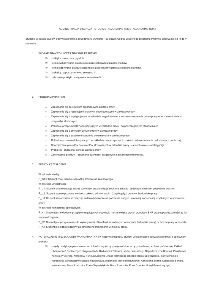 ADMINISTRACJA LICENCJAT STUDIA STACJONARNE I NIESTACJONARNE ROK I Studenci w trakcie studiów odbywają praktykę zawodową w wymiarze 120 godzin według ustalonego programu. Praktykę odbywa się od III do V semestru. 1. WYMIAR PRAKTYKI I CZAS TRWANIA PRAKTYKI • • • • • 2. praktyka trwa cztery tygodnie termin wykonywania praktyki nie może kolidować z planem studiów termin odbywania praktyki student jest zobowiązany ustalić z opiekunem praktyk praktykę rozpoczyna się od semestru III zaliczenie praktyki następuje w semestrze V PROGRAM PRAKTYKI • Zapoznanie się ze strukturą organizacyjną zakładu pracy. • Zapoznanie się z regulacjami prawnymi obowiązującymi w zakładzie pracy. • Zapoznanie się z występującymi w zakładzie zagadnieniami z zakresu stosowania prawa pracy oraz – ewentualnie – • Poznanie przepisów BHP obowiązujących w zakładzie pracy i na poszczególnych stanowiskach. • Zapoznanie się z obiegiem dokumentacji w zakładzie pracy. • Zapoznanie się z zasadami tworzenia dokumentacji w zakładzie pracy. • Dokładne poznanie dokonywanych w zakładzie pracy czynności z zakresu administrowania i administracji publicznej. • Sporządzanie projektów dokumentów stosowanych w zakładzie pracy i – ewentualnie – rozstrzygnięć. • Próba roli i znaczeniu danego zakładu pracy. • Zakończenie praktyki – dokonanie czynności związanych z zakończeniem praktyki. pragmatyk służbowych. 3. EFEKTY KSZTAŁCENIA: W zakresie wiedzy: P_W01: Student zna i rozumie specyfikę środowiska zawodowego. W zakresie umiejętności: P_U1: Student charakteryzuje zakres czynności oraz analizuje strukturę zakładu będącego miejscem odbywania praktyki P_U2: Student stosuje poznaną wiedzę z zakresu administracji i różnych gałęzi prawa w środowisku pracy P_U3: Student samodzielnie rozwiązuje zadania badawcze na podstawie danych, informacji i obserwacji uzyskanych w środowisku pracy W zakresie kompetencji społecznych: P_K1: Student jest świadomy przepisów regulujących obowiązki na stanowisku pracy i przepisów BHP oraz odpowiedzialności za ich nieprzestrzeganie P_K2: Student jest przygotowany do wykonywania różnych ról zawodowych w instytucji (zakładzie pracy), w tym do pracy w zespole P_K3: Student jest odpowiedzialny za powierzone mu zadania w miejscu pracy. 4. POTENCJALNE MIEJSCA ODBYWANIA PRAKTYK ( w każdym przypadku student ustala miejsce odbywania praktyki z opiekunem praktyk) • urzędy i instytucje państwowe oraz ich oddziały (urzędy wojewódzkie, urzędy skarbowe, archiwa państwowe, Zakład Ubezpieczeń Społecznych, Krajowa Rada Radiofonii i Telewizji, sądy i prokuratury, Najwyższa Izba Kontroli, Państwowa Komisja Wyborcza, Narodowy Fundusz Zdrowia , Kasa Rolniczego Ubezpieczenia Społecznego, Instytut Pamięci Narodowej, samorządowe kolegia odwoławcze, regionalne izby obrachunkowe, Kancelaria Sejmu, Kancelaria Senatu, ministerstwa, Biuro Rzecznika Praw Obywatelskich, Biuro Rzecznika Praw Dziecka, Urząd Patentowy itp.) • państwowe osoby prawne (Narodowy Bank Polski, Narodowy Fundusz Ochrony Środowiska i Gospodarki Wodnej, Agencja Nieruchomości Rolnych, Generalna Dyrekcja Dróg Krajowych i Autostrad, Państwowe Gospodarstwo Leśne Lasy Państwowe, Państwowy Fundusz Rehabilitacji Osób Niepełnosprawnych, Polski Komitet Normalizacyjny) • inspekcje, służby i straże (Państwowa Inspekcja Pracy, Państwowa Inspekcja Ochrony Roślin i Nasiennictwa, Służba Celna RP, Straż Graniczna RP) • urzędy i instytucje samorządowe (urzędy marszałkowskie, starostwa powiatowe, urzędy gmin, wojewódzkie i powiatowe urzędy pracy) • • • • samorządowe zakłady budżetowe, jednostki budżetowe i spółki samorządowe (gminne) spółdzielnie mieszkaniowe szkoły prywatne zakłady pracy – w działach, które odpowiadają za kontakty zakładu pracy z administracją publiczną (działy kadr, księgowości itp.) A. Podstawowe informacje: 1. Praktyki zawodowe dla studentów PWSZ AS są integralną częścią procesu dydaktycznego, realizowaną zgodnie z planem i programem studiów, określonym w standardach kształcenia dla poszczególnych kierunków studiów i poziomu kształcenia. 2. Nadzór organizacyjny i dydaktyczny nad praktykami sprawuje opiekun praktyk. 3. Praktyka zawodowa zaliczana jest na ocenę. 4. Praktyce zawodowej przypisywane są punkty ECTS (8 punktów). 5. Odbycie praktyki studenckiej wpisywane jest do indeksu elektronicznego w ostatnim semestrze, do którego należy odbyć praktykę. 6. Zaliczenie praktyki dokonuje opiekun praktyk. B. Wymiar praktyk: - studencka praktyka zawodowa realizowana jest w trakcie studiów i trwa 4 tygodnie i obejmuje co najmniej 120 godzin; - praktykę można odbywać po zakończeniu 2 semestru do końca 5 semestru; - forma praktyki jest to praktyka ciągła - w szczególnie uzasadnionych przypadkach , gdy wiąże się to z wykonaniem zadania badawczego zadanego przez opiekuna pracy dyplomowej, możliwy jest podział praktyki na dwie części, odbywane u różnych praktykodawców; każdorazowo zgodę na taki podział musi wyrazić opiekun praktyk. C. Obieg dokumentów: W plikach PDF zamieszczone zostały dokumenty, które każdy student powinien samodzielnie wydrukować i wypełnić: 1. Skierowanie na praktyki – wydrukowane i wypełnione skierowanie student przynosi do opiekuna w celu podpisania i podstemplowania. Skierowanie student zostawia w podmiocie, w którym student odbywa 2. Deklaracja – wydrukowaną i wypełnioną student zostawia u opiekuna praktyk. 3. Umowa – wydrukowane i wypełnione w dwóch egzemplarzach umowy student przedkłada opiekunowi do podpisu, następnie zanosi do podpisu do praktykodawcy, gdzie odbywa praktykę. Jeden egzemplarz umowy podpisany przez praktykodawcę student przekazuje opiekunowi praktyk. 4. Program praktyk – Student dostosowuje przykładowy program praktyk do programu jaki zamierza zrealizować u praktykodawcy. W ra