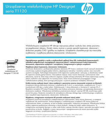 Urządzenie wielofunkcyjne HP Designjet seria T1120 Wielofunkcyjne urządzenie HP oferuje najwyższą jakość wydruku bez utraty poziomu szczegółowości obrazu. Dzięki niemu można w prosty sposób kopiować, skanować i drukować projekty CAD i grafikę na żądanie. Urządzenie charakteryzuje się niezwykłą szybkością i wyjątkową jakością skanowania i drukowania. Zaprojektowane specjalnie z myślą o użytkownikach aplikacji klasy GIS, środowiskach korporacyjnych i zakładach poligraficznych wymagających najwyższej jakości i zaawansowanych funkcji kopiowania, skanowania, zapewnienia wydajności i zarządzania, zintegrowanych w jednym urządzeniu. Urządzenie wielofunkcyjne HP Designjet T1120 HD Wyjątkowa jakość kopiowania, skanowania i drukowania. Możliwość drukowania z profesjonalną jakością: atramenty HP Vivera z zestawem trzech czarnych atramentów umożliwiają uzyskanie bogatej palety kolorów, obejmującej naturalną i neutralną szarość, oraz niezwykle wyraźne szczegóły. Technologia skanowania CCD zapewnia wysoką jakość i precyzję, a wbudowany moduł PS zapewnia szeroką gamę kolorów. Oszczędność miejsca: teraz można skanować i archiwizować stare dokumenty, nawet te, które mają widoczne zagięcia. Szybko schnące atramenty HP Vivera zapewniają wysoką jakość wydruków oraz odporność na rozmazywanie. Teraz można drukować przyciągające uwagę wielkoformatowe plakaty, które pomogą precyzyjnie i wyraźnie przekazać niezbędne informacje 1. Krótkie terminy realizacji zleceń i duża wydajność z pewnością wywrze niesamowite wrażenie na klientach. Urządzenie skanuje dokumenty kolorowe z prędkością do 5 cm/s, a czarno-białe z prędkością do 15 cm/s (rozdzielczość 400 dpi w trybie turbo). Wydrukowanie 1 strony dokumentu w formacie A1 zajmuje 35 s2. Bezpłatne narzędzie HP Instant Printing Utility oraz funkcje sortowania ułatwiają i przyspieszają skanowanie i drukowanie wsadowe. Wbudowana architektura przetwarzania danych i pamięć 80 GB umożliwiają szybki powrót do pracy. Skuteczne narzędzia do zarządzania ułatwiają obsługę tego wielofunkcyjnego urządzenia oraz wszystkich opcji kopiowania, skanowania i drukowania. Wyjątkowe, zintegrowane rozwiązanie HP pozwala realizować więcej zadań Urządzenie umożliwia zarządzanie wielkoformatowymi dokumentami, które można skanować, a następnie wydrukować lub zarchiwizować: funkcje dostępne w wielofunkcyjnym urządzeniu HP można skutecznie wykorzystywać razem, co sprawia, że jest to bardzo niezawodne i skuteczne rozwiązanie. Wbudowana funkcja analizy zapewnia podstawowe informacje o stanie drukarki i dostęp do kolejki zadań drukowania. To zintegrowane rozwiązanie łączące w sobie wiele funkcji zajmuje niewiele miejsca i pozwala oszczędzić cenną powierzchnię na biurku. Podgląd w czasie rzeczywistym i oprogramowanie do retuszu pozwala szybko reagować na zmiany i oczekiwania klientów. 1 Serif PosterDesigner Pro dla HP to oprogramowanie opcjonalne; nie wchodzi w skład zestawu, należy zakupić osobno 2 Czas druku mechanicznego na zwykłym nośniku w trybie szybkim, przy włączonym trybie Economode. Dane techniczne Informacje o zamawianiu Technologia druku Technologia termiczna HP Inkjet Liczba dysz w głowicy drukującej 2112 Rozdzielczość druku Liczba atramentów Rozdzielczość optymalizowana do 2400 x 1200 dpi z rozdzielczości wejściowej 1200 x 1200 przy wyborze maksymalnego oddania szczegółów Błękitny, szary, purpurowy, czarny matowy, czarny fotograficzny, żółty Typy atramentów Barwnikowe (C, M, Y, G, PK), pigmentowe (MK) Objętość kropli atramentu 6 pl (C, M, PK, G), 9 pl (Y, MK) Szybkość skanowania w kolorze (200 dpi/400 dpi w trybie turbo): do 5,1 cm/s; Szybkość skanowania w czerni i bieli (200 dpi/400 dpi w trybie turbo): do 15,2 cm/s Do 9600 dpi Prędkość skanowania Rozdzielczość skanowania Linia Języki drukowania Pamięć Marginesy (w mm) Dokładność linii: +/- 0.1%. Minimalna grubość: Minimalna szerokość linii (adresowalne przez HP-GL/2): 0,02 mm, gwarantowana minimalna grubość linii (ISO/IEC 13660:2001(E)): 0,06 mm Adobe® PostScript® 3, Adobe® PDF 1.6, TIFF, JPEG, HP-GL/2, HP-RTL, CALS G4, HP PCL 3 GUI Standardowo: Drukarka: 384 MB; Skaner: 1 GB; Maksymalnie: Drukarka: 384 MB; Skaner: 1 GB Dysk twardy: Drukarka: Standardowo 80 GB; Skaner: Standardowo 40 GB. 5 mm (górny), 5 mm (prawy), 5 mm (lewy), 16,75 mm (dolny) Formaty nośników Drukarka: Papier typu bond i powlekany (bond, powlekany, powlekany o wysokiej gramaturze, papier o bardzo wysokiej gramaturze oraz matowy, kolorowy), papier techniczny (kalka kreślarska, papier bond półprzezroczysty, welinowy), folia (przezroczysta, matowa, poliestrowa), papier fotograficzny (satynowany, błyszczący, lekko błyszczący, matowy, o wysokim połysku), nośnik podświetlany, nośnik samoprzylepny (two-view cling, papier do użytku w pomieszczeniach, polipropylenowy, winylowy); Skaner: papier gładki, papier welinowy, papier ze wzmocnieniami Mylar, papier sepia, światłokopie, laminat, pianka, tektura. (Nie wolno stosować przezroczystych folii i arkuszy ze sklejki, kamienia, metalu lub arkuszy o powierzchni chropowatej, zabrudzonej, nierównej, z ostrymi krawędziami, spalonych, złączonych metalowymi spinaczami). Standardowo: A4, A3, A2, A1, A0 Maksymalna długość nośnika Rolka: 91,4 m. Arkusz: 1676,4 mm Maksymalna szerokość nośników Drukarka: 1118 mm; Skaner: 1067 mm Grubość nośnika Drukarka: do 0,8 mm; Skaner: do 15,2 mm Zalecana gramatura nośników od 60 do 328 g/m² Rolka Maksymalna średnica: 135 mm Obsługa nośników Drukarka: Podawanie arkuszy, podawanie z roli, automatyczna obcinarka; Skaner: Podawanie arkuszy Interfejsy Wymiary (sz. x gł. x wys.) Standardowo: Drukarka: 1 port Gigabit Ethernet (1000Base-T); 1 szybki port USB 2,0; 1 opcjonalne gniazdo EIO Jetdirect; Skaner: 1 port Gigabit Ethernet (1000Base-T); 1 port FireWi