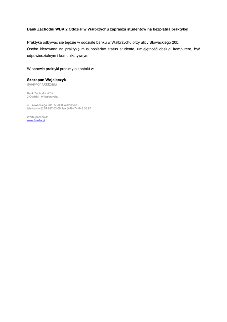 Bank Zachodni WBK 2 Oddział w Wałbrzychu zaprasza studentów na bezpłatną praktykę! Praktyka odbywać się będzie w oddziale banku w Wałbrzychu przy ulicy Słowackiego 20b. Osoba kierowana na praktykę musi posiadać status studenta, umiejętność obsługi komputera, być odpowiedzialnym i komunikatywnym. W sprawie praktyki prosimy o kontakt z: Szczepan Wojciaczyk dyrektor Oddziału Bank Zachodni WBK 2 Oddział w Wałbrzychu ul. Słowackiego 20b, 58-300 Wałbrzych telefon (+48) 74 887 03 09, fax (+48) 74 843 36 97 Warte poznania: www.bzwbk.pl