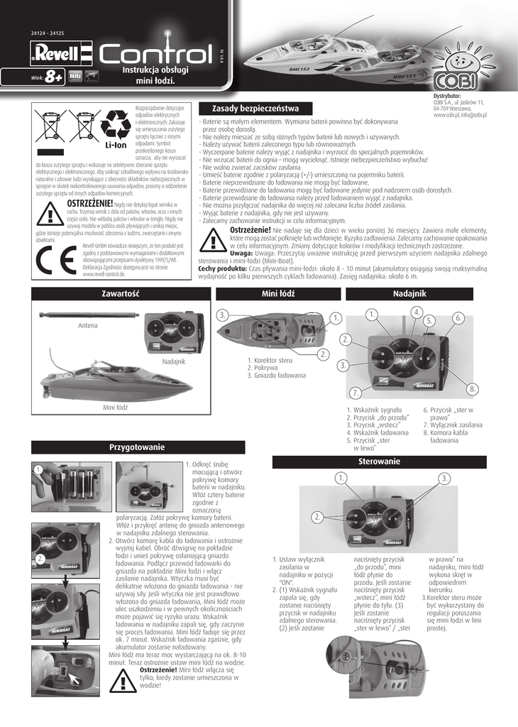 V 01.16 24124 - 24125 Wiek: 8+ 2 Instrukcja obsługi mini łodzi. -kanałowy Rozporządzenie dotyczące odpadów elektrycznych i elektronicznych: Zakazuje się umieszczania zużytego sprzętu łącznie z innymi odpadami. Symbol przekreślonego kosza oznacza, aby nie wyrzucać do kosza zużytego sprzętu i wskazuje na selektywne zbieranie sprzętu elektrycznego i elektronicznego. Aby uniknąć szkodliwego wpływu na środowisko naturalne i zdrowie ludzi wynikające z obecności składników niebezpiecznych w sprzęcie w skutek niekontrolowanego usuwania odpadów, prosimy o oddzielenie zużytego sprzętu od innych odpadów komercyjnych. OSTRZEŻENIE! Nigdy nie dotykaj łopat wirnika w ruchu. Trzymaj wirnik z dala od palców, włosów, oczu i innych części ciała. Nie wkładaj palców i włosów w śmigło. Nigdy nie używaj modelu w pobliżu osób pływających i unikaj miejsc, gdzie istnieje potencjalna mozliwość zderzenia z ludźmi, zwierzętami i innymi obiektami. Revell GmbH oświadcza niniejszym, że ten produkt jest zgodny z podstawowymi wymaganiami i dodatkowymi obowiązującymi przepisami dyrektywy 1999/5/WE. Deklaracja Zgodności dostępna jest na stronie www.revell-control.de. Dystrybutor: COBI S.A., ul. Jaskrów 11, 04-709 Warszawa, www.cobi.pl, [email protected] Zasady bezpieczeństwa - Baterie są małym elementem. Wymiana baterii powinna być dokonywana przez osobę dorosłą. - Nie należy mieszać ze sobą różnych typów baterii lub nowych i używanych. - Należy używać baterii zaleconego typu lub równoważnych. - Wyczerpane baterie należy wyjąć z nadajnika i wyrzucić do specjalnych pojemników. - Nie wrzucać baterii do ognia – mogą wycieknąć. Istnieje niebezpieczeństwo wybuchu! - Nie wolno zwierać zacisków zasilania. - Umieść baterie zgodnie z polaryzacją (+/-) umieszczoną na pojemniku baterii. - Baterie nieprzewidziane do ładowania nie mogą być ładowane. - Baterie przewidziane do ładowania mogą być ładowane jedynie pod nadzorem osób dorosłych. - Baterie przewidziane do ładowania należy przed ładowaniem wyjąć z nadajnika. - Nie można przyłączać nadajnika do więcej niż zalecana liczba źródeł zasilania. - Wyjąć baterie z nadajnika, gdy nie jest używany. - Zalecamy zachowanie instrukcji w celu informacyjnym. Ostrzeżenie! Nie nadaje się dla dzieci w wieku poniżej 36 miesięcy. Zawiera małe elementy, które mogą zostać połknięte lub wchłonięte. Ryzyko zadławienia. Zalecamy zachowanie opakowania w celu informacyjnym. Zmiany dotyczące kolorów i modyfikacji technicznych zastrzeżone. Uwaga: Uwaga: Przeczytaj uważnie instrukcję przed pierwszym użyciem nadajnika zdalnego sterowania i mini-łodzi (Mini-Boat). Cechy produktu: Czas pływania mini-łodzi: około 8 - 10 minut (akumulatory osiągają swoją maksymalną wydajność po kilku pierwszych cyklach ładowania). Zasięg nadajnika: około 6 m. Zawartość Mini łódź Nadajnik 3. 1. 1. Antena 4. 6. 5. 2. Nadajnik 2. 1. Korektor steru 2. Pokrywa 3. Gniazdo ładowania 3. 8. 7. Mini łódź 1. Wskaźnik sygnału 2. Przycisk „do przodu” 3. Przycisk „wstecz” 4. Wskaźnik ładowania 5. Przycisk „ster w lewo” Przygotowanie 1. 2. 1. O dkręć śrubę mocującą i otwórz pokrywę komory baterii w nadajniku. Włóż cztery baterie zgodnie z oznaczoną polaryzacją. Załóż pokrywę komory baterii. Włóż i przykręć antenę do gniazda antenowego w nadajniku zdalnego sterowania. 2. O twórz komorę kabla do ładowania i ostrożnie wyjmij kabel. Obróć dźwignię na pokładzie łodzi i unieś pokrywę osłaniającą gniazdo ładowania. Podłącz przewód ładowarki do gniazda na pokładzie Mini łodzi i włącz zasilanie nadajnika. Wtyczka musi być delikatnie włożona do gniazda ładowania - nie używaj siły. Jeśli wtyczka nie jest prawidłowo włożona do gniazda ładowania, Mini łódź może ulec uszkodzeniu i w pewnych okolicznościach może pojawić się ryzyko urazu. Wskaźnik ładowania w nadajniku zapali się, gdy zaczynie się proces ładowania. Mini łódź ładuje się przez ok. 7 minut. Wskaźnik ładowania zgaśnie, gdy akumulator zostanie naładowany. Mini łódź ma teraz moc wystarczającą na ok. 8-10 minut. Teraz ostrożnie ustaw mini łódź na wodzie. Ostrzeżenie! Mini łódź włącza się tylko, kiedy zostanie umieszczona w wodzie! 6. Przycisk „ster w prawo” 7. Wyłącznik zasilania 8. Komora kabla ładowania Sterowanie 1. 3. 2. 1. Ustaw wyłącznik zasilania w nadajniku w pozycji "ON". 2. (1) Wskaźnik sygnału zapala się, gdy zostanie naciśnięty przycisk w nadajniku zdalnego sterowania. (2) Jeśli zostanie naciśnięty przycisk „do przodu”, mini łódź płynie do przodu. Jeśli zostanie naciśnięty przycisk „wstecz”, mini łódź płynie do tyłu. (3) Jeśli zostanie naciśnięty przycisk „ster w lewo” / „ster w prawo” na nadajniku, mini łódź wykona skręt w odpowiednim kierunku. 3.Korektor steru może być wykorzystany do regulacji poruszania się mini łodzi w linii prostej.