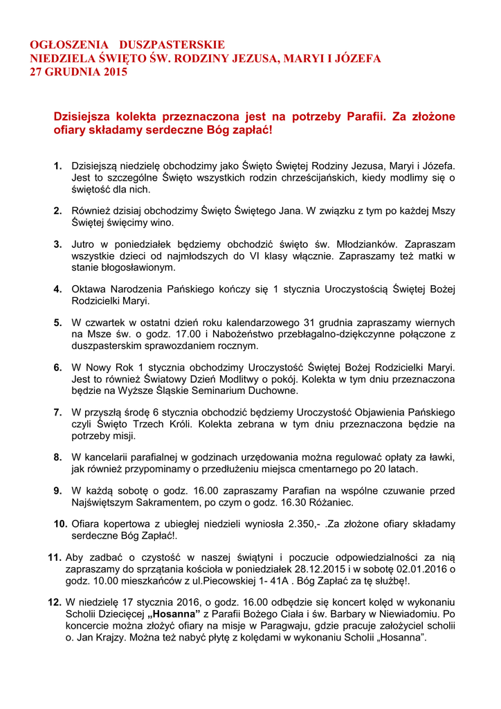 OGŁOSZENIA DUSZPASTERSKIE NIEDZIELA ŚWIĘTO ŚW. RODZINY JEZUSA, MARYI I JÓZEFA 27 GRUDNIA 2015 Dzisiejsza kolekta przeznaczona jest na potrzeby Parafii. Za złożone ofiary składamy serdeczne Bóg zapłać! 1. Dzisiejszą niedzielę obchodzimy jako Święto Świętej Rodziny Jezusa, Maryi i Józefa. Jest to szczególne Święto wszystkich rodzin chrześcijańskich, kiedy modlimy się o świętość dla nich. 2. Również dzisiaj obchodzimy Święto Świętego Jana. W związku z tym po każdej Mszy Świętej święcimy wino. 3. Jutro w poniedziałek będziemy obchodzić święto św. Młodzianków. Zapraszam wszystkie dzieci od najmłodszych do VI klasy włącznie. Zapraszamy też matki w stanie błogosławionym. 4. Oktawa Narodzenia Pańskiego kończy się 1 stycznia Uroczystością Świętej Bożej Rodzicielki Maryi. 5. W czwartek w ostatni dzień roku kalendarzowego 31 grudnia zapraszamy wiernych na Msze św. o godz. 17.00 i Nabożeństwo przebłagalno-dziękczynne połączone z duszpasterskim sprawozdaniem rocznym. 6. W Nowy Rok 1 stycznia obchodzimy Uroczystość Świętej Bożej Rodzicielki Maryi. Jest to również Światowy Dzień Modlitwy o pokój. Kolekta w tym dniu przeznaczona będzie na Wyższe Śląskie Seminarium Duchowne. 7. W przyszłą środę 6 stycznia obchodzić będziemy Uroczystość Objawienia Pańskiego czyli Święto Trzech Króli. Kolekta zebrana w tym dniu przeznaczona będzie na potrzeby misji. 8. W kancelarii parafialnej w godzinach urzędowania można regulować opłaty za ławki, jak również przypominamy o przedłużeniu miejsca cmentarnego po 20 latach. 9. W każdą sobotę o godz. 16.00 zapraszamy Parafian na wspólne czuwanie przed Najświętszym Sakramentem, po czym o godz. 16.30 Różaniec. 10. Ofiara kopertowa z ubiegłej niedzieli wyniosła 2.350,- .Za złożone ofiary składamy serdeczne Bóg Zapłać!. 11. Aby zadbać o czystość w naszej świątyni i poczucie odpowiedzialności za nią zapraszamy do sprzątania kościoła w poniedziałek 28.12.2015 i w sobotę 02.01.2016 o godz. 10.00 mieszkańców z ul.Piecowskiej 1- 41A . Bóg Zapłać za tę służbę!. 12. W niedzielę 17 stycznia 2016, o godz. 16.00 odbędzie się koncert kolęd w wykonaniu Scholii Dziecięcej „Hosanna” z Parafii Bożego Ciała i św. Barbary w Niewiadomiu. Po koncercie można złożyć ofiary na misje w Paragwaju, gdzie pracuje założyciel scholii o. Jan Krajzy. Można też nabyć płytę z kolędami w wykonaniu Scholii „Hosanna”.