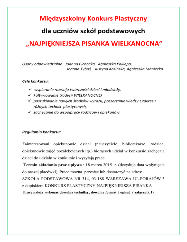 Międzyszkolny Konkurs Plastyczny dla uczniów szkół podstawowych „NAJPIĘKNIEJSZA PISANKA WIELKANOCNA” Osoby odpowiedzialne: Joanna Cichocka, Agnieszka Paklepa, Joanna Tybuś, Justyna Kosińska, Agnieszka Maniecka Cele konkursu: wspieranie rozwoju twórczości dzieci i młodzieży, kultywowanie tradycji WIELKANOCNEJ poszukiwanie nowych środków wyrazu, poszerzanie wiedzy z zakresu różnych technik plastycznych, zachęcanie do współpracy rodziców i opiekunów. Regulamin konkursu: Zainteresowani opiekunowie dzieci (nauczyciele, bibliotekarze, rodzice, opiekunowie zajęć pozalekcyjnych itp.) biorących udział w konkursie zachęcają dzieci do udziału w konkursie i wysyłają prace. Termin składania prac upływa : 18 marca 2015 r. (decyduje data wpłynięcia do naszej placówki). Prace można przesłać lub dostarczyć na adres: SZKOŁA PODSTAWOWA NR 314, 03-188 WARSZAWA UL.PORAJÓW 3 z dopiskiem KONKURS PLASTYCZNY NAJPIĘKNIEJSZA PISANKA Prace należy wykonać dowolną techniką , dowolny format i opisać ( załącznik 1) ZASADY KONKURSU: konkurs jest przeznaczony dla dzieci kl. 0 oraz I-III przedmiotem konkursu jest wykonanie przy współpracy z rodzicami pisanki wielkanocnej jedna osoba może być autorem jednej pracy, posiedzenie Komisji Konkursowej odbędzie się 20.03.2015 r. Komisja Konkursowa oceniać będzie: wykonanie, pomysł, oryginalność, kreatywność wyniki konkursu wywieszone zostaną w pokoju nauczycielskim, na tablicy Szkolnego Koła Wolontariatu oraz wysłane mailowo do zgłoszonych szkół organizator nie zwraca prac, PISANKI przekazane zostaną na szkolny kiermasz świąteczny, z którego dochód przeznaczony zostanie na cele charytatywne (Hospicjum Domowe przy ul.Tykocińskiej oraz Adopcję na odległość), zdjęcia prac umieszczone zostaną na stronie internetowej SKW informacja o wręczeniu nagród zostanie wysłana do szkół mailowo Zapraszamy do wzięcia udziału w konkursie!!! Załącznik Nr 1 Zgłoszenie udziału w Konkursie plastycznym „NAJPIĘKNIEJSZA PISANKA WIELKANOCNA” • Imię i nazwisko dziecka, wiek ……………………………………………………………………………………………… • Nazwa i dane teleadresowe szkoły, lub instytucji, dane teleadresowe do kontaktu w przypadku osób prywatnych ………………………………………………………………………………………………… ……………………………………………………………………………………………… • Imię i nazwisko opiekuna ……………………………………………………………………………………………… Wyrażam zgodę na przetwarzanie moich danych osobowych przez Organizatora oraz na publiczne – w tym w mediach – wykorzystania rysunku i nazwiska Uczestnika dla potrzeb konkursu i informowania o nim oraz podczas wystawy pokonkursowej. Opiekun dziecka ( podpis)………………………………………………………….. ZAPRASZAMY MIĘDZYSZKOLNY KONKURS PLASTYCZNY NAJPIĘKNIEJSZA PISANKA WIELKANOCNA