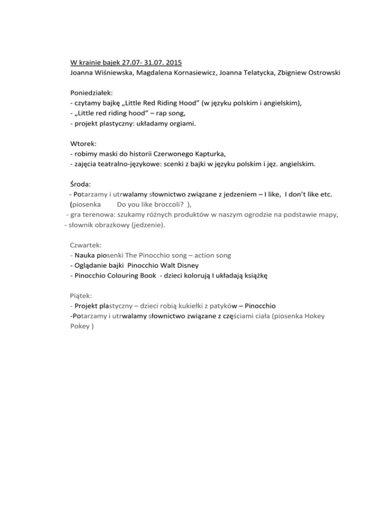 W krainie bajek 27.07- 31.07. 2015 Joanna Wiśniewska, Magdalena Kornasiewicz, Joanna Telatycka, Zbigniew Ostrowski Poniedziałek: - czytamy bajkę „Little Red Riding Hood” (w języku polskim i angielskim), - „Little red riding hood” – rap song, - projekt plastyczny: układamy orgiami. Wtorek: - robimy maski do historii Czerwonego Kapturka, - zajęcia teatralno-językowe: scenki z bajki w języku polskim i jęz. angielskim. Środa: - Potarzamy i utrwalamy słownictwo związane z jedzeniem – I like, I don’t like etc. (piosenka Do you like broccoli? ), - gra terenowa: szukamy różnych produktów w naszym ogrodzie na podstawie mapy, - słownik obrazkowy (jedzenie). Czwartek: - Nauka piosenki The Pinocchio song – action song - Oglądanie bajki Pinocchio Walt Disney - Pinocchio Colouring Book - dzieci kolorują I układają książkę Piątek: - Projekt plastyczny – dzieci robią kukiełki z patyków – Pinocchio -Potarzamy i utrwalamy słownictwo związane z częściami ciała (piosenka Hokey Pokey )