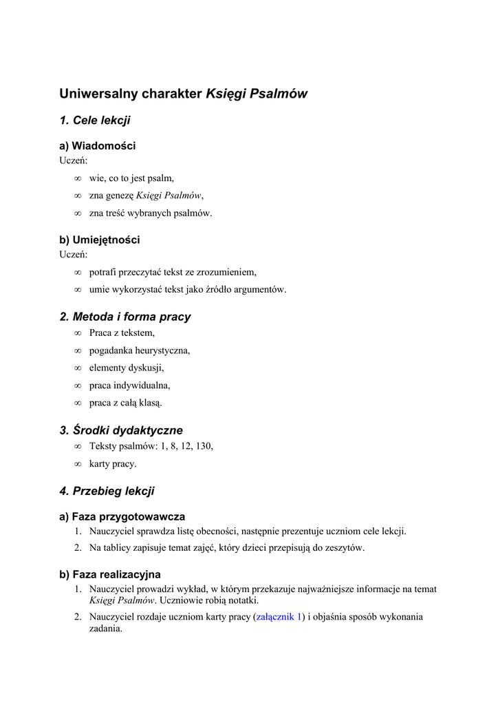 Uniwersalny charakter Księgi Psalmów 1. Cele lekcji a) Wiadomości Uczeń: • wie, co to jest psalm, • zna genezę Księgi Psalmów, • zna treść wybranych psalmów. b) Umiejętności Uczeń: • potrafi przeczytać tekst ze zrozumieniem, • umie wykorzystać tekst jako źródło argumentów. 2. Metoda i forma pracy • Praca z tekstem, • pogadanka heurystyczna, • elementy dyskusji, • praca indywidualna, • praca z całą klasą. 3. Środki dydaktyczne • Teksty psalmów: 1, 8, 12, 130, • karty pracy. 4. Przebieg lekcji a) Faza przygotowawcza 1. Nauczyciel sprawdza listę obecności, następnie prezentuje uczniom cele lekcji. 2. Na tablicy zapisuje temat zajęć, który dzieci przepisują do zeszytów. b) Faza realizacyjna 1. Nauczyciel prowadzi wykład, w którym przekazuje najważniejsze informacje na temat Księgi Psalmów. Uczniowie robią notatki. 2. Nauczyciel rozdaje uczniom karty pracy (załącznik 1) i objaśnia sposób wykonania zadania. 3. Uczniowie czytają psalmy i odpowiadają n pytania zawarte w karcie pracy. c) Faza podsumowująca Podsumowanie wiadomości zdobytych w toku lekcji. 5. Bibliografia 1. Pismo Święte Starego i Nowego Testamentu, oprac. zespół biblistów polskich, Reader’s Digest i Pallottinum, Warszawa-Poznań 2004. 2. www.pl.wikipedia.org/wiki/Pismo_%C5%9Bwi%C4%99te 3. http://www.pl.wikipedia.org/wiki/Psalm 6. Załączniki a) Karta pracy ucznia załącznik 1. Nazwa psalmu Psalm 1 Pytanie - Jak w psalmie określeni zostają ludzie nabożni, a jak pobożni? - Jaką mądrość przekazuje psalm? - Do jakiego rodzaju psalmów możemy go zaliczyć, dlaczego? Psalm 8 - Jaki obraz Boga i człowieka wyłania się z tego psalmu? - Co możemy powiedzieć o budowie tego psalmu? Psalm 12 - Do jakiego wydarzenia biblijnego nawiązuje treść psalmu? - Jaki problem zostaje poruszony w psalmie? - Co to jest nieprawość? - O co prosi Pana podmiot liryczny psalmu? Odpowiedź Psalm 130 - O co prosi Boga podmiot liryczny psalmu? - Jaki jest stosunek podmiotu lirycznego do Pana? - Do jakiego rodzaju psalmów możemy go zaliczyć i dlaczego? b) Notatki dla nauczyciela • Wiadomości na temat Księgi Psalmów Pismo Święte zawiera 150 utworów określanych wspólnym mianem Księga Psalmów. Zebrane w 5 ksiąg psalmy biblijne powstawały od XI do ok. III w.p.n.e. W ciągu wieków utrzymywał się pogląd, że autorem zawartych w niej tekstów jest król Izraela, Dawid. Badania wskazały jednak, że autorów psalmów było wielu. Poza Dawidem wymienia się również Mojżesza, Salomona, Asafara, Korachitoma, Ezrachitoma. Łacińskie słowo psalmos oznacza śpiew i trącanie strun instrumentu o nazwie psałterion. Psalm - rodzaj pieśni religijnej, o podniosłym, modlitewnym charakterze, którego adresatem jest zazwyczaj Bóg, rzadziej człowiek. Ze względu na treść wyróżnia się psalmy: dziękczynne, błagalne, pokutne, prorocze, pochwalne, patriotyczne, żałobne. Jako utwory przeznaczone do wykonywania z towarzyszeniem instrumentu, psalmy są silnie zrytmizowane. Efektowi temu służy przestrzegany tu konsekwentnie podział na wersety. Są one wobec siebie uzupełniające lub przeciwstawne. Częstym zabiegiem jest powtarzanie podobnego motywu, co dodatkowo wzmacnia rytmiczność utworów. Dzięki takiej strukturze niektóre myśli zostają szczególnie mocno podkreślone. Niektóre psalmy mają kompozycję klamrową- całość kończy się tym samym motywem, frazą, słowem. (na podstawie www.pl.wikipedia.org/wiki/Psalm) 7. Czas trwania lekcji 2 × 45 minut 8. Uwagi do scenariusza brak