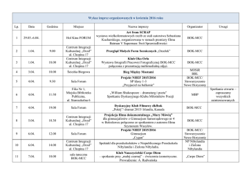 Wykaz imprez organizowanych w kwietniu 2016 roku Lp. 1 Data Godzina 29.03.-6.04. Miejsce Nazwa imprezy Organizator Hol Kina FORUM Art from SCRAP wystawa wielkoformatowych rzeźb ze stali autorstwa Sebastiana Kucharskiego, zorganizowana w ramach premiery filmu Batman V Superman: Świt Sprawiedliwości BOK-MCC Centrum Integracji Kulturalnej „Orzeł” ul. Chopina 17 Centrum Integracji Kulturalnej „Orzeł” ul. Chopina 17 Przegląd Małych Form Scenicznych „Orzełek” BOK-MCC Klub Oko Orła Wystawa fotografii Pracowni Fotograficznej BOK-MCC połączona z prezentacją multimedialną zdjęć. BOK-MCC 2 1.04. 9.00 3 1.04. 18.00 4 3.04. 10.00 Ścieżka Biegowa Bieg Między Mostami 5 4.04. 9.30 Sala Forum Projekt NHEF 2015/2016 SP klasy 1-3 „Przyjaciel na balkonie” 6 4.04. 11:30 Filia Nr 1, Miejska Biblioteka Publiczna, ul. Staroszkolna 6 7 4.04. 19.00 Sala Forum 10.30 Centrum Integracji Kulturalnej „Orzeł” ul. Chopina 17 8 5.04. „William Shakespeare – dramaturg i poeta” Spotkanie Dyskusyjnego Klubu Miłośników Poezji Dyskusyjny Klub Filmowy dkfbok „Pokój”/ dramat 2015/ Irlandia, Kanada Projekcja filmu dokumentalnego „Mury Mówią” dla gimnazjalistów z Gimnazjum Samorządowego nr 4 w Bolesławcu połączone ze spotkaniem z autorem filmu Szymonem Wasylów. Projekt NHEF 2015/2016 Gimnazjum „Cygan” 9 6.04. 12.00 Sala Forum 10 6.04. 14.00 Centrum Integracji Kulturalnej „Orzeł” ul. Chopina 17 Spektakl dla przedszkolaków z Niepublicznego Przedszkola Nibylandia i Zielona Nibyladia. 11 7.04. 10.00 sala taneczna BOK-MCC Klub Nauczycielski Carpe Diem – spotkanie przy „małej czarnej” – ćwiczenia izometryczne. Prowadzenie: A. Radwańska Uwagi MOSiR BBL BOK-MCC/ Stowarzyszenie Nowe Horyzonty MBP BOK-MCC BOK-MCC BOK-MCC/ Stowarzyszenie Nowe Horyzonty NP Nibylandia i Zielona Nibylandia „Carpe Diem” Spotkanie otwarte – zapraszamy wszystkich zainteresowanych 12 07.04 10:30 Korty ul. Lubańska Mistrzostwa Miasta Bolesławiec Szkół Podstawowych w Tenisie Ziemnym MOSiR B.Chodyra 13 7.04. 19.00 Sala Forum Michał Bajor Koncert „Moja miłość” BOK-MCC Bilety wyprzedane Anna Onichimowska - spotkanie autorskie dla uczniów klas 4-6 MBP Impreza dla grup zorganizowanych Wstęp bezpłatny Projekt NHEF 2015/2016 Przedszkola „Jill i Joy” Projekt NHEF 2015/2016 Szkoły Ponadgimnazjalne „Mama” BOK-MCC/ Stowarzyszenie Nowe Horyzonty BOK-MCC/ Stowarzyszenie Nowe Horyzonty 14 08.04. 9:00 Galeria „Format” Miejska Biblioteka Publiczna, ul. Sądowa 8 15 8.04. 9.30 Sala Forum 8.04. 12.00 16 17 18 19 20 8.04. 8.04. 8.30 Centrum Integracji Kulturalnej „Orzeł” ul. Chopina 17 III PRZEGLĄD PIOSENKI JACKA KACZMARSKIEGO „A mury runą...” przesłuchania. BOK-MCC 18.00 Centrum Integracji Kulturalnej „Orzeł” ul. Chopina 17 w Bolesławcu III Przeglądzie Piosenki Jacka Kaczmarskiego „A mury runą..." – ogłoszenie wyników oraz koncert laureatów. BOK-MCC Centrum Integracji Kulturalnej „Orzeł” ul. Chopina 17 Spotkanie autorskie z Grzegorzem Kordkiem 19.00 Sala Forum Dyskusyjny Klub Filmowy dkfbok „El Clan”/ thriller 2015/ Argentyna, Hiszpania 9.04. 11.04. Sala Forum 21 12.04. 12.00 Centrum Integracji Kulturalnej „Orzeł” ul. Chopina 17 22 13.04. 19.00 Sala Forum Spotkanie z Panem Tadeuszem Jurkowski dla gimnazjalistów w ramach projektu „Ocalić od zapomnienia – 70 – lat od powrotu Polaków z Bośni” Widowisko taneczne „Od Hiszpanii po Orient” BOK-MCC Stowarzyszenie Reemigrantów BOK-MCC Impreza pod patronatem Prezydenta Miasta Bolesławiec Pana Piotra Romana oraz Terenowej Organizacji NSZZ Solidarność w Powiecie Bolesławieckim Impreza pod patronatem Prezydenta Miasta Bolesławiec Pana Piotra Romana oraz Terenowej Organizacji NSZZ Solidarność w Powiecie Bolesławieckim 23 14.04. 24 15.04. 25 15.04. 19.00 Wernisaż 18.00 Sala Forum „Gala Trzech Tenorów” - koncert Tomczyk Art/ BOK-MCC Centrum Integracji Kulturalnej „Orzeł” ul. Chopina 17 Powiatowy Festiwal Piosenki Ekologicznej SP 4 „Mapy ciał” wystawa obrazów ceramicznych Weroniki Surmy. Ekspozycja obejmuje cykl obrazów ceramicznych zrealizowanych pod patronatem Ministra Kultury i Dziedzictwa Narodowego. Tematem prezentowanych prac jest figura ludzka. Weronika Surma ukończyła z wyróżnieniem ASP w Warszawie w 2013 roku. Obecnie jest doktorantką w Katedrze Ceramiki na ASP im. E. Gepperta we Wrocławiu. Wystawa czynna do 22.05.2016 r. BOK-MCC Galeria mała Biała 26 17.04. 8.00-14.00 Rynek Giełda Staroci Bolesławieckie Stowarzyszenie Kolekcjonerów i Miłośników Historii Miasta 27 18.04. 9.30 Sala Forum Spektakl teatralny „Pinokio” Katolicki Teatr Edukacji 28 18.04. 19.00 Sala Forum Dyskusyjny Klub Filmowy dkfbok Pokaz przedpremierowy! „Major”/ dramat, kryminał 2013/ Rosja BOK-MCC 29 21.04. 10.00 Muzeum Ceramiki ul. Mickiewicza 13 Warsztaty ceramiczne dla dzieci i młodzieży Muzeum Ceramiki bezpłatne 18.00 Centrum Integracji Kulturalnej „Orzeł” ul. Chopina 17 Spotkanie z Jarosławem Kretem znanym dziennikarzem, autorem książek podróżniczych. Miejska Biblioteka Publiczna Spotkanie otwarte – zapraszamy wszystkich zainteresowanych Wstęp bezpłatny Sala Forum „Złodziej” - spektakl 30 21.04. Agencja Artystyczna MUZA/ BOKMCC 31 21.04. 19.00 32 Do 22.04 10:00 Stadion Miejski Mistrzostwa Miasta Bolesławiec Szkół Podstawowych w Czwórboju LA MOSiR 33 23.04. 16.00 Centrum Integracji Kulturalnej „Orzeł” ul. Chopina 17 Inauguracja projektu „Ocalić od zapomnienia – 70 – lat od powrotu Polaków z Bośni” Stowarzyszenie Reemigrantów Spotkanie otwarte 34 35 23.04. 25.04. Wernisaż 17.00 19.00 36 26.04. 9:00 37 26.04. 16.00 Galeria W sam raz Sala Forum Galeria „Format” Miejska Biblioteka Publiczna, ul. Sądowa 8 Centrum Integracji Kulturalnej „Orzeł” ul. Chopina 17 Sala Multimedialna Miejska Biblioteka Publiczna ul. Sądowa 8 38 27.04. 16:00 39 28.04. 6.00-14.00 Sala Forum Sala Multimedialna Miejska Bibliote