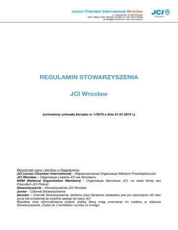 Junior Chamber International Wrocław ul. Legnicka 65, 54-206 Wrocław KRS: 0000141350, REGON: 931865110, NIP: 8971579366 [email protected] • www.jciwroclaw.pl REGULAMIN STOWARZYSZENIA JCI Wrocław (uchwalony uchwałą Zarządu nr 1/2015 z dnia 21.01.2015 r.) Słowniczek nazw i skrótów w Regulaminie: JCI (Junior Chamber International) – Międzynarodowa Organizacja Młodych Przedsiębiorców JCI Wrocław – Organizacja Lokalna JCI we Wrocławiu NOM (National Organization Members) – Organizacja Narodowa JCI, na czele której stoi Prezydent JCI Poland Stowarzyszenie – Stowarzyszenie JCI Wrocław Junior – Członek Stowarzyszenia Senator – Członek Stowarzyszenia, któremu tytuł Senatora nadawany jest po ukończeniu 40 roku życia lub wcześniej za wybitne zasługi na rzecz JCI Wszelkie inne sformułowania pisane wielką literą mają znaczenie im nadane w statucie Stowarzyszenia, chyba że z kontekstu wynika co innego Junior Chamber International Wrocław ul. Legnicka 65, 54-206 Wrocław KRS: 0000141350, REGON: 931865110, NIP: 8971579366 [email protected] • www.jciwroclaw.pl §1 Prace Zarządu 1. Udział w Posiedzeniach Zarządu jest obowiązkowy dla Członków Zarządu oraz zalecany dla Dyrektorów, Dyrektorów Zespołów, Członków Komisji Rewizyjnej i otwarty dla wszystkich Członków Stowarzyszenia. 2. D yrektorzy, Dyrektorzy Zespołów, Członkowie Komisji Rewizyjnej i Członkowie Stowarzyszenia, podczas Posiedzeń Zarządu pełnią funkcję doradczą. 3. Członkowie Zarządu spóźnieni na posiedzenia Zarządu muszą wykonać tyle pompek, ile minut spóźnienia lub podwójną ilość pajacyków. 4. W przypadku równowagi głosów podczas głosowania Zarządu decyduje głos Prezydenta lub, w przypadku nieobecności Prezydenta, głos Pierwszego Wiceprezydenta. 5. Po każdym spotkaniu Zarządu, w ciągu tygodnia, osoba sporządzająca protokół lub notatkę udostępnia je Juniorom za pomocą środków komunikacji elektronicznej. Wszystkie protokoły i notatki udostępniane są Juniorom na żądanie, za pośrednictwem środków komunikacji elektronicznej. Oryginały przechowywane są w rejestrze prowadzonym przez Prezydenta lub Sekretarza. 6. Członkowie Zarządu, na pierwszym spotkaniu nowego Zarządu, uchwalają podział swoich obowiązków wzorowany na rozdz. IX-XIII JCI Constitution and Policy Manual oraz dobrych praktykach Stowarzyszenia. 7. Zarząd, pod kierownictwem Pierwszego Wiceprezydenta, sporządza do końca każdego roku Strategię działania oraz Roczny Plan Działania na rok następny. 8. Przy braku istotnych przeszkód kandydatem na Prezydenta kolejnej kadencji powinien być Pierwszy Wiceprezydent. 9. Członkowie Zarządu nie powinni być jednocześnie członkami Zarządu NOM chyba, że nie ma innych kandydatów i wymaga tego interes Stowarzyszenia. 10. Członkowie Zarządu nie mogą pełnić tej samej funkcji dłużej niż rok z rzędu. 11. Zarząd, z inicjatywy własnej lub na wniosek 3 Członków Stowarzyszenia, może powoływać Członków Stowarzyszenia na Dyrektorów lub Dyrektorów Zespołów odpowiedzialnych za określone zakresy obowiązków. Na Dyrektora lub Dyrektora Zarządu nie może być powołany Członek Stowarzyszenia pełniący w danym roku funkcję Dyrektora lub Dyrektora Zespołu. 12. Wnioski o odwołanie Dyrektorów i Dyrektorów Zespołów rozpatruje Zarząd. Wniosek może złożyć każdy z Członków Zarządu lub przynajmniej 2 członków zespołu, którym kieruje Dyrektor Zespołu. 13. Dyrektorzy i Dyrektorzy Zespołów odpowiadają za pracę swoich zespołów i za powierzone im zadania przed Zarządem i raportują do Pierwszego Wiceprezydenta nie rzadziej niż raz na kwartał lub na każde wezwanie. 14. Członkowie Zarządu nie mogą być jednocześnie Dyrektorami lub Dyrektorami Zespołów, mogą natomiast prowadzić własne projekty. §2 Spotkania ogólne 1. W ramach działalności Stowarzyszenia organizowane są spotkania ogólne, które odbywają się w stałym miejscu, cyklicznie w pierwszy i trzeci czwartek każdego miesiąca w godzinach popołudniowych. Czas i miejsce podawane są z wyprzedzeniem na stronie internetowej Stowarzyszenia (www.jciwroclaw.pl) oraz profilu Facebook Stowarzyszenia. 2. Spotkania ogólne mają charakter otwarty, a ich tematyka powinna być ustalana tak, by była interesująca dla możliwie szerokiej grupy Juniorów i gości. 3. Każde spotkanie, które odbywa się w ramach Stowarzyszenia, musi być wpisane do kalendarza na stronie internetowej Stowarzyszenia (www.jciwroclaw.pl) oraz udostępnione na Facebooku Stowarzyszenia. Junior Chamber International Wrocław ul. Legnicka 65, 54-206 Wrocław KRS: 0000141350, REGON: 931865110, NIP: 8971579366 [email protected] • www.jciwroclaw.pl §3 Zespoły 1. Zarząd, z własnej inicjatywy, lub na wniosek 3 Członków Stowarzyszenia może powoływać zespoły. Zespoły działają w obrębie wyznaczonych im zadań. 2. Pracami zespołów kierują Dyrektorzy Zespołów, powoływani i odwoływani w trybie odpowiednio §1 pkt 11 i 12 Regulaminu Stowarzyszenia JCI Wrocław. 3. Zespoły spotykają się z częstotliwością i w terminach ustalanych z Dyrektorem danego zespołu. Spotkania odbywają się w terminach innym niż spotkania ogólne. 4. Dyrektor każdego zespołu sporządza sprawozdania ze spotkań swojego zespołu. 5. Dyrektor zespołu jest jednocześnie mentorem dla członków zespołu i musi dbać o ich motywację, rozwój i aktywność. §4 Finanse Stowarzyszenia 1. Członkostwo w Stowarzyszeniu wymaga opłacenia składki, ustalanej przez Walne Zebranie Członków Stowarzyszenia. Na dzień uchwalenia niniejszego Regulaminu obowiązuje składka członkowska, w wysokości 300 zł rocznie, którą można uiścić w jednym z dwóch wariantów: A) Cała kwota składki do końca stycznia danego roku; B) W dwóch ratach: 150 zł do końca stycznia i 150 zł do końca marca danego roku. 2. W przypadku, gdy nowy Junior przyjmowany jest do Stowarzyszenia w trak