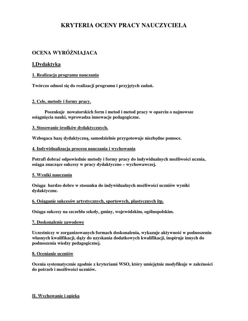 KRYTERIA OCENY PRACY NAUCZYCIELA OCENA WYRÓŻNIAJACA I.Dydaktyka 1. Realizacja programu nauczania Twórczo odnosi się do realizacji programu i przyjętych zadań. 2. Cele, metody i formy pracy. Poszukuje nowatorskich form i metod i metod pracy w oparciu o najnowsze osiągnięcia nauki, wprowadza innowacje pedagogiczne. 3. Stosowanie środków dydaktycznych. Wzbogaca bazę dydaktyczną, samodzielnie przygotowuje niezbędne pomoce. 4. Indywidualizacja procesu nauczania i wychowania Potrafi dobrać odpowiednie metody i formy pracy do indywidualnych możliwości ucznia, osiąga znaczące sukcesy w pracy dydaktyczno – wychowawczej. 5. Wyniki nauczania Osiąga bardzo dobre w stosunku do indywidualnych możliwości uczniów wyniki dydaktyczne. 6. Osiąganie sukcesów artystycznych, sportowych, plastycznych itp. Osiąga sukcesy na szczeblu szkoły, gminy, wojewódzkim, ogólnopolskim. 7. Doskonalenie zawodowe Uczestniczy w zorganizowanych formach doskonalenia, wykazuje aktywność w podnoszeniu własnych kwalifikacji, dąży do uzyskania dodatkowych kwalifikacji, inspiruje innych do podnoszenia wiedzy pedagogicznej. 8. Ocenianie uczniów Ocenia systematycznie zgodnie z kryteriami WSO, który umiejętnie modyfikuje w zależności do potrzeb i możliwości uczniów. II. Wychowanie i opieka 1. Znajomość środowiska wychowawczego ucznia Efektywnie wpływa na kształtowanie środowiska wychowawczego ucznia. 2. Organizacja i integracja zespołu klasowego Wypracował własne formy integracji, inspiruje innych nauczycieli do ich stosowania. 3. Kontakty z rodzicami Włącza rodziców w programowe i organizacyjne sprawy klasy/szkoły. 4. Współpraca z instytucjami wspomagającymi szkołę. Nawiązuje kontakty, inspiruje wspolpracę, poszukuje sponsorów. 5. Realizacja planu pracy Realizuje zadania planowe twórczo je modyfikując. III. Dyscyplina pracy Przestrzega dyscypliny pracy, terminowo realizuje zadania i zalecenia przełożonych, prowadzi właściwie podstawową dokumentację. IV. Kultura osobista i etyka zawodowa Cieszy się autorytetem w środowisku szkolnym i pozaszkolnym, swą postawą zawodową i etyczną wpływa na postawy innych. OCENA DOBRA Dydaktyka 1. Realizacja programu nauczania 1. Planowo planuje i realizuje program. 2. Cele, metody i formy pracy. Zna i prawidłowo dobiera metody osiągając zaplanowane cele. 3. Stosowanie środków dydaktycznych. Prawidłowo stosuje dostępne środki, dba o nie. 4. Indywidualizacja procesu nauczania i wychowania Potrafi dobrać odpowiednie metody i formy pracy do indywidualnych możliwości ucznia, osiąga sukcesy w pracy dydaktyczno – wychowawczej. 5. Wyniki nauczania Osiąga co najmniej dostateczne i dobre w stosunku do indywidualnych możliwości uczniów wyniki dydaktyczne. 6. Osiąganie sukcesów artystycznych, sportowych, plastycznych itp. Osiąga sukcesy na szczeblu szkoły, gminy. 7. Doskonalenie zawodowe Uczestniczy w zorganizowanych formach doskonalenia, wykazuje aktywność w podnoszeniu własnych kwalifikacji. 8. Ocenianie uczniów Ocenia systematycznie zgodnie z kryteriami WSO, który umiejętnie modyfikuje w zależności do potrzeb i możliwości uczniów. II. Wychowanie i opieka 1. Znajomość środowiska wychowawczego ucznia Zna i wykorzystuje i wykorzystuje to w pracy wychowawczej, organizuje różne formy pomocy uczniom i rodzicom. 2. Organizacja i integracja zespołu klasowego Umiejętnie, samodzielnie organizuje pracę w powierzonym zespole. 3. Kontakty z rodzicami Utrzymuje kontakty z rodzicami zgodnie z potrzebami wychowawczymi zespołu klasowego, prowadzi pedagogizację rodziców. 4. Współpraca z instytucjami wspomagającymi szkołę. Współpracuje zgodnie z potrzebami zespołu klasowego. 5. Realizacja planu pracy Realizuje zadania wynikające z planu pracy osiągając pozytywne wyniki. III. Dyscyplina pracy Przestrzega dyscypliny pracy, zarządzeń i zaleceń przełożonych, przepisów prawnych, starannie prowadzi dokumentację szkolną. IV. Kultura osobista i etyka zawodowa Postawa etyczna i zawodowa nie budzi zastrzeżeń. OCENA NEGATYWNA Dydaktyka 1. Realizacja programu nauczania 2. Ma ciągłe problemy z realizacją programu mimo pomocy dydaktycznej. 2. Cele, metody i formy pracy. Niewłaściwie dobiera formy i metody, nie osiąga założonych celów. 3. Stosowanie środków dydaktycznych. Nie stosuje nawet dostępnych środków dydaktycznych. 4. Indywidualizacja procesu nauczania i wychowania Nie stosuje indywidualizacji w nauczaniu. 5. Wyniki nauczania Nie osiąga pozytywnych wyników w stosunku do indywidualnych możliwości uczniow. 6. Osiąganie sukcesów artystycznych, sportowych, plastycznych itp. Nie przygotowuje uczniów do konkursów, w tym zakresie nie włącza się do pomocy innym nauczycielom . 7. Doskonalenie zawodowe Nie podnosi kwalifikacji, nie uczestniczy w zorganizowanych formach doskonalenia zawodowego. 8. Ocenianie uczniów Niesystematycznie ocenia, nie stosuje jasnych kryteriów, nie stosuje WSO. II. Wychowanie i opieka 1. Znajomość środowiska wychowawczego ucznia Nie zna i nie przejawia zainteresowania środowiskiem domowym ucznia. 2. Organizacja i integracja zespołu klasowego Nie potrafi lub nie przejawia zainteresowanie integracją zespołu klasowego. 3. Kontakty z rodzicami Nie utrzymuje kontaktów z rodzicami lub uchyla się od nich. 4. Współpraca z instytucjami wspomagającymi szkołę. Nie współpracuje i nie szuka z nimi kontaktu. 5. Realizacja planu pracy Nie wywiązuje się z zadań ustalonych w planie pracy. III. Dyscyplina pracy Nie przestrzega dyscypliny pracy, zarządzeń i zaleceń przełożonych, przepisów prawnych, niestarannie prowadzi podstawową dokumentację szkolną lub uchyla się od jej prowadzenia . IV. Kultura osobista i etyka zawodowa Zachowanie sprzeczne z zasadami etyki, tolerancji, niski poziom kultury osobistej.