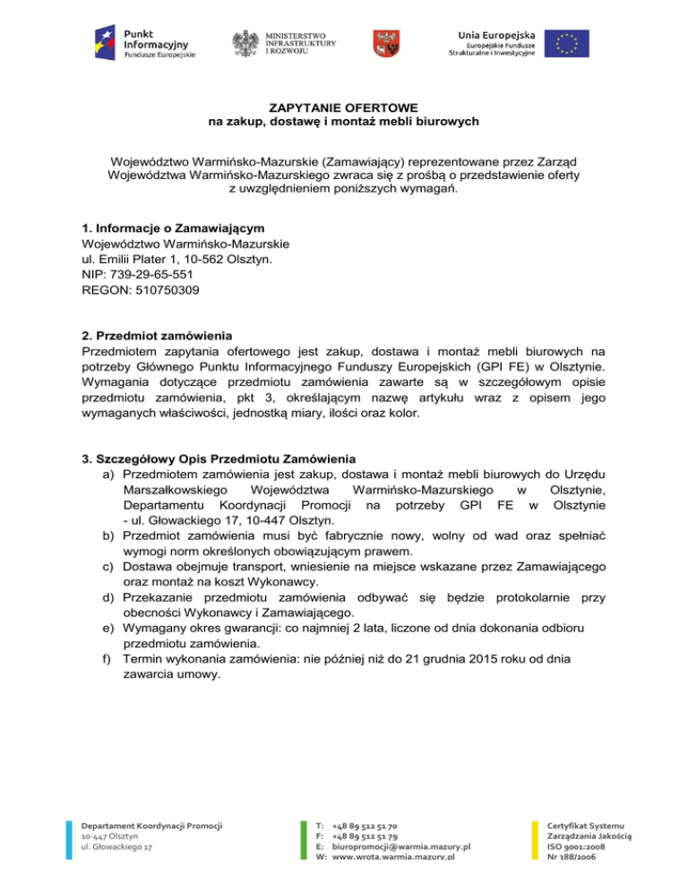 ZAPYTANIE OFERTOWE na zakup, dostawę i montaż mebli biurowych Województwo Warmińsko-Mazurskie (Zamawiający) reprezentowane przez Zarząd Województwa Warmińsko-Mazurskiego zwraca się z prośbą o przedstawienie oferty z uwzględnieniem poniższych wymagań. 1. Informacje o Zamawiającym Województwo Warmińsko-Mazurskie ul. Emilii Plater 1, 10-562 Olsztyn. NIP: 739-29-65-551 REGON: 510750309 2. Przedmiot zamówienia Przedmiotem zapytania ofertowego jest zakup, dostawa i montaż mebli biurowych na potrzeby Głównego Punktu Informacyjnego Funduszy Europejskich (GPI FE) w Olsztynie. Wymagania dotyczące przedmiotu zamówienia zawarte są w szczegółowym opisie przedmiotu zamówienia, pkt 3, określającym nazwę artykułu wraz z opisem jego wymaganych właściwości, jednostką miary, ilości oraz kolor. 3. Szczegółowy Opis Przedmiotu Zamówienia a) Przedmiotem zamówienia jest zakup, dostawa i montaż mebli biurowych do Urzędu Marszałkowskiego Województwa Warmińsko-Mazurskiego w Olsztynie, Departamentu Koordynacji Promocji na potrzeby GPI FE w Olsztynie - ul. Głowackiego 17, 10-447 Olsztyn. b) Przedmiot zamówienia musi być fabrycznie nowy, wolny od wad oraz spełniać wymogi norm określonych obowiązującym prawem. c) Dostawa obejmuje transport, wniesienie na miejsce wskazane przez Zamawiającego oraz montaż na koszt Wykonawcy. d) Przekazanie przedmiotu zamówienia odbywać się będzie protokolarnie przy obecności Wykonawcy i Zamawiającego. e) Wymagany okres gwarancji: co najmniej 2 lata, liczone od dnia dokonania odbioru przedmiotu zamówienia. f) Termin wykonania zamówienia: nie później niż do 21 grudnia 2015 roku od dnia zawarcia umowy. Departament Koordynacji Promocji 10-447 Olsztyn ul. Głowackiego 17 T: F: E: W: +48 89 512 51 70 +48 89 512 51 79 [email protected] www.wrota.warmia.mazury.pl Certyfikat Systemu Zarządzania Jakością ISO 9001:2008 Nr 388/2006 Nr Przedmiot zamówienia 1 Biurko 4 osobowe 2 Dostawka do biurka 3 Kontener Ilość w sztukach Opis zamówienia Biurko dla 4 pracowników w formie "lady" do obsługi klienta. Jedno duże biurko tworzą 4 biurka prostokątne o wymiarach gabarytowych: wysokość 720 mm, szerokość 1400 mm, głębokość 750 mm każde, oddzielone przepierzeniami z pleksi (bezbarwna, matowa). Każde stanowisko wyposażone w wysuwaną półkę na klawiaturę (4 szt.). Biurka mają być połączone płytą w tym samym kolorze co biurka. Płyta musi być stabilnie przymocowana do biurka i pleksi z możliwością łatwego demontażu w przypadku zmiany ustawienia biurek. Do każdego biurka musi być przymocowana dostawka, która została opisana w pkt. 2 tabeli. Kolor: Klon. Poniżej znajduje się rysunek przedstawiający projekt biurka 4 osobowego: Uwaga!!! - wprowadza się tolerancję odchylenia od przedstawionych powyżej wymiarów +/- 50 mm z zastrzeżeniem, że wszystkie 4 biurka tworzące jedno duże biurko dla 4 pracowników będą posiadały takie same gabaryty. Do każdego z 4 biurek tworzących 1 duże biurko (opis w pkt. 1 tabeli) musi być przymocowana dostawka zaokrąglona, na jednej metalowej nodze rurowej o średnicy 60 mm w kolorze stalowym. Promień (a) dostawki (blatu) 400 mm. W pkt. 1 tabeli został zamieszczony rysunek, na który naniesiony został sposób przymocowania dostawek. Kolor: Klon. Kontener o wymiarach gabarytowych: wysokość 550 mm, szerokość 430 mm, głębokość 450 mm; klamki w kolorze stalowym; wyposażony w 3 szuflady, wysuwane na prowadnicach metalowych oraz zamontowane kółka jezdne; szuflady zamykane na centralny zamek; kolor: Klon. Uwaga!!! - wprowadza się tolerancję odchylenia od przedstawionych powyżej wymiarów +/- 50 mm z zastrzeżeniem, że wszystkie 4 kontenery będą posiadały takie same gabaryty. Departament Koordynacji Promocji 10-447 Olsztyn ul. Głowackiego 17 T: F: E: W: +48 89 512 51 70 +48 89 512 51 79 [email protected] www.wrota.warmia.mazury.pl 1 4 4 Certyfikat Systemu Zarządzania Jakością ISO 9001:2008 Nr 388/2006 4 Biurko pod laptop 5 Krzesło obrotowe Biurko pod laptop na 4 metalowych nogach rurowych o średnicy 60 mm (kolor stalowy) z 2 przepustkami o wymiarach gabarytowych: wysokość 720 mm, szerokość 1000 mm głębokość 750 mm. Kolor blatu: Klon Uwaga!!! - wprowadza się tolerancję odchylenia od przedstawionych powyżej wymiarów +/- 50 mm. Krzesło obrotowe dla osoby dorosłej z regulowaną wysokością wyposażone w podłokietniki; podstawa pięcioramienna na kółkach jezdnych; tapicerowane; kolor tapicerki: granatowy. Każde z 3 krzeseł musi być takie same (takie same wymiary, odcień koloru). Fotel do poczekalni jednoosobowy, dla osoby dorosłej, obicie: ekoskóra, kolor: granatowy. Każdy z 3 foteli musi być taki sam (takie same wymiary, odcień koloru). Poniżej zaprezentowany jest przykładowy rysunek fotela: 9 9 10 Drewniana ława do poczekalni, prostokątna o wymiarach gabarytowych: wysokość 550 mm, szerokość 1000 mm głębokość Ława 600 mm, drewniana, nogi ławy drewniane. Kolor: Klon. Uwaga!!! - wprowadza się tolerancję odchylenia od przedstawionych powyżej wymiarów +/- 50 mm. Wieszak na ubrania stojący. Wieszak musi posiadać wypustki do zawieszenia okryć wierzchnich oraz miejsce na parasole. Kolor Wieszak na ubrania czarny. Każdy z 2 wieszaków musi być taki sam (takie same wymiary, odcień koloru). Stół konferencyjny o wymiarach gabarytowych: wysokość 720 mm, szerokość 1600 mm głębokość 800 mm. Kolor: Klon. Nogi stołu w kolorze stalowym. Stół musi być wyposażony w mechanizm pozwalający na jego złożenie (po złożeniu nóg od stołu jego blat nie zmienia swojego Stół konferencyjny rozmiaru). Uwaga!!! - wprowadza się tolerancję odchylenia od przedstawionych powyżej wymiarów +/- 50 mm z zastrzeżeniem, że wszystkie 4 stoły konferencyjne będą posiadały takie same gabaryty. Krzesło tapicerowane konferencyjne dla jednej dorosłej osoby, kolor tapicerki: granatowy. Uwaga!!! Krzesło tapicerowane