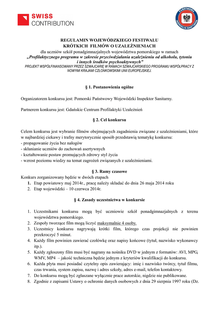 REGULAMIN WOJEWÓDZKIEGO FESTIWALU KRÓTKICH FILMÓW O UZALEŻNIENIACH dla uczniów szkół ponadgimnazjalnych województwa pomorskiego w ramach „Profilaktycznego programu w zakresie przeciwdziałania uzależnieniu od alkoholu, tytoniu i innych środków psychoaktywnych” PROJEKT WSPÓŁFINANSOWANY PRZEZ SZWAJCARIĘ W RAMACH SZWAJCARSKIEGO PROGRAMU WSPÓŁPRACY Z NOWYMI KRAJAMI CZŁONKOWSKIMI UNII EUROPEJSKIEJ. § 1. Postanowienia ogólne Organizatorem konkursu jest: Pomorski Państwowy Wojewódzki Inspektor Sanitarny. Partnerem konkursu jest: Gdańskie Centrum Profilaktyki Uzależnień § 2. Cel konkursu Celem konkursu jest wybranie filmów obejmujących zagadnienia związane z uzależnieniami, które w najbardziej ciekawy i trafny merytorycznie sposób przedstawią tematykę konkursu: - propagowanie życia bez nałogów - skłanianie uczniów do zachowań asertywnych - kształtowanie postaw promujących zdrowy styl życia - wzrost poziomu wiedzy na temat zagrożeń związanych z uzależnieniami. § 3. Ramy czasowe Konkurs zorganizowany będzie w dwóch etapach 1. Etap powiatowy maj 2014r., pracę należy składać do dnia 26 maja 2014 roku 2. Etap wojewódzki – 10 czerwca 2014r. § 4. Zasady uczestnictwa w konkursie 1. Uczestnikami konkursu mogą być uczniowie szkół ponadgimnazjalnych z terenu województwa pomorskiego. 2. Zespoły tworzące film mogą liczyć maksymalnie 4 osoby. 3. Uczestnicy konkursu nagrywają krótki film, którego czas projekcji nie powinien przekroczyć 5 minut. 4. Każdy film powinien zawierać czołówkę oraz napisy końcowe (tytuł, nazwisko wykonawcy itp.). 5. Każdy zgłoszony film musi być nagrany na nośniku DVD w jednym z formatów: AVI, MPG, WMV, MP4 – jakość techniczna będzie jednym z kryteriów kwalifikacji do konkursu. 6. Każda płyta musi posiadać czytelny opis zawierający: imię i nazwisko twórcy, tytuł filmu, czas trwania, system zapisu, nazwę i adres szkoły, adres e-mail, telefon kontaktowy. 7. Do konkursu mogą być zgłaszane wyłącznie prace autorskie, nigdzie nie publikowane. 8. Zgodnie z zapisami Ustawy o ochronie danych osobowych z dnia 29 sierpnia 1997 roku (Dz. U. z 2002r., Nr 101, poz. 926 z późn. zm.) każdy uczestnik wyraża zgodę na przetwarzanie danych osobowych dla potrzeb konkursu oraz wyraża zgodę na wykorzystanie zdjęć i nagrań ze swoim wizerunkiem w materiałach promocyjnych i umieszczeniem ich na stronie internetowej Organizatora (www.wsse.gda.pl) i Projektu „Profilaktyczny program w zakresie przeciwdziałania uzależnieniu od alkoholu, tytoniu i innych środków psychoaktywnych: (www.zdrowiewciazy.pl). 9. Prace złożone po terminie określonym w § 3, nie będą dopuszczone do konkursu. § 5. Terminarz konkursu: 1. Konkurs odbywa się na poziomie powiatowym i wojewódzkim. 2. Prace przekazywane są pocztą (decyduje data stempla pocztowego) lub osobiście (decyduje data złożenia) w następujący sposób: uczestnicy przekazują do Powiatowej Stacji Sanitarno-Epidemiologicznej, zwanej dalej „PSSE", jedną pracę w terminie do 26 maja 2014r pracownik „PSSE” przekazuje do Wojewódzkiej Stacji Sanitarno-Epidemiologicznej, zwanej dalej „WSSE" jedną pracę, która zajęła I miejsce w etapie powiatowym konkursu, w terminie do 3 czerwca 2014r. Określa się następujący czas rozstrzygnięcia konkursu: poziom powiatowy w terminie 2 czerwca 2014r. poziom wojewódzki 10 czerwca 2014r. § 6. Kryteria oceny Komisji Konkursowej 1. Prace będą oceniane z uwzględnieniem następujących kryteriów: zgodność z regulaminem czytelność przekazu pomysłowość projektu jakość techniczna zastosowane efekty oraz sposób montażu. 2. Prace, które nie spełnią zasad określonych w § 4 nie będą ocenione. § 7. Nagrody konkursowe Na każdym z etapów konkursu wyłania się następującą liczbę laureatów, odpowiednio: • na etapie powiatowym 1 laureat • na etapie wojewódzkim 3 laureatów (I, II. III miejsce), 2 wyróżnienia Rodzaje nagród przyznawanych na poszczególnych etapach konkursu: a) powiatowym – dyplomy dla laureatów, b) wojewódzkim – zamieszczenie informacji na stronie internetowej Wojewódzkiej Stacji Sanitarno-Epidemiologicznej oraz nagrody rzeczowe uzależnione od zajętego miejsca: I miejsce: dyplom, statuetka dla zespołu oraz nagrody rzeczowe o wartości 400,00 zł dla każdego uczestnika - II miejsca - dyplom, statuetka dla zespołu oraz nagrody rzeczowe o wartości 300,00 zł dla każdego uczestnika - III miejsce - dyplom, statuetka dla zespołu oraz nagrody rzeczowe o wartości 200,00 zł dla każdego uczestnika - 2 wyróżnienia – dyplom dla zespołu oraz nagroda rzeczowa o wartości 100,00 zł dla każdego uczestnika. Organizatorzy zastrzegają sobie prawo do zmiany nagród na równorzędne lub do zmiany podziału nagród w związku z ustaleniami podjętymi w czasie obrad Komisji Konkursowej. § 8. Prawa autorskie 1. Z chwilą przystąpienia do konkursu Organizator nabywa na zasadzie wyłączności, nieodpłatnie autorskie prawa majątkowe i prawa pokrewne do nieograniczonego w czasie korzystania i rozporządzania dziełem. 2. Zespół autorski filmu posiada zgodę każdej osoby występującej w filmie do publikacji filmu na wszelkich polach eksploatacji. 3. Film nie został wykonany przez Zespół na odpłatne zlecenie. 4. Film nie jest reklamą lub antyreklamą produktu lub marki (nie pokazuje logotypów i marek produktów, sprzętu itp.). 5. Przekazanie praw autorskich zostanie potwierdzone na piśmie; umowa zostanie zawarta po wyłonieniu zwycięskich prac. § 9. Pozostałe ustalenia Decyzja Komisji Konkursowej jest ostateczna i nie podlega odwołaniu. Organizatorzy mogą przerwać lub odwołać konkurs bez podania przyczyn. Niniejszy regulamin jest jedynym dokumentem określającym zasady konkursu. W sytuacjach nie objętych regulaminem rozstrzygają organizatorzy. Organizator nie zwraca kosztów poniesionych w związku z uczestnictwem w Konkursie. Zespoł