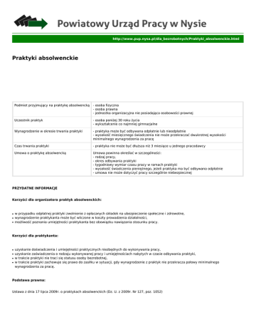 http://www.pup.nysa.pl/dla_bezrobotnych/Praktyki_absolwenckie.html Praktyki absolwenckie PRAKTYKA ABSOLWENCKA – ma na celu ułatwienie absolwentom uzyskania doświadczenia i nabywania umiejętności praktycznych niezbędnych do wykonywania pracy. Odbywa się ona na postawie umowy zawartej między praktykantem a podmiotem przyjmującym na praktykę. Podmiot przyjmujący na praktykę absolwencką - osoba fizyczna - osoba prawna - jednostka organizacyjna nie posiadająca osobowości prawnej Uczestnik praktyk - osoba poniżej 30 roku życia - wykształcenie co najmniej gimnazjalne Wynagrodzenie w okresie trwania praktyki - praktyka może być odbywana odpłatnie lub nieodpłatnie - wysokość miesięcznego świadczenia nie może przekraczać dwukrotnej wysokości minimalnego wynagrodzenia za pracę Czas trwania praktyki - praktyka nie może być dłuższa niż 3 miesiące u jednego pracodawcy Umowa o praktykę absolwencką Umowa powinna określać w szczególności: - rodzaj pracy, - okres odbywania praktyki - tygodniowy wymiar czasu pracy w ramach praktyki - wysokość świadczenia pieniężnego, jeżeli praktyka ma być odbywana odpłatnie - umowa nie może dotyczyć pracy szczególnie niebezpiecznej PRZYDATNE INFORMACJE Korzyści dla organizatora praktyk absolwenckich: ● ● ● w przypadku odpłatnej praktyki zwolnienie z opłacanych składek na ubezpieczenie społeczne i zdrowotne, wynagrodzenie praktykanta może być wliczone w koszty prowadzenia działalności, możliwość poznania umiejętności praktykanta bez obowiązku nawiązania stosunku pracy. Korzyści dla praktykanta: ● ● ● ● uzyskanie doświadczenia i umiejętności praktycznych niezbędnych do wykonywania pracy, uzyskanie zaświadczenia o rodzaju wykonywanej pracy i umiejętnościach nabytych w czasie odbywania praktyki, w trakcie praktyki nie traci się statusu osoby bezrobotnej, w trakcie praktyki zachowuje się prawo do zasiłku w sytuacji, gdy wynagrodzenie z praktyk nie przekracza połowy minimalnego wynagrodzenia za pracę. Podstawa prawna: Ustawa z dnia 17 lipca 2009r. o praktykach absolwenckich (Dz. U. z 2009r. Nr 127, poz. 1052) Ogłoszenie w sprawie PRAKTYK ABSOLWENCKICH Absolwencie, jeżeli chcesz zwiększyć swoje szanse na rynku pracy i wykazać się doświadczeniem zawodowym wymaganym w trakcie naboru do pracy, zgłoś się do Urzędu Skarbowego w Nysie. Naczelnik Urzędu Skarbowego w Nysie zaprasza kandydatów do odbycia nieodpłatnej praktyki absolwenckiej na zasadach określonych w ustawie z dnia 17 lipca 2009 r. o praktykach absolwenckich (Dz.U z 2009r. Nr 127, poz. 1052) w Urzędzie Skarbowym w Nysie. Wymagania: Oferta skierowana jest do osób, które posiadają co najmniej średnie wyształcenie (mile widziane wykształcenie wyższe), są absolwentami i nie ukończyły 30 roku życia w dniu rozpoczęcia praktyki. Praktyka absolwencka odbywać się będzie bezpłatnie na stanowiskach zaliczonych do stanowisk urzędniczych w służbie cywilnej w dniach od poniedziałku do piątku w godz. od 7:00 do 15:00 na podstawie pisemnej umowy przez okres 3 miesięcy. Odbycie praktyki stanowi możliwość do nabycia umiejętności praktycznych na stanowiskach urzędniczych i pracy administracyjno-biurowej, poznania zasad funkcjonowania administracji publicznej oraz nabycie umiejętności profesjonalnej obsługi klienta, a tym samym zwiększenia swoich szans na rynku pracy. Szczegóły dotyczące zasad organizacji praktyk absolwenckich zawarte są na stronie BIP Urzędu Skarbowego w Nysie: www.bip.us-nysa.biuletyn.info.pl, w zakładce "Praktyki absolwenckie". Nabór na praktyki prowadzony jest w sposób ciągły. Kandydaci proszeni są o przesyłanie zgłoszeń na praktykę absolwencką na adres: Urząd Skarbowy w Nysie, pok. 316, ul .Krzywoustego 23, 48-300 Nysa z adnotacją na kopercie "praktyka absolwencka"
