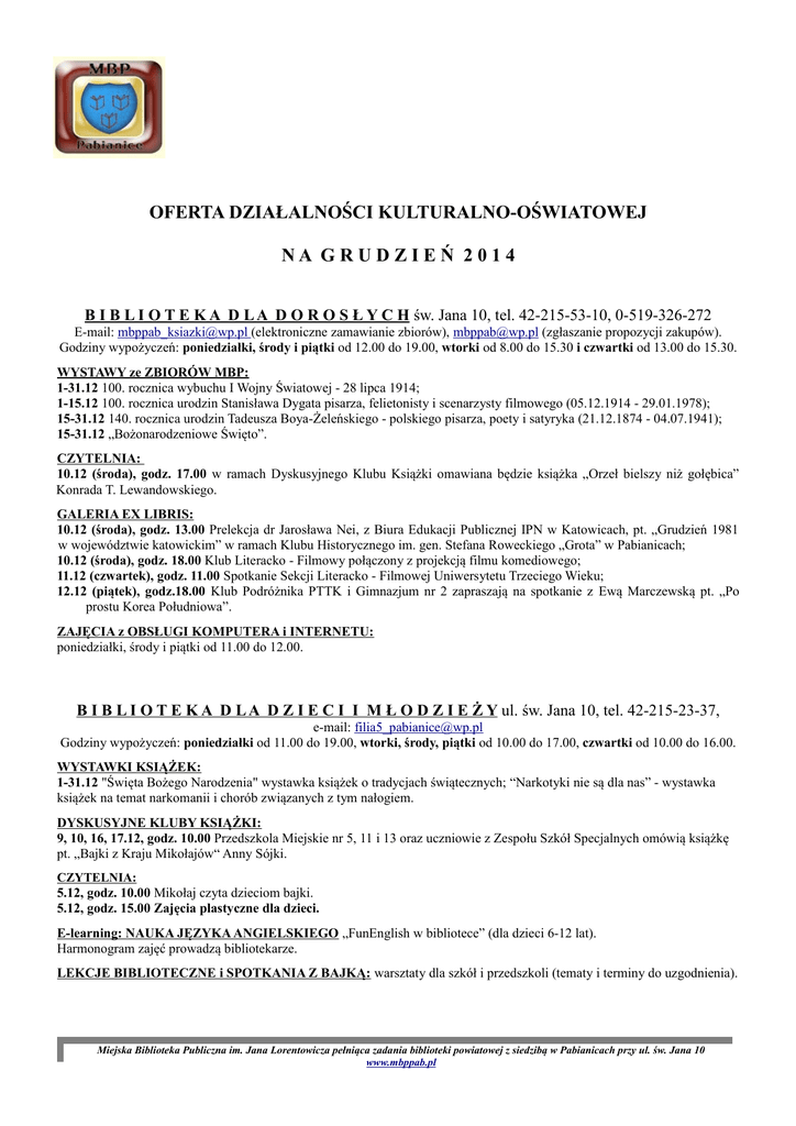 OFERTA DZIAŁALNOŚCI KULTURALNO-OŚWIATOWEJ NA GRUDZIEŃ 2014 B I B L I O T E K A D L A D O R O S Ł Y C H św. Jana 10, tel. 42-215-53-10, 0-519-326-272 E-mail: [email protected] (elektroniczne zamawianie zbiorów), [email protected] (zgłaszanie propozycji zakupów). Godziny wypożyczeń: poniedziałki, środy i piątki od 12.00 do 19.00, wtorki od 8.00 do 15.30 i czwartki od 13.00 do 15.30. WYSTAWY ze ZBIORÓW MBP: 1-31.12 100. rocznica wybuchu I Wojny Światowej - 28 lipca 1914; 1-15.12 100. rocznica urodzin Stanisława Dygata pisarza, felietonisty i scenarzysty filmowego (05.12.1914 - 29.01.1978); 15-31.12 140. rocznica urodzin Tadeusza Boya-Żeleńskiego - polskiego pisarza, poety i satyryka (21.12.1874 - 04.07.1941); 15-31.12 „Bożonarodzeniowe Święto”. CZYTELNIA: 10.12 (środa), godz. 17.00 w ramach Dyskusyjnego Klubu Książki omawiana będzie książka „Orzeł bielszy niż gołębica” Konrada T. Lewandowskiego. GALERIA EX LIBRIS: 10.12 (środa), godz. 13.00 Prelekcja dr Jarosława Nei, z Biura Edukacji Publicznej IPN w Katowicach, pt. „Grudzień 1981 w województwie katowickim” w ramach Klubu Historycznego im. gen. Stefana Roweckiego „Grota” w Pabianicach; 10.12 (środa), godz. 18.00 Klub Literacko - Filmowy połączony z projekcją filmu komediowego; 11.12 (czwartek), godz. 11.00 Spotkanie Sekcji Literacko - Filmowej Uniwersytetu Trzeciego Wieku; 12.12 (piątek), godz.18.00 Klub Podróżnika PTTK i Gimnazjum nr 2 zapraszają na spotkanie z Ewą Marczewską pt. „Po prostu Korea Południowa”. ZAJĘCIA z OBSŁUGI KOMPUTERA i INTERNETU: poniedziałki, środy i piątki od 11.00 do 12.00. B I B L I O T E K A D L A D Z I E C I I M Ł O D Z I E Ż Y ul. św. Jana 10, tel. 42-215-23-37, e-mail: [email protected] Godziny wypożyczeń: poniedziałki od 11.00 do 19.00, wtorki, środy, piątki od 10.00 do 17.00, czwartki od 10.00 do 16.00. WYSTAWKI KSIĄŻEK: 1-31.12 "Święta Bożego Narodzenia" wystawka książek o tradycjach świątecznych; “Narkotyki nie są dla nas” - wystawka książek na temat narkomanii i chorób związanych z tym nałogiem. DYSKUSYJNE KLUBY KSIĄŻKI: 9, 10, 16, 17.12, godz. 10.00 Przedszkola Miejskie nr 5, 11 i 13 oraz uczniowie z Zespołu Szkół Specjalnych omówią książkę pt. „Bajki z Kraju Mikołajów“ Anny Sójki. CZYTELNIA: 5.12, godz. 10.00 Mikołaj czyta dzieciom bajki. 5.12, godz. 15.00 Zajęcia plastyczne dla dzieci. E-learning: NAUKA JĘZYKA ANGIELSKIEGO „FunEnglish w bibliotece” (dla dzieci 6-12 lat). Harmonogram zajęć prowadzą bibliotekarze. LEKCJE BIBLIOTECZNE i SPOTKANIA Z BAJKĄ: warsztaty dla szkół i przedszkoli (tematy i terminy do uzgodnienia). Miejska Biblioteka Publiczna im. Jana Lorentowicza pełniąca zadania biblioteki powiatowej z siedzibą w Pabianicach przy ul. św. Jana 10 www.mbppab.pl F I L I A N R 2, ul. Łaska 46/48, tel. 42-215-76-26, 0- 519-326-273, e-mail: [email protected] Godziny wypożyczeń: poniedziałki, środy i piątki od 12.00 do 19.00, wtorki od 8.00 do 15.00 i czwartki od 13.00 do 16.00 WYSTAWKI KSIĄŻEK: 2-12.12 Książki dla kibiców z okazji Światowego Dnia Piłki Nożnej; 15-31.12 Świąteczne klimaty. DYSKUSYJNE KLUBY KSIĄŻKI: - dla dorosłych 3.12 (środa), godz. 17.00 omawiana będzie książka Zygmunta Miłoszewskiego „Ziarno prawdy“; - dla dzieci z PM nr 12 4.12 (czwartek), godz 10.00 czytana i omawiana będzie książka Axela Hacke „Maleńki Król Grudzień“; - dla PSnROzUU 11.12 (czwartek), godz. 10.00 czytane i omawiane będą fragmenty książki Leo Buscaglii „Jesień liścia Jasia”. LEKCJE BIBLIOTECZNE, WARSZTATY „DETEKTYW KSIĄŻKOWY“, SPOTKANIA Z BAJKĄ: dla szkół i przedszkoli (tematy i terminy do uzgodnienia). F I L I A N R 4, ul. 20 Stycznia 14, tel. 42-215-02-74, e-mail: [email protected] Godziny wypożyczeń: poniedziałki, środy i piątki od 12.00 do 19.00, wtorki od 8.00 do 15.00 i czwartki od 13.00 do 15.30 WYSTAWY KSIĄŻEK: 1-30.12 140. rocznica urodzin Tadeusza Boya-Żeleńskiego; 120. rocznica śmierci Roberta Louisa Stevensona. E-learning: NAUKA JĘZYKA ANGIELSKIEGO „FunEnglish w bibliotece” (dla dzieci 6-12 lat). Harmonogram zajęć prowadzą bibliotekarze. DYSKUSYJNY KLUB KSIĄŻKI: 16.12 (wtorek), godz. 9.30 DKK dla grupy z PM nr 15, omawiana będzie książka „Czarownica i zimowe szaleństwa“ Mai Strzebońskiej; 19.12 (piątek), godz. 17.00 Omawiana będzie książka „Pół życia“ Jodi Picoult. KONSULTACJE KOMPUTEROWE: w środy godz. 11.00-12.00. LEKCJE BIBLIOTECZNE i SPOTKANIA Z BAJKĄ: dla szkół i przedszkoli (tematy i terminy do uzgodnienia). F I L I A N R 6, ul. Jana Pawła II nr 68, tel. 42-22-53-609, 0-519-326-271, e-mail: [email protected] Godziny wypożyczeń: poniedziałki od 9.30 do 17.30, wtorki, środy, piątki od 9.00 do 15.00, czwartki od 9.00 do 16.00 WYSTAWKI KSIĄŻEK: 1-17.12 100. rocznica urodzin Stanisława Dygata; 18-31.12 60. rocznica śmierci Zofii Nałkowskiej. ZAJĘCIA Z KSIĄŻKĄ w WTZ: 10.12, godz. 13.00 „Popularne zawody”. Biblioteki ponadto oferują: katalog komputerowy zbiorów, rezerwacje, zamówienia, prolongaty wypożyczeń i zapisy do MBP także online na: http://www.pabianice-mbp.sowwwa.pl/, dostarczanie książek do domów osób przewlekle chorych, bądź niepełnosprawnych, e-learningową naukę języka angielskiego "FunEnglish" (dla dzieci 6-12 lat), bezpłatny INTERNET (także bezprzewodowy), kserowanie, skanowanie i drukowanie, recenzje, blogi, informacje o nowościach wydawniczych na: www.w.bibliotece.pl, darmowy dostęp do czytelni książek elektronicznych poprzez: www.libra.ibuk.pl, możliwość korzystania na miejscu i wypożyczania zbiorów multimedialnych (film, muzyka i książki „mówione”), gry planszowe i komputerowe dla dzieci i młodzieży, bibliografię regionalną, czasopisma bieżące i archiwalne oraz kiermasze książek. Miejska Biblioteka Publiczna im. Jana Lorentowicza pełniąca zadania biblioteki powiatowej z siedzibą w Pabianicach pr