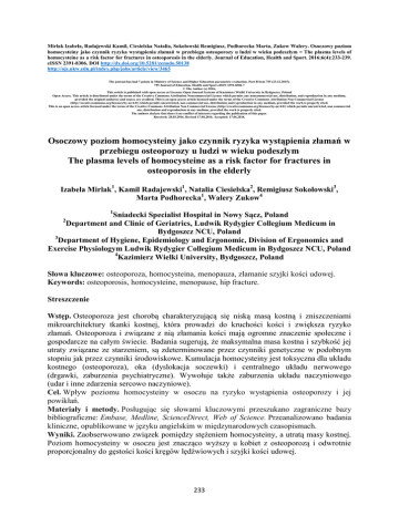 Mirlak Izabela, Radajewski Kamil, Ciesielska Natalia, Sokołowski Remigiusz, Podhorecka Marta, Zukow Walery. Osoczowy poziom homocysteiny jako czynnik ryzyka wystąpienia złamań w przebiegu osteoporozy u ludzi w wieku podeszłym = The plasma levels of homocysteine as a risk factor for fractures in osteoporosis in the elderly. Journal of Education, Health and Sport. 2016;6(4):233-239. eISSN 2391-8306. DOI http://dx.doi.org/10.5281/zenodo.50138 http://ojs.ukw.edu.pl/index.php/johs/article/view/3465 The journal has had 7 points in Ministry of Science and Higher Education parametric evaluation. Part B item 755 (23.12.2015). 755 Journal of Education, Health and Sport eISSN 2391-8306 7 © The Author (s) 2016; This article is published with open access at Licensee Open Journal Systems of Kazimierz Wielki University in Bydgoszcz, Poland Open Access. This article is distributed under the terms of the Creative Commons Attribution Noncommercial License which permits any noncommercial use, distribution, and reproduction in any medium, provided the original author(s) and source are credited. This is an open access article licensed under the terms of the Creative Commons Attribution Non Commercial License (http://creativecommons.org/licenses/by-nc/4.0/) which permits unrestricted, non commercial use, distribution and reproduction in any medium, provided the work is properly cited. This is an open access article licensed under the terms of the Creative Commons Attribution Non Commercial License (http://creativecommons.org/licenses/by-nc/4.0/) which permits unrestricted, non commercial use, distribution and reproduction in any medium, provided the work is properly cited. The authors declare that there is no conflict of interests regarding the publication of this paper. Received: 20.03.2016. Revised 17.04.2016. Accepted: 17.04.2016. Osoczowy poziom homocysteiny jako czynnik ryzyka wystąpienia złamań w przebiegu osteoporozy u ludzi w wieku podeszłym The plasma levels of homocysteine as a risk factor for fractures in osteoporosis in the elderly Izabela Mirlak1, Kamil Radajewski1, Natalia Ciesielska2, Remigiusz Sokołowski3, Marta Podhorecka1, Walery Zukow4 1 Sniadecki Specialist Hospital in Nowy Sącz, Poland Department and Clinic of Geriatrics, Ludwik Rydygier Collegium Medicum in Bydgoszcz NCU, Poland 3 Department of Hygiene, Epidemiology and Ergonomic, Division of Ergonomics and Exercise Physiologym Ludwik Rydygier Collegium Medicum in Bydgoszcz NCU, Poland 4 Kazimierz Wielki University, Bydgoszcz, Poland 2 Słowa kluczowe: osteoporoza, homocysteina, menopauza, złamanie szyjki kości udowej. Keywords: osteoporosis, homocysteine, menopause, hip fracture. Streszczenie Wstęp. Osteoporoza jest chorobą charakteryzującą się niską masą kostną i zniszczeniami mikroarchitektury tkanki kostnej, która prowadzi do kruchości kości i zwiększa ryzyko złamań. Osteoporoza i związane z nią złamania kości mają ogromne znaczenie społeczne i gospodarcze na całym świecie. Badania sugerują, że maksymalna masa kostna i szybkość jej utraty związane ze starzeniem, są zdeterminowane przez czynniki genetyczne w podobnym stopniu jak przez czynniki środowiskowe. Kumulacja homocysteiny jest toksyczna dla układu kostnego (osteoporoza), oka (dyslokacja soczewki) i centralnego układu nerwowego (drgawki, zaburzenia psychiatryczne). Wywołuje także zaburzenia układu naczyniowego (udar i inne zdarzenia sercowo naczyniowe). Cel. Wpływ poziomu homocysteiny w osoczu na ryzyko wystąpienia osteoporozy i jej powikłań. Materiały i metody. Posługując się słowami kluczowymi przeszukano zagraniczne bazy bibliograficzne: Embase, Medline, ScienceDirect, Web of Science. Przeanalizowano badania kliniczne, opublikowane w języku angielskim w międzynarodowych czasopismach. Wyniki. Zaobserwowano związek pomiędzy stężeniem homocysteiny, a utratą masy kostnej. Poziom homocysteiny w osoczu jest znacząco wyższy u kobiet z osteoporozą i odwrotnie proporcjonalny do gęstości kości kręgów lędźwiowych i szyjki kości udowej. 233 Wnioski. Osoczowy poziom homocysteiny jest czynnikiem ryzyka wystąpienia złamań w przebiegu osteoporozy u ludzi w wieku podeszłym. Abstract Admission. Osteoporosis is a disease characterized by low bone mass and microarchitectural damage of bone tissue which leads to bone fragility and increased risk of fracture. Osteoporosis and related fractures are of great social and economic importance throughout the world. Studies suggest that the maximum bone mass and the rate of loss associated with aging are determined by genetic factors to a similar as by environmental factors. Accumulation of homocysteine is toxic to the bone (osteoporosis), the eye (the dislocation of the lens), and central nervous system disorders (seizures, psychiatric disorders). Also causes vascular disorders (stroke and other cardiovascular events). Objective. Effect of plasma homocysteine level at risk for osteoporosis and its complications. Systematic review. Materials and methods. Using the keywords searched foreign bibliographic databases: Embase, Medline, ScienceDirect, Web of Science. We analyzed clinical trials published in English in international journals. Results. A correlation between homocysteine and bone loss. Homocysteine levels in plasma are significantly higher in women with osteoporosis and inversely proportional to the bone density of lumbar vertebrae and hip. Conclusions. The plasma levels of homocysteine is a risk factor for fractures in osteoporosis in the elderly. Wstęp. Homocysteina jest białkiem, powstającym z demetylacji metioniny pochodzącej ze spożytego białka znajdującego się w mięsie i nabiale. Kumulacja homocysteiny jest toksyczna dla układu kostnego (osteoporoza), oka (dyslokacja soczewki) i centralnego układu nerwowego (drgawki, zaburzenia psychiatryczne). Wpływa także niekorzystnie na układ sercowonaczyniowy (udar mózgu i inne zdarzenia sercowo naczyniowe).[1