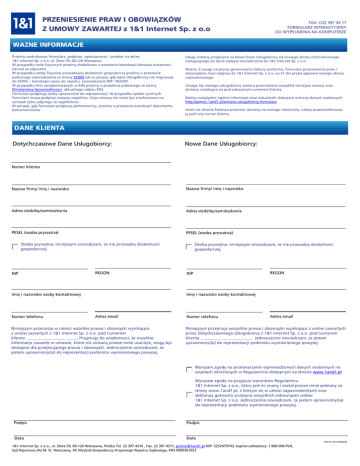 PRZENIESIENIE PRAW I OBOWIĄZKÓW Z UMOWY ZAWARTEJ z 1&1 Internet Sp. z o.o FAX: (22) 397 43 17 FORMULARZ INTERAKTYWNY DO WYPEŁNIENIA NA KOMPUTERZE WAŻNE INFORMACJE Prosimy wydrukować formularz, podpisać, opieczętować i przesłać na adres: 1&1 Internet Sp. z o.o. ul. Złota 59, 00-120 Warszawa. W przypadku osób fizycznych prosimy dodatkowo o przesłanie kserokopii dowodu tożsamości (strona ze zdjęciem). W przypadku osoby fizycznej prowadzącej działalność gospodarczą prosimy o przesłanie pobranego zaświadczenia ze strony CEIDG lub w sytuacji, gdy dane Usługobiorcy nie migrowały do CEIDG – kserokopii wpisu do rejestru, zaświadczenia NIP i REGON. W przypadku firm zarejestrowanych w KRS prosimy o przesłanie pobranego ze strony Ministerstwa Sprawiedliwości aktualnego odpisu KRS. Formularz podpisują osoby uprawnione do reprezentacji. W przypadku spółek cywilnych formularz muszą podpisać wszyscy wspólnicy. Cesja umowy nie może być zrealizowana na wniosek tylko jedynego ze wspólników. W sytuacji, gdy formularz podpisują pełnomocnicy, prosimy o przesłanie kserokopii dokumentu pełnomocnictwa. Usługi zostaną przepisane na Nowe Dane Usługobiorcy od nowego okresu rozliczeniowego następującego po dacie wpływu oświadczenia do 1&1 Internet Sp. z o.o. Ważne: Z uwagi na proces generowania faktury proforma, formularz przeniesienia praw i obowiązków musi wpłynąć do 1&1 Internet Sp. z o.o. na 21 dni przed upływem starego okresu rozliczeniowego. Uwaga: Na nowego usługobiorcę zostaną przeniesione wszystkie istniejące umowy oraz domeny znajdujące się pod wskazanym numerem klienta. Należy uwzględnić ogólne informacje oraz wskazówki dotyczące ochrony danych osobowych: http://pomoc.1and1.pl/zmiana-uslugobiorcy-formularz Jeżeli nie chcecie Państwo przenosić domeny na nowego właściciela, należy przetransferować ją pod inny numer klienta. DANE KLIENTA Dotychczasowe Dane Usługobiorcy: Nowe Dane Usługobiorcy: Numer klienta Nazwa firmy/ imię i nazwisko Nazwa firmy/ imię i nazwisko Adres siedziby/zamieszkania Adres siedziby/zamieszkania PESEL (osoba prywatna) PESEL (osoba prywatna) Osoba prywatna: niniejszym oświadczam, że nie prowadzę działalności gospodarczej NIP REGON Imię i nazwisko osoby kontaktowej Numer telefonu Osoba prywatna: niniejszym oświadczam, że nie prowadzę działalności gospodarczej REGON NIP Imię i nazwisko osoby kontaktowej Adres email Niniejszym przenoszę w całości wszelkie prawa i obowiązki wynikające z umów zawartych z 1&1 Internet Sp. z o.o. pod numerem klienta ________________________. Przyjmuję do wiadomości, że wszelkie informacje zawarte w umowie, które nie zostaną przeze mnie usunięte, mogą być dostępne dla przejmującego prawa i obowiązki. Jednocześnie oświadczam, że jestem uprawniony/(a) do reprezentacji podmiotu wymienionego powyżej. Numer telefonu Adres email Niniejszym przejmuję wszystkie prawa i obowiązki wynikające z umów zawartych przez Dotychczasowego Usługobiorcę z 1&1 Internet Sp. z o.o. pod numerem klienta ________________________. Jednocześnie oświadczam, że jestem uprawniony/(a) do reprezentacji podmiotu wymienionego powyżej. Wyrażam zgodę na przetwarzanie wprowadzonych danych osobowych na zasadach określonych w Regulaminie dostępnym na stronie www.1and1.pl Wyrażam zgodę na przyjęcie warunków Regulaminu 1&1 Internet Sp. z o.o., który jest mi znany i został przeze mnie pobrany ze strony www.1and1.pl, z którym się w całości zapoznałem/(am) oraz deklaruję gotowość przejęcia wszystkich zobowiązań wobec 1&1 Internet Sp. z o.o. Jednocześnie oświadczam, że jestem uprawniony/(a) do reprezentacji podmiotu wymienionego powyżej. Podpis Podpis Data Data WH-PL-2014-PNK04b 1&1 Internet Sp. z o.o., ul. Złota 59, 00-120 Warszawa, Polska Tel. 22 397 4316 , Fax. 22 397 4317, [email protected] NIP: 5252479743, kapitał zakładowy: 1 000 000 PLN, Sąd Rejonowy dla M. St. Warszawy, XII Wydział Gospodarczy Krajowego Rejestru Sądowego, KRS 0000361053