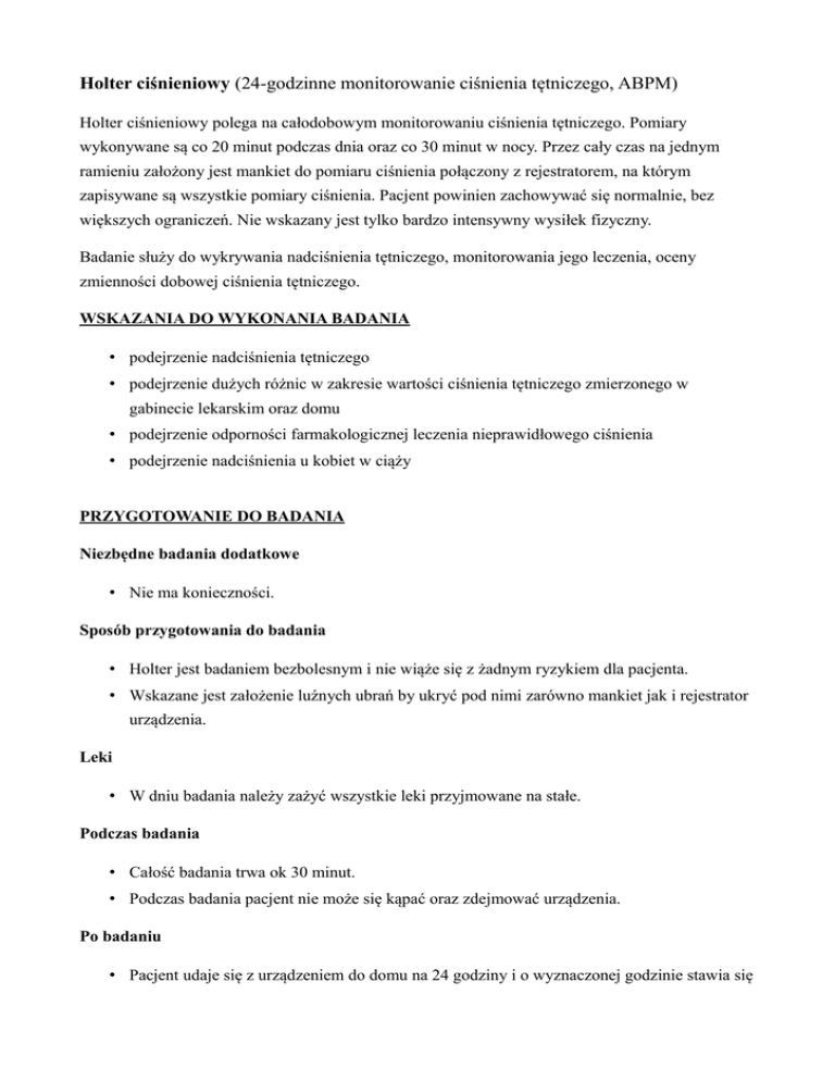 Holter ciśnieniowy (24-godzinne monitorowanie ciśnienia tętniczego, ABPM) Holter ciśnieniowy polega na całodobowym monitorowaniu ciśnienia tętniczego. Pomiary wykonywane są co 20 minut podczas dnia oraz co 30 minut w nocy. Przez cały czas na jednym ramieniu założony jest mankiet do pomiaru ciśnienia połączony z rejestratorem, na którym zapisywane są wszystkie pomiary ciśnienia. Pacjent powinien zachowywać się normalnie, bez większych ograniczeń. Nie wskazany jest tylko bardzo intensywny wysiłek fizyczny. Badanie służy do wykrywania nadciśnienia tętniczego, monitorowania jego leczenia, oceny zmienności dobowej ciśnienia tętniczego. WSKAZANIA DO WYKONANIA BADANIA • podejrzenie nadciśnienia tętniczego • podejrzenie dużych różnic w zakresie wartości ciśnienia tętniczego zmierzonego w gabinecie lekarskim oraz domu • podejrzenie odporności farmakologicznej leczenia nieprawidłowego ciśnienia • podejrzenie nadciśnienia u kobiet w ciąży PRZYGOTOWANIE DO BADANIA Niezbędne badania dodatkowe • Nie ma konieczności. Sposób przygotowania do badania • Holter jest badaniem bezbolesnym i nie wiąże się z żadnym ryzykiem dla pacjenta. • Wskazane jest założenie luźnych ubrań by ukryć pod nimi zarówno mankiet jak i rejestrator urządzenia. Leki • W dniu badania należy zażyć wszystkie leki przyjmowane na stałe. Podczas badania • Całość badania trwa ok 30 minut. • Podczas badania pacjent nie może się kąpać oraz zdejmować urządzenia. Po badaniu • Pacjent udaje się z urządzeniem do domu na 24 godziny i o wyznaczonej godzinie stawia się w przychodni w celu zdania urządzenia. Przeciwwskazania • Brak przeciwwskazań.