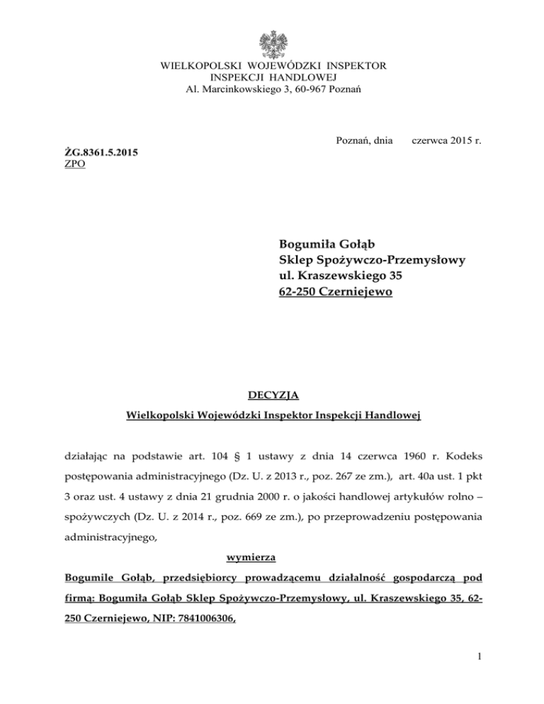 WIELKOPOLSKI WOJEWÓDZKI INSPEKTOR INSPEKCJI HANDLOWEJ Al. Marcinkowskiego 3, 60-967 Poznań Poznań, dnia czerwca 2015 r. ŻG.8361.5.2015 ZPO Bogumiła Gołąb Sklep Spożywczo-Przemysłowy ul. Kraszewskiego 35 62-250 Czerniejewo DECYZJA Wielkopolski Wojewódzki Inspektor Inspekcji Handlowej działając na podstawie art. 104 § 1 ustawy z dnia 14 czerwca 1960 r. Kodeks postępowania administracyjnego (Dz. U. z 2013 r., poz. 267 ze zm.), art. 40a ust. 1 pkt 3 oraz ust. 4 ustawy z dnia 21 grudnia 2000 r. o jakości handlowej artykułów rolno – spożywczych (Dz. U. z 2014 r., poz. 669 ze zm.), po przeprowadzeniu postępowania administracyjnego, wymierza Bogumile Gołąb, przedsiębiorcy prowadzącemu działalność gospodarczą pod firmą: Bogumiła Gołąb Sklep Spożywczo-Przemysłowy, ul. Kraszewskiego 35, 62250 Czerniejewo, NIP: 7841006306, 1 karę pieniężną w wysokości 500,00 zł (słownie: pięćset złotych 00/100), wynikającą z art. 40 a ust. 1 pkt 3 ustawy z dnia 21 grudnia 2000 r. o jakości handlowej artykułów rolno- spożywczych (Dz. U. z 2014 r., poz. 669 ze zm.), z tytułu wprowadzenia do obrotu handlowego w dniu kontroli tj. w dniu 4 lutego 2015 roku w sklepie „ŁASUCH” Chata Polska, przy ul. Kraszewskiego 5 w Poznaniu, przedsiębiorca: Aneta Zacharyasz „DELMAS” Przedsiębiorstwo Handlowo-Usługowe, ul. Kraszewskiego 5, 60-501 Poznań, artykułów rolno - spożywczych nieodpowiadających jakości handlowej określonej w przepisach o jakości handlowej, ogólnej wartości 79,98 zł. Kontrolowany wprowadził nieodpowiadające jakości do obrotu artykuły rolno-spożywcze handlowej określonej w przepisach o jakości handlowej co skutkuje zastosowaniem art. 40 a ust. 1 pkt 3 ustawy o jakości handlowej artykułów rolno- spożywczych. „Kto wprowadza do obrotu artykuły rolno-spożywcze nieodpowiadające jakości handlowej określonej w przepisach o jakości handlowej lub deklarowanej przez producenta w oznakowaniu tych artykułów, podlega karze pieniężnej w wysokości do pięciokrotnej wartości korzyści majątkowej uzyskanej lub która mogłaby zostać uzyskana przez wprowadzenie tych artykułów rolno-spożywczych do obrotu, nie niższej jednak niż 500 zł.”. Uzasadnienie Podczas kontroli przeprowadzonej przez Wielkopolskiego Wojewódzkiego Inspektora Inspekcji Handlowej, w dniach od 4 do 9 lutego 2015 r., w sklepie „ŁASUCH” Chata Polska, przy ul. Kraszewskiego 5 w Poznaniu, przedsiębiorca: Aneta Zacharyasz „DELMAS” Przedsiębiorstwo Handlowo-Usługowe, ul. Kraszewskiego 5, 60-501 Poznań, stwierdzono wprowadzanie do obrotu handlowego, 2 artykułów rolno - spożywczych nieodpowiadających jakości handlowej określonej w przepisach o jakości handlowej, ogólnej wartości 79,98 zł, tj: - 3 szt. produktu BUŁKA TOS. GRAHAMKA w cenie 0,59 zł/szt. wartości 1,77 zł - 3 szt. produktu BUŁKA TOS. RAZOWA w cenie 0,75 zł/szt. wartości 2,25 zł - 10 szt. produktu BUŁKA TOS. WIEJSKA w cenie 0,55 zł/szt. wartości 5,50 zł producent Piekarnia „TOSMAK” T. R. Olejniczak Krosinko ul. Wiejska 52, 62-050 Mosina z uwagi na to, że w miejscu sprzedaży badanych partii wyrobów na wywieszkach cenowych odnoszących się do poszczególnych wyrobów lub w inny sposób dostępny bezpośrednio konsumentom nie podano: • pełnej nazwy środka spożywczego pozwalającej na rozpoznanie rodzaju oraz właściwości produktu, co narusza wymagania określone w treści § 19 ust. 1 pkt 1 rozporządzenia Ministra Rolnictwa i Rozwoju Wsi z dnia 23 grudnia 2014 r. w sprawie znakowania poszczególnych rodzajów środków spożywczych (Dz. U. 2015 poz. 29), • nazwy producenta , co jest niezgodne z wymaganiami § 19 ust. 1 pkt 2 w/w rozporządzenia Ministra Rolnictwa i Rozwoju Wsi z dnia 23 grudnia 2014 r. w sprawie znakowania poszczególnych rodzajów środków spożywczych, • wykazu składników, co narusza postanowienia przepisów: - § 19 ust.1 pkt 3 w/w rozporządzenia Ministra Rolnictwa i Rozwoju Wsi z dnia 23 grudnia 2014 r. w sprawie znakowania poszczególnych rodzajów środków spożywczych - art. 44 ust 1 lit. a) rozporządzenia Parlamentu Europejskiego i Rady (UE) Nr 1169/2011 z dnia konsumentom 25 października informacji na temat 2011r. w sprawie przekazywania żywności, zmiany rozporządzeń Parlamentu Europejskiego i Rady(WE) Nr 1924/2006 i (WE) Nr 1925/2006 oraz uchylenia dyrektywy Komisji 87/250/EWG, dyrektywy Rady dyrektywy Komisji 1999/10/WE, dyrektywy 2000/13/WE 90/496/EWG, Parlamentu 3 Europejskiego i Rady, dyrektyw Komisji 2002/67/WE oraz rozporządzenia Komisji (WE) Nr 608/2004 (Dz. U. L 304 • z 22.11.2011 s. 18 ze zm.) masy jednostkowej pieczywa,, co jest niezgodne z wymaganiami § 19 ust. 1 pkt 6 a w/w rozporządzenia Ministra Rolnictwa i Rozwoju Wsi z dnia 23 grudnia 2014 r. w sprawie znakowania poszczególnych rodzajów środków spożywczych, - 3 szt. produktu CHLEB MAC. ZIARMIX w cenie 3,29 zł/szt. wartości 9,87 zł, - 3 szt. produktu CHLEB MAC. PASTERSKI MAŁY w cenie 4,19 zł/szt. wartości 12,57 zł, - 10 szt. produktu CHLEB MAC. WIEJSKI w cenie 2,99 zł/szt. wartości 29,90 zł, producent Zakład Piekarski Sp. J. R. Maciejewski, E. Maciejewska ul. Madziarska 40/44, 61-615 Poznań, z uwagi na to, że w miejscu sprzedaży badanych partii wyrobów na wywieszkach cenowych odnoszących się do poszczególnych wyrobów lub w inny sposób dostępny bezpośrednio konsumentom nie podano: • pełnej nazwy środka spożywczego pozwalającej na rozpoznanie rodzaju oraz właściwości produktu, co narusza wymagania określone w treści § 19 ust. 1 pkt 1 w/w rozporządzenia Ministra Rolnictwa i Rozwoju Wsi z dnia 23 grudnia 2014 r. w sprawie znakowania poszczególnych rodzajów środków spożywczych • nazwy producenta , co jest niezgodne z wymaganiami § 19 ust. 1 pkt 2 w/w rozporządzenia Ministra Rolnictwa i Rozwoju Wsi z dnia 23 grudnia 2014 r. w sprawie znakowania poszczególnych rodzajów środków spożywczych • wykazu s