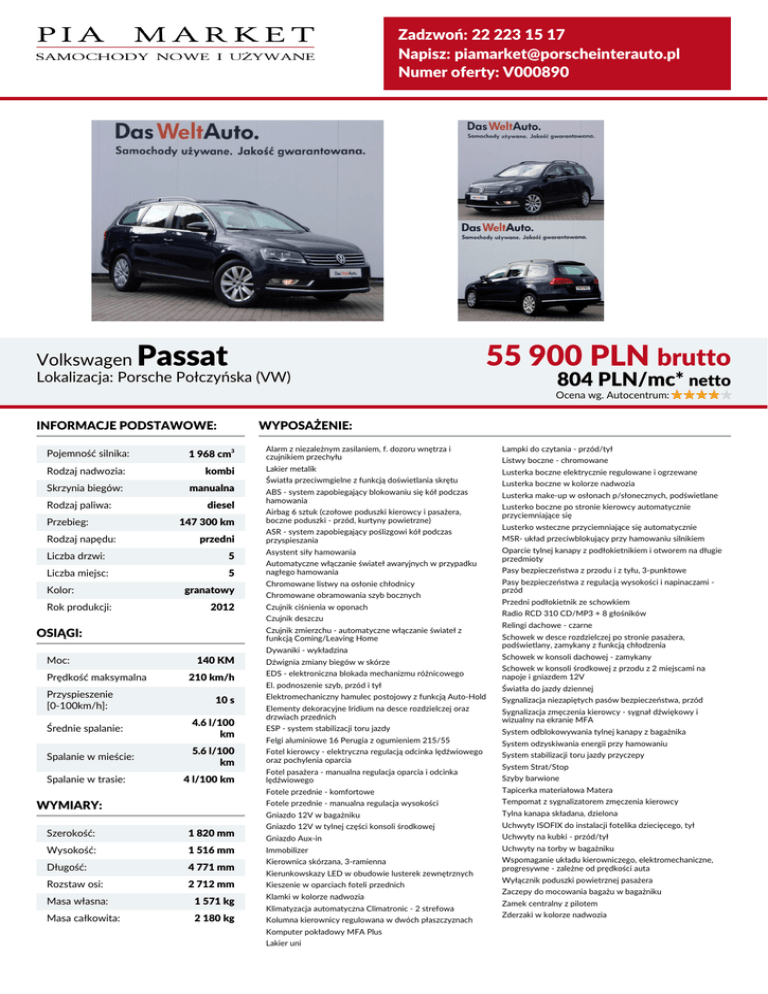 Zadzwoń: 22 223 15 17 Napisz: [email protected] Numer oferty: V000890 Volkswagen Passat 55 900 PLN brutto Lokalizacja: Porsche Połczyńska (VW) 804 PLN/mc* netto Ocena wg. Autocentrum: INFORMACJE PODSTAWOWE: Pojemność silnika: Rodzaj nadwozia: Skrzynia biegów: Rodzaj paliwa: Przebieg: Rodzaj napędu: WYPOSAŻENIE: 1 968 cm3 kombi manualna diesel 147 300 km przedni Liczba drzwi: 5 Liczba miejsc: 5 Kolor: Rok produkcji: granatowy 2012 Alarm z niezależnym zasilaniem, f. dozoru wnętrza i czujnikiem przechyłu Lampki do czytania - przód/tył Lakier metalik Lusterka boczne elektrycznie regulowane i ogrzewane Światła przeciwmgielne z funkcją doświetlania skrętu Lusterka boczne w kolorze nadwozia ABS - system zapobiegający blokowaniu się kół podczas hamowania Lusterka make-up w osłonach p/słonecznych, podświetlane Airbag 6 sztuk (czołowe poduszki kierowcy i pasażera, boczne poduszki - przód, kurtyny powietrzne) ASR - system zapobiegający poślizgowi kół podczas przyspieszania Asystent siły hamowania Automatyczne włączanie świateł awaryjnych w przypadku nagłego hamowania Chromowane listwy na osłonie chłodnicy Chromowane obramowania szyb bocznych Czujnik ciśnienia w oponach Czujnik deszczu Czujnik zmierzchu - automatyczne włączanie świateł z funkcją Coming/Leaving Home OSIĄGI: Dywaniki - wykładzina Moc: Prędkość maksymalna Przyspieszenie [0-100km/h]: Średnie spalanie: Spalanie w mieście: Spalanie w trasie: 140 KM 210 km/h 10 s 4.6 l/100 km 5.6 l/100 km 4 l/100 km WYMIARY: Szerokość: 1 820 mm Wysokość: 1 516 mm Długość: 4 771 mm Rozstaw osi: 2 712 mm Dźwignia zmiany biegów w skórze Listwy boczne - chromowane Lusterko boczne po stronie kierowcy automatycznie przyciemniające się Lusterko wsteczne przyciemniające się automatycznie MSR- układ przeciwblokujący przy hamowaniu silnikiem Oparcie tylnej kanapy z podłokietnikiem i otworem na długie przedmioty Pasy bezpieczeństwa z przodu i z tyłu, 3-punktowe Pasy bezpieczeństwa z regulacją wysokości i napinaczami przód Przedni podłokietnik ze schowkiem Radio RCD 310 CD/MP3 + 8 głośników Relingi dachowe - czarne Schowek w desce rozdzielczej po stronie pasażera, podświetlany, zamykany z funkcją chłodzenia Schowek w konsoli dachowej - zamykany EDS - elektroniczna blokada mechanizmu różnicowego Schowek w konsoli środkowej z przodu z 2 miejscami na napoje i gniazdem 12V El. podnoszenie szyb, przód i tył Światła do jazdy dziennej Elektromechaniczny hamulec postojowy z funkcją Auto-Hold Sygnalizacja niezapiętych pasów bezpieczeństwa, przód Elementy dekoracyjne Iridium na desce rozdzielczej oraz drzwiach przednich Sygnalizacja zmęczenia kierowcy - sygnał dźwiękowy i wizualny na ekranie MFA ESP - system stabilizacji toru jazdy System odblokowywania tylnej kanapy z bagażnika Felgi aluminiowe 16 Perugia z ogumieniem 215/55 System odzyskiwania energii przy hamowaniu Fotel kierowcy - elektryczna regulacją odcinka lędźwiowego oraz pochylenia oparcia System stabilizacji toru jazdy przyczepy Fotel pasażera - manualna regulacja oparcia i odcinka lędźwiowego Szyby barwione System Strat/Stop Fotele przednie - komfortowe Tapicerka materiałowa Matera Fotele przednie - manualna regulacja wysokości Tempomat z sygnalizatorem zmęczenia kierowcy Gniazdo 12V w bagażniku Tylna kanapa składana, dzielona Gniazdo 12V w tylnej części konsoli środkowej Uchwyty ISOFIX do instalacji fotelika dziecięcego, tył Gniazdo Aux-in Uchwyty na kubki - przód/tył Immobilizer Uchwyty na torby w bagażniku Kierownica skórzana, 3-ramienna Wspomaganie układu kierowniczego, elektromechaniczne, progresywne - zależne od prędkości auta Kierunkowskazy LED w obudowie lusterek zewnętrznych Kieszenie w oparciach foteli przednich Masa własna: 1 571 kg Klamki w kolorze nadwozia Masa całkowita: 2 180 kg Kolumna kierownicy regulowana w dwóch płaszczyznach Klimatyzacja automatyczna Climatronic - 2 strefowa Komputer pokładowy MFA Plus Lakier uni Wyłącznik poduszki powietrznej pasażera Zaczepy do mocowania bagażu w bagażniku Zamek centralny z pilotem Zderzaki w kolorze nadwozia BEZPIECZEŃSTWO: WYPOSAŻENIE DODATKOWE: ABS - system zapobiegający blokowaniu się kół podczas hamowania Airbag 6 sztuk (czołowe poduszki Climatronic Aluminiowe felgi Czujniki parkowania kierowcy i pasażera, boczne poduszki przód, kurtyny powietrzne) ESP - system stabilizacji toru jazdy Pasy bezpieczeństwa z przodu i z tyłu, 3punktowe Pasy bezpieczeństwa z regulacją wysokości i napinaczami - przód Wyłącznik poduszki powietrznej pasażera *Rata leasingu Niniejsza informacja oraz kalkulacja dotyczy produktów Porsche Inter Auto Polska Sp. z o.o. Niniejsza informacja nie stanowi oferty w rozumieniu kodeksu cywilnego. Kalkulacja ma jedynie charakter poglądowy i szacunkowy, oparta jest na wskazanych powyżej założeniach; zarówno wskazana cena produktu, jak i wyliczona rata leasingowa mogą ulec zmianie. Informacja nie stanowi gwarancji dostępności produktu. Ostateczne warunki, w tym cenę i wysokość raty leasingowej, określa umowa. Oferta ma charakter informacyjny, nie stanowi oferty handlowej w rozumieniu Art. 66. § 1 Kodeksu Cywilnego.