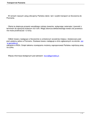 Transport do Poznania W ramach naszych usług oferujemy Państwu także tani i szybki transport ze Szczecina do Poznania. Oferta ta obejmuje przewóz wszelkiego rodzaju towarów, wyłączając zwierzęta i żywność z terminem do spożycia krótszym niż 5 dni. Waga zbiorcza deklarowanego towaru do przewozu nie może przekraczać 1,5 tony. Odbiór towaru następuje w Szczecinie w umówionym wcześniej miejscu i dostarczany jest pod ustalony adres w Poznaniu. Dostawa towaru następuje w dniu ogłaszanych na stronie ww w.gpmeble.pl zakupów w IKEA. Dzięki takiemu rozwiązaniu możemy zaproponować Państwu najniższą cenę na rynku. Więcej informacji dostępnych pod adresem [email protected] . 1/2 Transport do Poznania 2/2