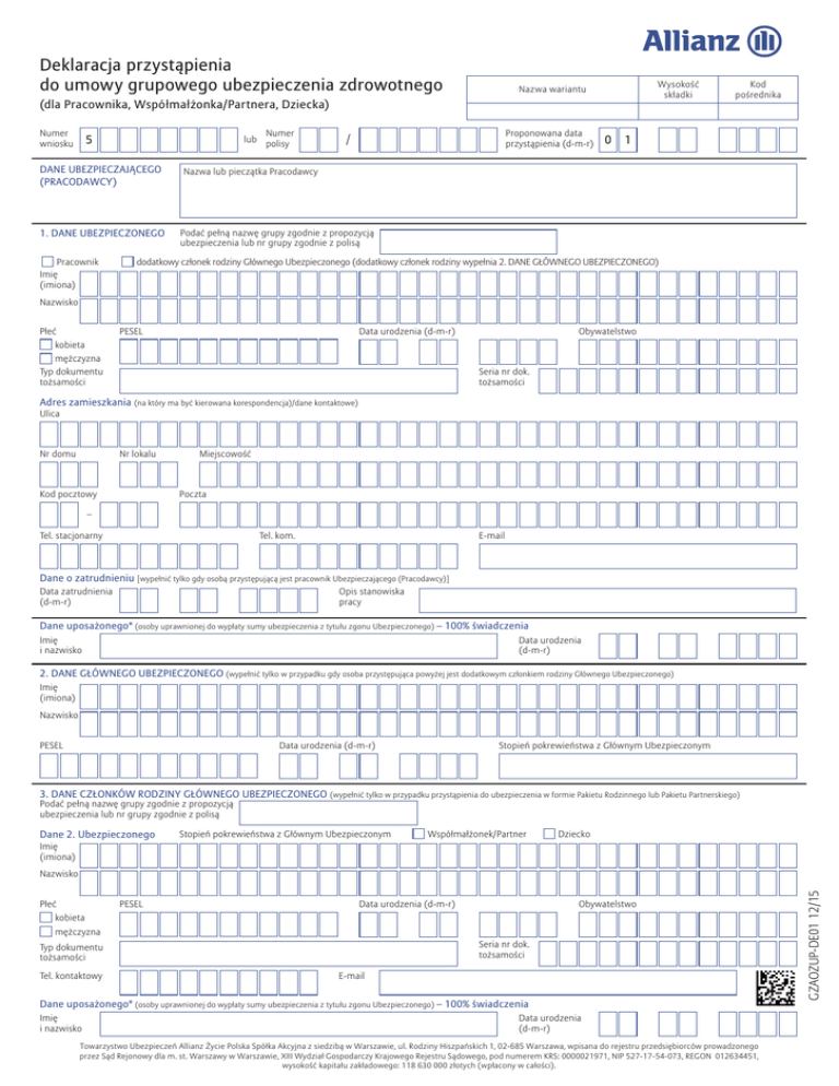 Deklaracja przystąpienia do umowy grupowego ubezpieczenia zdrowotnego Wysokość składki Nazwa wariantu (dla Pracownika, Współmałżonka/Partnera, Dziecka) Numer wniosku Numer lub polisy 5 DANE UBEZPIECZAJĄCEGO (PRACODAWCY) 1. DANE UBEZPIECZONEGO Pracownik Imię (imiona) Proponowana data przystąpienia (d-m-r) / 0 Kod pośrednika 1 Nazwa lub pieczątka Pracodawcy Podać pełną nazwę grupy zgodnie z propozycją ubezpieczenia lub nr grupy zgodnie z polisą dodatkowy członek rodziny Głównego Ubezpieczonego (dodatkowy członek rodziny wypełnia 2. DANE GŁÓWNEGO UBEZPIECZONEGO) Nazwisko PESEL Płeć kobieta Data urodzenia (d-m-r) mężczyzna Typ dokumentu tożsamości Obywatelstwo Seria nr dok. tożsamości Adres zamieszkania (na który ma być kierowana korespondencja)/dane kontaktowe) Ulica Nr domu Nr lokalu Kod pocztowy Miejscowość Poczta – Tel. stacjonarny Tel. kom. E-mail Dane o zatrudnieniu [wypełnić tylko gdy osobą przystępującą jest pracownik Ubezpieczającego (Pracodawcy)] Data zatrudnienia (d-m-r) Opis stanowiska pracy Dane uposażonego* (osoby uprawnionej do wypłaty sumy ubezpieczenia z tytułu zgonu Ubezpieczonego) – 100% świadczenia Imię i nazwisko Data urodzenia (d-m-r) 2. DANE GŁÓWNEGO UBEZPIECZONEGO (wypełnić tylko w przypadku gdy osoba przystępująca powyżej jest dodatkowym członkiem rodziny Głównego Ubezpieczonego) Imię (imiona) Nazwisko PESEL Data urodzenia (d-m-r) Stopień pokrewieństwa z Głównym Ubezpieczonym 3. DANE CZŁONKÓW RODZINY GŁÓWNEGO UBEZPIECZONEGO (wypełnić tylko w przypadku przystąpienia do ubezpieczenia w formie Pakietu Rodzinnego lub Pakietu Partnerskiego) Podać pełną nazwę grupy zgodnie z propozycją ubezpieczenia lub nr grupy zgodnie z polisą Dane 2. Ubezpieczonego Stopień pokrewieństwa z Głównym Ubezpieczonym Współmałżonek/Partner Dziecko Imię (imiona) Płeć kobieta PESEL Data urodzenia (d-m-r) Obywatelstwo mężczyzna Seria nr dok. tożsamości Typ dokumentu tożsamości Tel. kontaktowy E-mail Dane uposażonego* (osoby uprawnionej do wypłaty sumy ubezpieczenia z tytułu zgonu Ubezpieczonego) – 100% świadczenia Imię i nazwisko Data urodzenia (d-m-r) Towarzystwo Ubezpieczeń Allianz Życie Polska Spółka Akcyjna z siedzibą w Warszawie, ul. Rodziny Hiszpańskich 1, 02-685 Warszawa, wpisana do rejestru przedsiębiorców prowadzonego przez Sąd Rejonowy dla m. st. Warszawy w Warszawie, XIII Wydział Gospodarczy Krajowego Rejestru Sądowego, pod numerem KRS: 0000021971, NIP 527-17-54-073, REGON 012634451, wysokość kapitału zakładowego: 118 630 000 złotych (wpłacony w całości). GZAOZUP-DE01 12/15 Nazwisko Dane 3. Ubezpieczonego Stopień pokrewieństwa z Głównym Ubezpieczonym Współmałżonek/Partner Dziecko Imię (imiona) Nazwisko Płeć kobieta PESEL Data urodzenia (d-m-r) Obywatelstwo mężczyzna Seria nr dok. tożsamości Typ dokumentu tożsamości Tel. kontaktowy E-mail Dane uposażonego* (osoby uprawnionej do wypłaty sumy ubezpieczenia z tytułu zgonu Ubezpieczonego) – 100% świadczenia Imię i nazwisko Data urodzenia (d-m-r) Dane 4. Ubezpieczonego Stopień pokrewieństwa z Głównym Ubezpieczonym Dziecko Współmałżonek/Partner Imię (imiona) Nazwisko Płeć kobieta PESEL Data urodzenia (d-m-r) Obywatelstwo mężczyzna Seria nr dok. tożsamości Typ dokumentu tożsamości Tel. kontaktowy E-mail Dane uposażonego* (osoby uprawnionej do wypłaty sumy ubezpieczenia z tytułu zgonu Ubezpieczonego) – 100% świadczenia Imię i nazwisko Data urodzenia (d-m-r) * W przypadku woli wskazania więcej niż 1 osoby (uposażonego) należy wypełnić formularz Wniosek o ustanowienie/zmianę osób Uposażonych. Adres zamieszkania (na który ma być kierowana korespondencja – wypełnić, jeżeli adres poszczególnych Ubezpieczonych jest inny niż Głównego Ubezpieczonego) 2. Ubezpieczonego 3. Ubezpieczonego 4. Ubezpieczonego Oświadczenie o przystąpieniu do umowy grupowego ubezpieczenia zdrowotnego Ja niżej podpisany/a, oświadczam, iż chcę skorzystać z zastrzeżenia na moją rzecz ochrony ubezpieczeniowej w ramach umowy grupowego ubezpieczenia zdrowotnego zawartej z TU Allianz Życie Polska S.A. i wyrażam zgodę na zakres ochrony ubezpieczeniowej, wysokość sumy ubezpieczenia i składki. Oświadczam, że przed wyrażeniem zgody na objęcie ochroną ubezpieczeniową oraz na finansowanie kosztu składki ubezpieczeniowej i podpisaniem niniejszej deklaracji otrzymałem/am warunki umowy w tym ogólne warunki grupowego ubezpieczenia zdrowotnego wraz z załącznikami obowiązujące w dniu przystąpienia do umowy ubezpieczenia. Pełnomocnictwo Współmałżonka/Partnera/pełnoletniego Dziecka Udzielam Głównemu Ubezpieczonemu pełnomocnictwa do reprezentowania mnie wobec TU Allianz Życie Polska S.A. i Ubezpieczającego we wszystkich czynnościach związanych z wykonaniem umowy ubezpieczenia, do której niniejszym przystępuję, w tym do odbierania korespondencji i składania wszelkich oświadczeń woli w moim imieniu. Deklaracja zgody na przetwarzanie danych Niniejszym wyrażam dobrowolną zgodę na przetwarzanie moich danych osobowych, w tym danych dotyczących mojego stanu zdrowia i nałogów, przez TU Allianz Życie Polska S.A. dla celów podanych w treści Klauzuli informacyjnej, znajdującej się poniżej. Niniejszym wyrażam zgodę na udostępnianie moich danych osobowych, w tym teleadresowych, podmiotom świadczącym usługi medyczne, w celu zawarcia umowy na świadczenie usług medycznych wynikających z umowy ubezpieczenia. Oświadczenie Potwierdzam, że wszelkie dane zawarte w tej deklaracji są prawdziwe i zgodne z moją najlepszą wiedzą. W razie zatajenia lub podania nieprawdziwych informacji TU Allianz Życie Polska S.A. nie ponosi odpowiedzialności na warunkach przewidzianych przez przepisy Kodeksu cywilnego. Upoważnienie Wyrażam zgodę na to, by podmioty udzielające świadczeń zdrowotnych udostępniały TU Allianz Życie Polska S.A. moją dokumentację medyczną