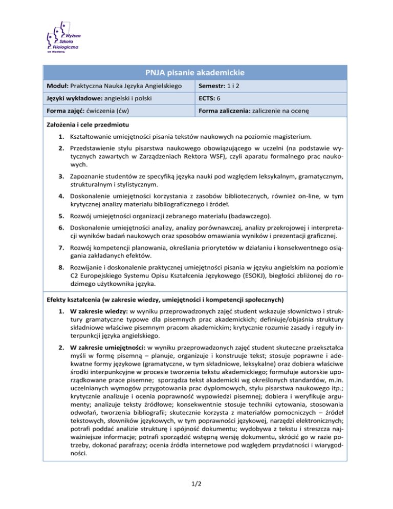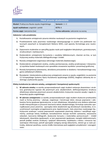 PNJA pisanie akademickie Moduł: Praktyczna Nauka Języka Angielskiego Semestr: 1 i 2 Języki wykładowe: angielski i polski ECTS: 6 Forma zajęć: ćwiczenia (ćw) Forma zaliczenia: zaliczenie na ocenę Założenia i cele przedmiotu 1. Kształtowanie umiejętności pisania tekstów naukowych na poziomie magisterium. 2. Przedstawienie stylu pisarstwa naukowego obowiązującego w uczelni (na podstawie wytycznych zawartych w Zarządzeniach Rektora WSF), czyli aparatu formalnego prac naukowych. 3. Zapoznanie studentów ze specyfiką języka nauki pod względem leksykalnym, gramatycznym, strukturalnym i stylistycznym. 4. Doskonalenie umiejętności korzystania z zasobów bibliotecznych, również on-line, w tym krytycznej analizy materiału bibliograficznego i źródeł. 5. Rozwój umiejętności organizacji zebranego materiału (badawczego). 6. Doskonalenie umiejętności analizy, analizy porównawczej, analizy przekrojowej i interpretacji wyników badań naukowych oraz sposobów omawiania wyników i prezentacji graficznej. 7. Rozwój kompetencji planowania, określania priorytetów w działaniu i konsekwentnego osiągania zakładanych efektów. 8. Rozwijanie i doskonalenie praktycznej umiejętności pisania w języku angielskim na poziomie C2 Europejskiego Systemu Opisu Kształcenia Językowego (ESOKJ), biegłości zbliżonej do rodzimego użytkownika języka. Efekty kształcenia (w zakresie wiedzy, umiejętności i kompetencji społecznych) 1. W zakresie wiedzy: w wyniku przeprowadzonych zajęć student wskazuje słownictwo i struktury gramatyczne typowe dla pisemnych prac akademickich; definiuje/objaśnia struktury składniowe właściwe pisemnym pracom akademickim; krytycznie rozumie zasady i reguły interpunkcji języka angielskiego. 2. W zakresie umiejętności: w wyniku przeprowadzonych zajęć student skuteczne przekształca myśli w formę pisemną – planuje, organizuje i konstruuje tekst; stosuje poprawne i adekwatne formy językowe (gramatyczne, w tym składniowe, leksykalne) oraz dobiera właściwe środki interpunkcyjne w procesie tworzenia tekstu akademickiego; formułuje autorskie uporządkowane prace pisemne; sporządza tekst akademicki wg określonych standardów, m.in. uczelnianych wymogów przygotowania prac dyplomowych, stylu pisarstwa naukowego itp.; krytycznie analizuje i ocenia poprawność wypowiedzi pisemnej; dobiera i weryfikuje argumenty; analizuje teksty źródłowe; konsekwentnie stosuje techniki cytowania, stosowania odwołań, tworzenia bibliografii; skutecznie korzysta z materiałów pomocniczych – źródeł tekstowych, słowników językowych, w tym poprawności językowej, narzędzi elektronicznych; potrafi poddać analizie strukturę i spójność dokumentu; wydobywa z tekstu i streszcza najważniejsze informacje; potrafi sporządzić wstępną wersję dokumentu, skrócić go w razie potrzeby, dokonać parafrazy; ocenia źródła internetowe pod względem przydatności i wiarygodności. 1/2 3. W zakresie kompetencji społecznych: w wyniku przeprowadzonych zajęć student świadomie stosuje zasady pisarstwa akademickiego w procesie przygotowywania prac magisterskich/o charakterze naukowym, z zachowaniem najwyższej dbałości o poprawność językową i interpunkcyjną, edytorską oraz estetykę tekstu; samodzielnie i odpowiedzialnie tworzy plan pracy, z uwzględnieniem warunków, realiów mających wpływ na realizację planu; wykazuje aktywność w samodzielnym podejmowaniu działań służących doskonaleniu własnej techniki pisarstwa; wykazuje zdolność do własnej krytycznej oceny poprawności tekstu; jest otwarty na krytykę, dyskusję, wymianę opinii w zakresie podejmowanych tematów; wykazuje poczucie odpowiedzialności za przygotowany tekst; postępuje zgodne z zasadami etyki pisarstwa/poszanowaniem praw w kontekście korzystania z tekstów źródłowych/innego autorstwa. Stosowane metody dydaktyczne 1. Ćwiczenia warsztatowe z dużym udziałem pracy własnej. 2. Ćwiczenia edytorskie z szerokim wykorzystaniem narzędzi i źródeł informatycznych. 3. Kierowana praca własna studenta. 4. Dyskusja. 2/2
