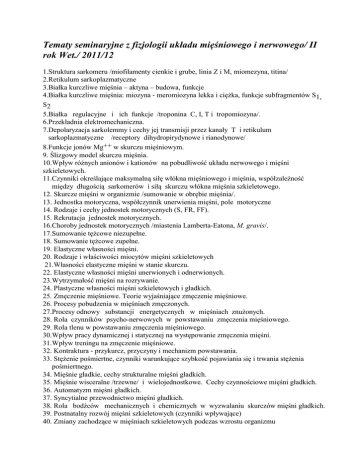 Tematy seminaryjne z fizjologii układu mięśniowego i nerwowego/ II rok Wet./ 2011/12 1.Struktura sarkomeru /miofilamenty cienkie i grube, linia Z i M, miomezyna, titina/ 2.Retikulum sarkoplazmatyczne 3.Białka kurczliwe mięśnia – aktyna – budowa, funkcje 4.Białka kurczliwe mięśnia: miozyna - meromiozyna lekka i ciężka, funkcje subfragmentów S1, S2 5.Białka regulacyjne i ich funkcje /troponina C, I, T i tropomiozyna/. 6.Przekładnia elektromechaniczna. 7.Depolaryzacja sarkolemmy i cechy jej transmisji przez kanały T i retikulum sarkoplazmatyczne /receptory dihydropirydynowe i rianodynowe/ 8.Funkcje jonów Mg++ w skurczu mięśniowym. 9. Ślizgowy model skurczu mięśnia. 10.Wpływ różnych anionów i kationów na pobudliwość układu nerwowego i mięśni szkieletowych. 11.Czynniki określające maksymalną siłę włókna mięśniowego i mięśnia, współzależność między długością sarkomerów i siłą skurczu włókna mięśnia szkieletowego. 12. Skurcze mięśni w organizmie /sumowanie w obrębie mięśnia/. 13. Jednostka motoryczna, współczynnik unerwienia mięśni, pole motoryczne 14. Rodzaje i cechy jednostek motorycznych (S, FR, FF). 15. Rekrutacja jednostek motorycznych. 16.Choroby jednostek motorycznych /miastenia Lamberta-Eatona, M. gravis/. 17.Sumowanie tężcowe niezupełne. 18. Sumowanie tężcowe zupełne. 19. Elastyczne własności mięśni. 20. Rodzaje i właściwości miocytów mięśni szkieletowych 21.Własności elastyczne mięśni w stanie skurczu. 22. Elastyczne własności mięśni unerwionych i odnerwionych. 23.Wytrzymałość mięśni na rozrywanie. 24. Plastyczne własności mięśni szkieletowych i gładkich. 25. Zmęczenie mięśniowe. Teorie wyjaśniające zmęczenie mięśniowe. 26. Procesy pobudzenia w mięśniach zmęczonych. 27.Procesy odnowy substancji energetycznych w mięśniach znużonych. 28. Rola czynników psycho-nerwowych w powstawaniu zmęczenia mięśniowego. 29. Rola tlenu w powstawaniu zmęczenia mięśniowego. 30.Wpływ pracy dynamicznej i statycznej na występowanie zmęczenia mięśni. 31.Wpływ treningu na zmęczenie mięśniowe. 32. Kontraktura - przykurcz, przyczyny i mechanizm powstawania. 33. Stężenie pośmiertne, czynniki warunkujące szybkość pojawiania się i trwania stężenia pośmiertnego. 34. Mięśnie gładkie, cechy strukturalne mięśni gładkich. 35. Mięśnie wisceralne /trzewne/ i wielojednostkowe. Cechy czynnościowe mięśni gładkich. 36. Automatyzm mięśni gładkich. 37. Syncytialne przewodnictwo mięśni gładkich. 38. Rola bodźców mechanicznych i chemicznych w wyzwalaniu skurczów mięśni gładkich. 39. Postnatalny rozwój mięśni szkieletowych (czynniki wpływające) 40. Zmiany zachodzące w mięśniach szkieletowych podczas wzrostu organizmu 41. Przemiany cieplne w mięśniach. 42. Ciepło początkowe /aktywacji, skracania, utrzymania skurczu i rozkurczu/. 43. Ciepło opóźnione /faza beztlenowa i tlenowa/. 44. Przemiany chemiczne w mięśniach /beztlenowe i tlenowe/. 45. Rola ATP w skurczu mięśniowym. 46. Reakcja miokinazowa. 47. Znaczenie fosfokreatyny w przemianach energetycznych mięśni. 48. Znaczenie glukozy i kwasów tłuszczowych w przemianach energetycznych mięśni. 49. Czynności mięśni szkieletowych w warunkach częściowych i całkowitych zniszczeń neuronów ruchowych lub włókien motorycznych. 50. Cechy mięśni szkieletowych po ich odnerwieniu. 51. Fibrylacja /skurcze lub drżenie włókienkowe/ i fascykulacja /skurcze pęczkowe/. 52. Rola układu nerwowego w regulacji czynności mięśni gładkich. 53. Hypertrofia mięśni szkieletowych. 54. Dystrofie mięśniowe. Układ nerwowy 55.Pompa sodowo-potasowa – mechanizm działania, znaczenie, blokery. 56.Kanały jonowe K+, czynniki bramne. 57.Kanały jonowe Na+, czynniki bramne. 58.Potencjały spoczynkowe, geneza ich istnienia. 59.Stężenie kationów i anionów w płynie wewnątrzkomórkowym i zewnątrzkomórkowym. Wpływ zewnątrzkomórkowego stężenia K+ i Ca++ na pobudliwość neuronów. 60.Depolaryzacja i jej mechanizm jonowy. Potencjał iglicowy. 61.Repolaryzacja i potencjały następcze oraz ich geneza jonowa. 62.Pojęcie impulsu nerwowego. 63.Przewodzenie impulsu we włóknach nerwowych, czynniki wpływające na szybkość przewodzenia. 64. Zmiany pobudliwości towarzyszące zmianom potencjału membranowego. 65. Szybkość przewodzenia włókien nerwowych i ich klasyfikacja wg Erlangera i Gassera 66.Sprzężenie elektro-wydzielnicze 67.Cechy przewodzenia synaptycznego – synapsy chemiczne. 68. Cechy przewodzenia synaptycznego – synapsy elektryczne. 69.Postsynaptyczne potencjały pobudzeniowe /EPSP/. 70.Postsynaptyczne potencjały hamujące /IRSP/. 71.Sumowanie czasowe i przestrzenne. 72.Konwergencja i dywergencja. 73.Torowanie i okluzja. 74.Hamowanie presynaptyczne. 75.Hamowanie postsynaptyczne. 76.Mechanizm działania strychniny, toksyny tężcowej i botulinowej na synapsy. 77.Przewodzenie w synapsach mięśniowych /płytki motoryczne/. 78.Receptory cholinergiczne. 79.Receptory muskarynowe i nikotynowe – zwojowe /N1/ i płytkowe /N2/, rozmieszczenie, agoniści i antagoniści. 80.Receptory adrenergiczne alfa i beta. 81. Receptory jonotropowe i metabotropowe. Białka G i ich rola. 82.Przekaźnictwo synaptyczne szybkie i wolne. 83.Inaktywacja przekaźnika synaptycznego. 84. Przekaźnictwo synaptyczne w OUN - serotoninergiczne, dopaminergiczne, glutaminergiczne, histaminergiczne, adrenergiczne, cholinergiczne, GABA-ergiczne 85.Neuroprzekaźniki synaptyczne /klasyczne, peptydy; pobudzające, hamujące/ 86.Wpływ estrów fosforoorganicznych i karbaminianowych na przewodzenie synaptyczne 87.Związki depolaryzujące i niedepolaryzujące blokujące złącze nerwowo-mięśniowe. 88.Przewodnictwo synaptyczne w OUN. 89.Przekaźnictwo synaptyczne /zwojowe i zazwojowe/ w autonomicznym układzie nerwowym. 90.Przekaźnictwo synaptyczne w jelitowej części autonomicznego układu nerwowego. 91.Substancje wpływaj