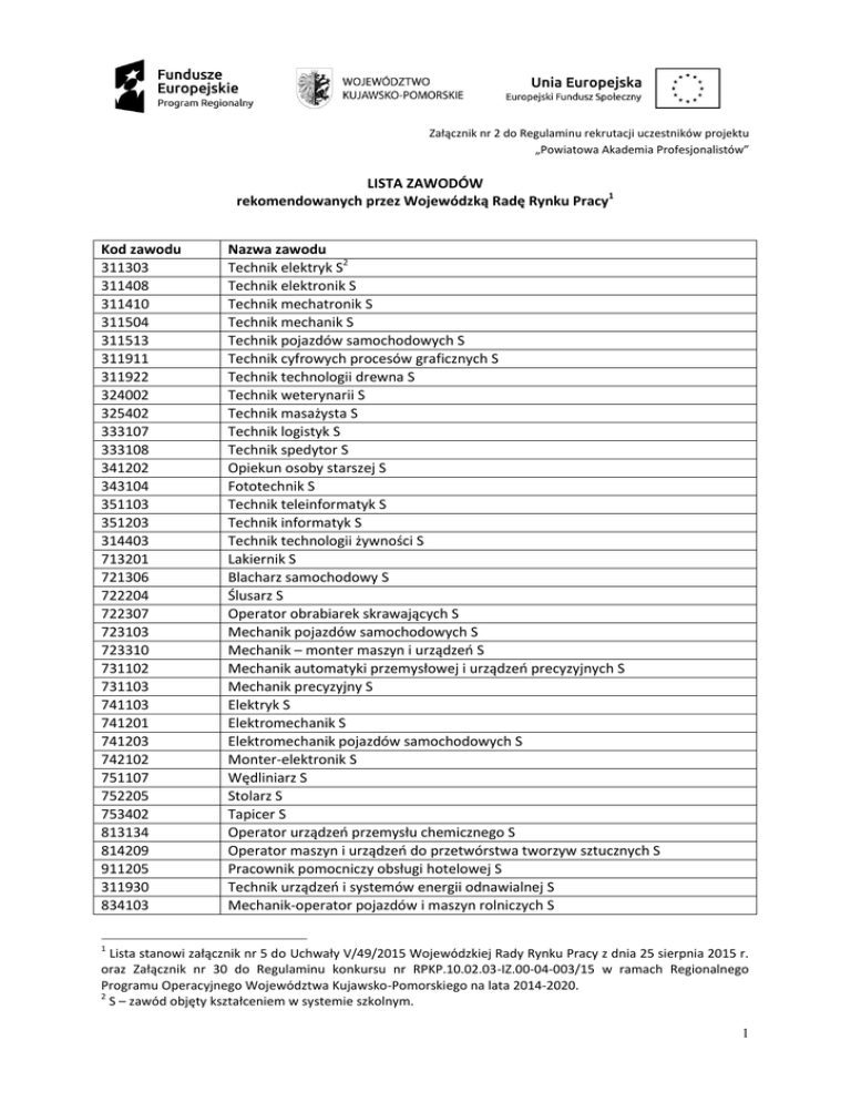 Załącznik nr 2 do Regulaminu rekrutacji uczestników projektu „Powiatowa Akademia Profesjonalistów” LISTA ZAWODÓW rekomendowanych przez Wojewódzką Radę Rynku Pracy1 Kod zawodu 311303 311408 311410 311504 311513 311911 311922 324002 325402 333107 333108 341202 343104 351103 351203 314403 713201 721306 722204 722307 723103 723310 731102 731103 741103 741201 741203 742102 751107 752205 753402 813134 814209 911205 311930 834103 Nazwa zawodu Technik elektryk S2 Technik elektronik S Technik mechatronik S Technik mechanik S Technik pojazdów samochodowych S Technik cyfrowych procesów graficznych S Technik technologii drewna S Technik weterynarii S Technik masażysta S Technik logistyk S Technik spedytor S Opiekun osoby starszej S Fototechnik S Technik teleinformatyk S Technik informatyk S Technik technologii żywności S Lakiernik S Blacharz samochodowy S Ślusarz S Operator obrabiarek skrawających S Mechanik pojazdów samochodowych S Mechanik – monter maszyn i urządzeń S Mechanik automatyki przemysłowej i urządzeń precyzyjnych S Mechanik precyzyjny S Elektryk S Elektromechanik S Elektromechanik pojazdów samochodowych S Monter-elektronik S Wędliniarz S Stolarz S Tapicer S Operator urządzeń przemysłu chemicznego S Operator maszyn i urządzeń do przetwórstwa tworzyw sztucznych S Pracownik pomocniczy obsługi hotelowej S Technik urządzeń i systemów energii odnawialnej S Mechanik-operator pojazdów i maszyn rolniczych S 1 Lista stanowi załącznik nr 5 do Uchwały V/49/2015 Wojewódzkiej Rady Rynku Pracy z dnia 25 sierpnia 2015 r. oraz Załącznik nr 30 do Regulaminu konkursu nr RPKP.10.02.03-IZ.00-04-003/15 w ramach Regionalnego Programu Operacyjnego Województwa Kujawsko-Pomorskiego na lata 2014-2020. 2 S – zawód objęty kształceniem w systemie szkolnym. 1