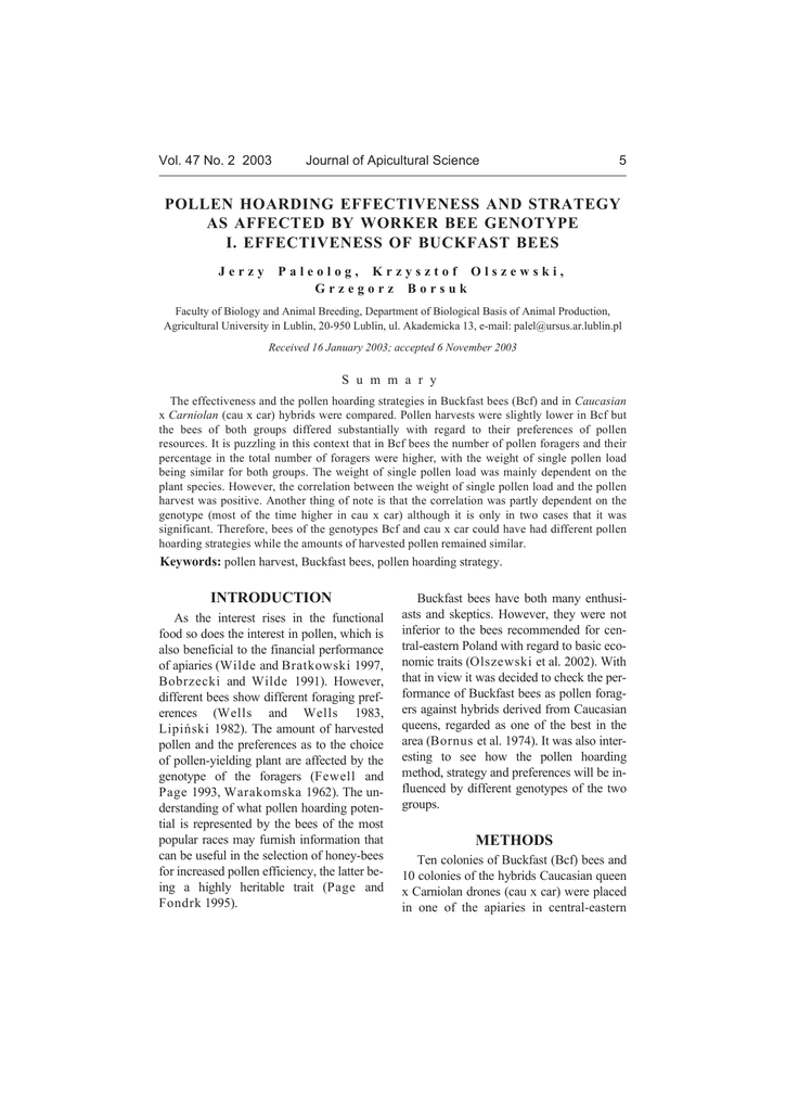 ʱ´ň ěé ұň î îđđí Ö±«®˛ż´ ±ş ß°·˝«´¬«®ż´ Í˝·»˛˝» ë ĐŃÔÔŰŇ ŘŃßÎÜ×ŇŮ ŰÚÚŰÝĚ×ĘŰŇŰÍÍ ßŇÜ ÍĚÎßĚŰŮÇ ßÍ ßÚÚŰÝĚŰÜ ŢÇ ÉŃÎŐŰÎ ŢŰŰ ŮŰŇŃĚÇĐŰ ×ň ŰÚÚŰÝĚ×ĘŰŇŰÍÍ ŃÚ ŢËÝŐÚßÍĚ ŢŰŰÍ Ö»®¦§ Đż´»±´±ąô Ő®¦§¦¬±ş Ń´¦»©µ·ô Ů®¦»ą±®¦ ޱ®«µ Úż˝«´¬§ ±ş Ţ·±´±ą§ ż˛Ľ ߲·łż´ Ţ®»»Ľ·˛ąô Ü»°ż®¬ł»˛¬ ±ş Ţ·±´±ą·˝ż´ Ţż· ±ş ߲·łż´ Đ®±Ľ«˝¬·±˛ô ßą®·˝«´¬«®ż´ ˲·Ş»®·¬§ ·˛ Ô«ľ´·˛ô îđóçëđ Ô«ľ´·˛ô «´ň ßµżĽ»ł·˝µż ďíô »ółż·´ć °ż´»´ŕ«®«ňż®ň´«ľ´·˛ň°´ λ˝»·Ş»Ľ ďę Öż˛«ż®§ îđđíĺ ż˝˝»°¬»Ľ ę Ň±Ş»łľ»® îđđí Í « ł ł ż ® § ̸» »şş»˝¬·Ş»˛» ż˛Ľ ¬¸» °±´´»˛ ¸±ż®Ľ·˛ą ¬®ż¬»ą·» ·˛ Ţ«˝µşż¬ ľ»» řŢ˝ş÷ ż˛Ľ ·˛ Ýż«˝ż·ż˛ ¨ Ýż®˛·±´ż˛ ř˝ż« ¨ ˝ż®÷ ¸§ľ®·Ľ ©»®» ˝±ł°ż®»Ľň б´´»˛ ¸ż®Ş»¬ ©»®» ´·ą¸¬´§ ´±©»® ·˛ Ţ˝ş ľ«¬ ¬¸» ľ»» ±ş ľ±¬¸ ą®±«° Ľ·şş»®»Ľ «ľ¬ż˛¬·ż´´§ ©·¬¸ ®»ąż®Ľ ¬± ¬¸»·® °®»ş»®»˛˝» ±ş °±´´»˛ ®»±«®˝»ň ׬ · °«¦¦´·˛ą ·˛ ¬¸· ˝±˛¬»¨¬ ¬¸ż¬ ·˛ Ţ˝ş ľ»» ¬¸» ˛«łľ»® ±ş °±´´»˛ ş±®żą»® ż˛Ľ ¬¸»·® °»®˝»˛¬żą» ·˛ ¬¸» ¬±¬ż´ ˛«łľ»® ±ş ş±®żą»® ©»®» ¸·ą¸»®ô ©·¬¸ ¬¸» ©»·ą¸¬ ±ş ·˛ą´» °±´´»˛ ´±żĽ ľ»·˛ą ·ł·´ż® ş±® ľ±¬¸ ą®±«°ň ̸» ©»·ą¸¬ ±ş ·˛ą´» °±´´»˛ ´±żĽ ©ż łż·˛´§ Ľ»°»˛Ľ»˛¬ ±˛ ¬¸» °´ż˛¬ °»˝·»ň ر©»Ş»®ô ¬¸» ˝±®®»´ż¬·±˛ ľ»¬©»»˛ ¬¸» ©»·ą¸¬ ±ş ·˛ą´» °±´´»˛ ´±żĽ ż˛Ľ ¬¸» °±´´»˛ ¸ż®Ş»¬ ©ż °±·¬·Ş»ň ߲±¬¸»® ¬¸·˛ą ±ş ˛±¬» · ¬¸ż¬ ¬¸» ˝±®®»´ż¬·±˛ ©ż °ż®¬´§ Ľ»°»˛Ľ»˛¬ ±˛ ¬¸» ໞ±¬§°» řł±¬ ±ş ¬¸» ¬·ł» ¸·ą¸»® ·˛ ˝ż« ¨ ˝ż®÷ ż´¬¸±«ą¸ ·¬ · ±˛´§ ·˛ ¬©± ˝ż» ¬¸ż¬ ·¬ ©ż ·ą˛·ş·˝ż˛¬ň ̸»®»ş±®»ô ľ»» ±ş ¬¸» ໞ±¬§°» Ţ˝ş ż˛Ľ ˝ż« ¨ ˝ż® ˝±«´Ľ ¸żŞ» ¸żĽ Ľ·şş»®»˛¬ °±´´»˛ ¸±ż®Ľ·˛ą ¬®ż¬»ą·» ©¸·´» ¬¸» żł±«˛¬ ±ş ¸ż®Ş»¬»Ľ °±´´»˛ ®»łż·˛»Ľ ·ł·´ż®ň Ő»§©±®Ľć °±´´»˛ ¸ż®Ş»¬ô Ţ«˝µşż¬ ľ»»ô °±´´»˛ ¸±ż®Ľ·˛ą ¬®ż¬»ą§ň ×ŇĚÎŃÜËÝĚ×ŃŇ ß ¬¸» ·˛¬»®»¬ ®·» ·˛ ¬¸» ş«˛˝¬·±˛ż´ ş±±Ľ ± Ľ±» ¬¸» ·˛¬»®»¬ ·˛ °±´´»˛ô ©¸·˝¸ · ż´± ľ»˛»ş·˝·ż´ ¬± ¬¸» ş·˛ż˛˝·ż´ °»®ş±®łż˛˝» ±ş ż°·ż®·» řÉ·´Ľ» ż˛Ľ Ţ®ż¬µ±©µ· ďççéô ޱľ®¦»˝µ· ż˛Ľ É·´Ľ» ďççď÷ň ر©»Ş»®ô Ľ·şş»®»˛¬ ľ»» ¸±© Ľ·şş»®»˛¬ ş±®żą·˛ą °®»şó »®»˛˝» řÉ»´´ ż˛Ľ É»´´ ďçčíô Ô·°·/µ· ďçčî÷ň ̸» żł±«˛¬ ±ş ¸ż®Ş»¬»Ľ °±´´»˛ ż˛Ľ ¬¸» °®»ş»®»˛˝» ż ¬± ¬¸» ˝¸±·˝» ±ş °±´´»˛ó§·»´Ľ·˛ą °´ż˛¬ ż®» żşş»˝¬»Ľ ľ§ ¬¸» ໞ±¬§°» ±ş ¬¸» ş±®żą»® řÚ»©»´´ ż˛Ľ Đżą» ďççíô Éż®żµ±łµż ďçęî÷ň ̸» «˛ó Ľ»®¬ż˛Ľ·˛ą ±ş ©¸ż¬ °±´´»˛ ¸±ż®Ľ·˛ą °±¬»˛ó ¬·ż´ · ®»°®»»˛¬»Ľ ľ§ ¬¸» ľ»» ±ş ¬¸» ł±¬ °±°«´ż® ®ż˝» łż§ ş«®˛·¸ ·˛ş±®łż¬·±˛ ¬¸ż¬ ˝ż˛ ľ» «»ş«´ ·˛ ¬¸» »´»˝¬·±˛ ±ş ¸±˛»§óľ»» ş±® ·˛˝®»ż»Ľ °±´´»˛ »şş·˝·»˛˝§ô ¬¸» ´ż¬¬»® ľ»ó ·˛ą ż ¸·ą¸´§ ¸»®·¬żľ´» ¬®ż·¬ řĐżą» ż˛Ľ Ú±˛Ľ®µ ďççë÷ň Ţ«˝µşż¬ ľ»» ¸żŞ» ľ±¬¸ łż˛§ »˛¬¸«·ó ż¬ ż˛Ľ µ»°¬·˝ň ر©»Ş»®ô ¬¸»§ ©»®» ˛±¬ ·˛ş»®·±® ¬± ¬¸» ľ»» ®»˝±łł»˛Ľ»Ľ ş±® ˝»˛ó ¬®ż´ó»ż¬»®˛ б´ż˛Ľ ©·¬¸ ®»ąż®Ľ ¬± ľż·˝ »˝±ó ˛±ł·˝ ¬®ż·¬ řŃ´¦»©µ· »¬ ż´ň îđđî÷ň É·¬¸ ¬¸ż¬ ·˛ Ş·»© ·¬ ©ż Ľ»˝·Ľ»Ľ ¬± ˝¸»˝µ ¬¸» °»®ó ş±®łż˛˝» ±ş Ţ«˝µşż¬ ľ»» ż °±´´»˛ ş±®żąó »® żąż·˛¬ ¸§ľ®·Ľ Ľ»®·Ş»Ľ ş®±ł Ýż«˝ż·ż˛ Ż«»»˛ô ®»ąż®Ľ»Ľ ż ±˛» ±ş ¬¸» ľ»¬ ·˛ ¬¸» ż®»ż řޱ®˛« »¬ ż´ň ďçéě÷ň ׬ ©ż ż´± ·˛¬»®ó »¬·˛ą ¬± »» ¸±© ¬¸» °±´´»˛ ¸±ż®Ľ·˛ą ł»¬¸±Ľô ¬®ż¬»ą§ ż˛Ľ °®»ş»®»˛˝» ©·´´ ľ» ·˛ó ş´«»˛˝»Ľ ľ§ Ľ·şş»®»˛¬ ໞ±¬§°» ±ş ¬¸» ¬©± ą®±«°ň ÓŰĚŘŃÜÍ Ě»˛ ˝±´±˛·» ±ş Ţ«˝µşż¬ řŢ˝ş÷ ľ»» ż˛Ľ ďđ ˝±´±˛·» ±ş ¬¸» ¸§ľ®·Ľ Ýż«˝ż·ż˛ Ż«»»˛ ¨ Ýż®˛·±´ż˛ Ľ®±˛» ř˝ż« ¨ ˝ż®÷ ©»®» °´ż˝»Ľ ·˛ ±˛» ±ş ¬¸» ż°·ż®·» ·˛ ˝»˛¬®ż´ó»ż¬»®˛ ę б´ż˛Ľň ̸» ˝±´±˛·» ©»®» °®»°ż®»Ľ ¬ż®¬·˛ą ©·¬¸ ¬¸» °®»Ş·±« »ż±˛ ľ§ ·˛¬®±Ľ«˝·˛ą ·˛ó ¬®«ł»˛¬ż´´§ ·˛»ł·˛ż¬»Ľ Ż«»»˛ ż˛Ľ łżµó ·˛ą «®» ¬¸ż¬ ¬¸»§ ż®» ·ł·´ż® ·˛ ¬®»˛ą¬¸ ż˛Ľ ·˛ ¬®«˝¬«®» ş±® ¬¸» ¬·ł» ±ş ¬¸» »¨°»®·ł»˛¬ň É·¬¸·˛ ¬¸» ş±®żą·˛ą ®»ż˝¸ ±ş ¬¸» ľ»» ¬¸»®» ©»®» ¸±ł» ąż®Ľ»˛ô ł»żĽ±© ż˛Ľ °ż¬«®» ż ©»´´ ż ®±żĽ·Ľ» ¬®»»ň б´´»˛ ´±żĽ ©»®» ¬®ż°°»Ľô ©»·ą¸»Ľ ż˛Ľ ş®±¦»˛ »ż˝¸ Ľż§ ş®±ł 