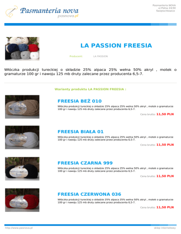 Pasmanteria NOVA ul.Polna 24/30 Świętochłowice LA PASSION FREESIA Producent: LA PASSION Włóczka produkcji tureckiej o składzie 25% alpaca 25% wełna 50% akryl , motek o gramaturze 100 gr i nawoju 125 mb druty zalecane przez producenta 6,5-7. Warianty produktu LA PASSION FREESIA : FREESIA BEŻ 010 Włóczka produkcji tureckiej o składzie 25% alpaca 25% wełna 50% akryl , motek o gramaturze 100 gr i nawoju 125 mb druty zalecane przez producenta 6,5-7. Cena brutto: 11,50 PLN FREESIA BIAŁA 01 Włóczka produkcji tureckiej o składzie 25% alpaca 25% wełna 50% akryl , motek o gramaturze 100 gr i nawoju 125 mb druty zalecane przez producenta 6,5-7. Cena brutto: 11,50 PLN FREESIA CZARNA 999 Włóczka produkcji tureckiej o składzie 25% alpaca 25% wełna 50% akryl , motek o gramaturze 100 gr i nawoju 125 mb druty zalecane przez producenta 6,5-7. Cena brutto: 11,50 PLN FREESIA CZERWONA 036 Włóczka produkcji tureckiej o składzie 25% alpaca 25% wełna 50% akryl , motek o gramaturze 100 gr i nawoju 125 mb druty zalecane przez producenta 6,5-7. Cena brutto: http://www.pasnova.pl 11,50 PLN sklep internetowy Pasmanteria NOVA ul.Polna 24/30 Świętochłowice FREESIA ECRU 002 Włóczka produkcji tureckiej o składzie 25% alpaca 25% wełna 50% akryl , motek o gramaturze 100 gr i nawoju 125 mb druty zalecane przez producenta 6,5-7. Cena brutto: 11,50 PLN FREESIA GRANAT 026 Włóczka produkcji tureckiej o składzie 25% alpaca 25% wełna 50% akryl , motek o gramaturze 100 gr i nawoju 125 mb druty zalecane przez producenta 6,5-7. Cena brutto: 11,50 PLN FREESIA JEANS 022 Włóczka produkcji tureckiej o składzie 25% alpaca 25% wełna 50% akryl , motek o gramaturze 100 gr i nawoju 125 mb druty zalecane przez producenta 6,5-7. Cena brutto: 11,50 PLN FREESIA POPIEL 015 Włóczka produkcji tureckiej o składzie 25% alpaca 25% wełna 50% akryl , motek o gramaturze 100 gr i nawoju 125 mb druty zalecane przez producenta 6,5-7. Cena brutto: 11,50 PLN FREESIA POPIEL 016 Włóczka produkcji tureckiej o składzie 25% alpaca 25% wełna 50% akryl , motek o gramaturze 100 gr i nawoju 125 mb druty zalecane przez producenta 6,5-7. Cena brutto: http://www.pasnova.pl 11,50 PLN sklep internetowy