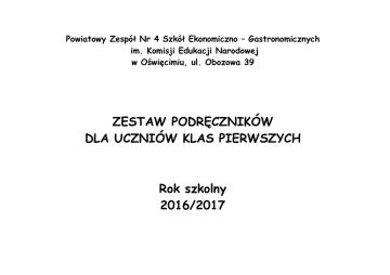 Powiatowy Zespół Nr 4 Szkół Ekonomiczno – Gastronomicznych im. Komisji Edukacji Narodowej w Oświęcimiu, ul. Obozowa 39 ZESTAW PODRĘCZNIKÓW DLA UCZNIÓW KLAS PIERWSZYCH Rok szkolny 2016/2017 Lista podręczników do przedmiotów ogólnokształcących Technikum – klasy I Lp. 1 Przedmiot Autor Tytuł Wydawnictwo K. Mrowcewicz Przeszłość to dziś. Klasa I liceum i technikum, część 1 Numer dopuszczenia: 498/1/2012 STENTOR A. Nawarecki D. Siwicka Przeszłość to dziś. Klasa I, część 2 Numer dopuszczenia: 498/2/2012 STENTOR Język polski S. Kay V. Jones D. Brayshaw B. Michałowski S. Rapacka M. Lewandowska J. Nawrotkiewicz A. Kisielewska A. Kisielewski A. Prochyra 2 Język angielski 3 Język niemiecki 4 Wiedza o kulturze 5 Historia 6 Podstawy J. Musiałkiewicz przedsiębiorczości S. Roszak J. Kłaczkow R. Uliszczak K. Wiederman 7 Geografia J. Brożyńska M. Kubik M. Nikołajew Banaszewska Focus 2 (podręcznik i ćwiczenia) Pearson Hier und da Numer dopuszczenia: 332/1/2011 Wydawnictwa Szkolne PWN Wiedza o kulturze Numer dopuszczenia: 631/2012 Poznać przeszłość. Wiek XX. Podręcznik dla szkół ponadgimnazjalnych. Zakres podstawowy Numer dopuszczenia: 525/2012 Zarys przedsiębiorczości . Podstawy przedsiębiorczości dla szkół ponadgimnazjalnych. Rok dopuszczenia: 2015 „Oblicza geografii. Podręcznik dla szkół ponadgimnazjalnych – zakres podstawowy Numer dopuszczenia: 433/2012 „Oblicza geografii. Karty pracy ucznia dla szkół ponadgimnazjalnych – zakres podstawowy Numer dopuszczenia: 433/2012/2014 OPERON Nowa Era J. Musiałkiewicz Ekonomik Nowa Era Nowa Era Uwagi 8 Biologia B. Jakubik R. Szymańska 9 Chemia R. Hassa A. Mrzigod J. Mrzigod 10 Fizyka M. Braun W. Śliwa 11 12 13 14 „Odkrywamy na nowo” – podręcznik dla szkół ponadgimnazjalnych, Technikum i ZSZ. Zakres podstawowy Numer dopuszczenia: 436/2012 „To jest chemia” – podręcznik dla szkół ponadgimnazjalnych. Zakres podstawowy Numer dopuszczenia: 438/2012 „Odkryć fizykę” - – podręcznik dla szkół ponadgimnazjalnych, Technikum i ZSZ. Zakres podstawowy Numer dopuszczenia: 447/2012 OPERON Nowa Era Nowa Era W. Babiański L. Chańko D. Ponczek MaTeMAtyka 1 – podręcznik dla szkół ponadgimnazjalnych. Zakres podstawowy Numer dopuszczenia: 378/1/2011 Nowa Era Zawody: technik żywienia i usług gastronomicznych, technik obsługi turystycznej, technik hotelarstwa, technik organizacji reklamy W. Babiański L. Chańko D. Ponczek MaTeMAtyka 1– podręcznik dla szkół ponadgimnazjalnych. Zakres podstawowy i rozszerzony Numer dopuszczenia: 360/1/2011 Nowa Era Zawód: technik ekonomista Informatyka G. Hermanowska W. Hermanowski Seria „Ciekawi Świata”. Informatyka. Zakres podstawowy. Podręcznik dla szkół ponadgimnazjalnych Numer dopuszczenia: 520/2012 OPERON Edukacja dla bezpieczeństwa B. Breitkopf M. Cieśla Edukacja dla bezpieczeństwa. Po prostu. Numer dopuszczenia: 500/2012 Religia Ks. T. Śmiech E. Kondrak B. Nosek Na drodze ku dojrzałej wiary Matematyka WSiP JEDNOŚĆ Lista podręczników do przedmiotów ogólnokształcących Zasadnicza szkoła zawodowa – klasy I Lp. 1 2 3 Przedmiot Autor Język polski E. Nowosielska U. Szydłowska Język angielski V. Evans J. Dooley Język niemiecki A. Serzysko B. Sekulski N. Drabich T. Gajownik B. Burda B. Halczak A. Roszak R Józefiak M. Szymczak 4 Historia 5 Geografia R. Uliszczak K. Wiederman 6 Biologia B. Jakubik R. Szymańska 7 Chemia R. Hassa A. Mrzigod J. Mrzigod Tytuł Zrozumieć świat 1. Język polski. Zasadnicza szkoła zawodowa. Numer dopuszczenia: 584/1/2012 Matura Prime Pime plus. Elementary. Ćwiczenia. „Infos” 1 A Numer dopuszczenia: 451/1/2012 Seria: Odkrywamy na nowo. Historia. Zakres podstawowy. Podręcznik dla szkół ponadgimnazjalnych Numer dopuszczenia: 456/2012 „Oblicza geografii”. Podręcznik dla szkół ponadgimnazjalnych - zakres podstawowy. Numer dopuszczenia: 433/2012 „Odkrywamy na nowo” – podręcznik dla szkół ponadgimnazjalnych, Technikum i ZSZ. Zakres podstawowy Numer dopuszczenia: 436/2012 „To jest chemia” – podręcznik dla szkół ponadgimnazjalnych. Zakres podstawowy Numer dopuszczenia: 438/2012 Wydawnictwo Uwagi Nowa Era Express Publishing Wydawnictwo Pearson OPERON Nowa Era OPERON Nowa Era Klasa I w wielozawodowa (w tym fryzjer) Klasa I k (zawód kucharz) „Odkryć fizykę” - – podręcznik dla szkół ponadgimnazjalnych, Technikum i ZSZ. Zakres podstawowy Numer dopuszczenia: 447/2012 Matematyka 1 – podręcznik dla ZSZ, część 1 Numer dopuszczenia: 573/1/2012 Seria „Ciekawi Świata”. Informatyka. Zakres podstawowy. Podręcznik dla szkół ponadgimnazjalnych Numer dopuszczenia: 520/2012 8 Fizyka M. Braun W. Śliwa 9 Matematyka W. Babiański K. Wej 10 Informatyka G. Hermanowska W. Hermanowski 11 Edukacja dla bezpieczeństwa B. Breitkopf M. Cieśla Edukacja dla bezpieczeństwa. Po prostu. Numer dopuszczenia: 500/2012 Religia Ks. T. Śmiech E. Kondrak B. Nosek Na drodze do dojrzałej wiary. Nowa Era Nowa Era OPERON WSiP JEDNOŚĆ Lista podręczników do przedmiotów zawodowych w zawodzie technik żywienia i usług gastronomicznych klasa I Lp. Przedmiot Autor Tytuł Wyposażenie i zasady Agnieszka Kasperek Wyposażenie i zasady bezpieczeństwa w gastronomii bezpieczeństwa w gastronomii Marzanna Rok dopuszczenia: 2013 Klasa I - II Kondratowicz Technologia gastronomiczna Sporządzanie potraw i napojów. Towaroznawstwo 2 z towaroznawstwem Anna Kmiołek i przechowywanie żywności Klasa I - III Numer dopuszczenia: 21/2013 Procesy technologiczne Sporządzanie i ekspedycja potraw i napojów. Część 1 3 w gastronomii Anna Kmiołek i 2. Klasa I - III Numer dopuszczenia: 57/2013, 65/2013 Do przedmiotów ogólnokształcących obowiązuje odrębny wykaz podręczników. 1 Wydawnictwo WSiP, REA WSiP WSiP Lista podręczników do przedmiotów zawodowych w zawodzie technik hotelarstwa klasa I Lp. Przedmiot Autor Tytuł Organizacja pracy w hotelarstwie B. Sawicka M. Świątkowska A.