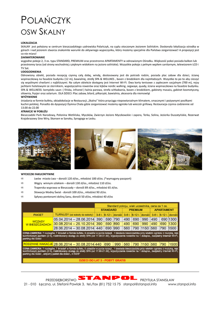 POLAŃCZYK OSW SKALNY LOKALIZACJA SKALNY jest położony w centrum bieszczadzkiego uzdrowiska Polańczyk, na cyplu otoczonym Jeziorem Solińskim. Doskonała lokalizacja ośrodka w górach i nad jeziorem stwarza znakomite warunki do aktywnego wypoczynku, który możemy specjalnie dla Państwa zorganizować! A propozycji jest co nie miara! ZAKWATEROWANIE wygodne pokoje 2, 3 os. typu STANDARD, PREMIUM oraz przestronne APARTAMENTY w odnowionym Ośrodku. Większość pokoi posiada balkon lub przestronny taras (od strony wschodniej z pięknym widokiem na jezioro solińskie). Wszystkie pokoje z pełnym węzłem sanitarnym, telewizorem LCD i TV Sat. UDOGODNIENIA Odnowiony obiekt, posiada recepcję czynną całą dobę, windę, dostosowany jest do potrzeb rodzin, posiada plac zabaw dla dzieci, ścianę wspinaczkową na fasadzie budynku (12 m), bawialnię, strefę SPA & WELLNES , basen z brodzikiem dla najmłodszych. Wszystko to po to aby cieszyć się wspólnymi chwilami z najbliższymi. Na całym obiekcie dostępny jest Internet WI-FI. Dwa korty tenisowe z zapleczem socjalnym (700 m), rejsy jachtami hotelowymi ze sternikiem, wypożyczalnia rowerów oraz kijków nordic walking, segwaye, quady, ściana wspinaczkowa na fasadzie budynku. SPA & WELLNESS: kompleks saun: ( fińska, infrared ) łaźnia parowa, strefa schładzania, basen z brodzikiem, gabinety masażu, gabinet kosmetyczny, siłownia, fryzjer oraz solarium. DLA DZIECI: Plac zabaw, bilard, piłkarzyki, bawialnia, akcesoria dla niemowląt WYŻYWIENIE śniadania w formie bufetu, obiadokolacje w Restauracji „Skalna” która przyciąga niepowtarzalnym klimatem, smacznymi i pożywnymi posiłkami kuchni polskiej. Ponadto do dyspozycji Dymna Chata gdzie zorganizować możemy ognisko lub wieczór grillowy. Restauracja czynna codziennie od 13.00 do 22.00 ATRAKCJE W POBLIŻU Bieszczadzki Park Narodowy, Połonina Wetlińska, Myczków, Zwierzyn Jezioro Myczkowskie i zapora, Terka, Solina, Jeziorka Duszatyńskie, Rezerwat Krajobrazowy Sine Wiry, Skansen w Sanoku, Synagoga w Lesku. WYCIECZKI FAKULTATYWNE • • • • • Lwów miasto Lwa – dorośli 120 zł/os., młodzież 100 zł/os. (*wymagany paszport) Węgry winnym szlakiem – dorośli 130 zł/os., młodzież 110 zł/os. Traperska wyprawa w Bieszczady – dorośli 89 zł/os., młodzież 65 zł/os. Słowacja Wodny Świat - dorośli 100 zł/os., młodzież 90 zł/os. Spływy pontonami doliną Sanu, dorośli 50 zł/os, młodzież 40 zł/os PRZEDSIĘBIORSTWO PRZYTUŁA STANISŁAW 21 - 010 Łęczna, ul. Stefanii Pawlak 3, tel./fax (81) 752 15 75 [email protected] www.stanpol.info