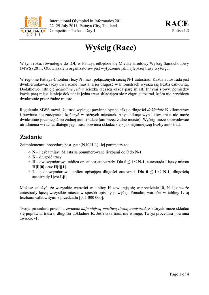 International Olympiad in Informatics 2011 22–29 July 2011, Pattaya City, Thailand Competition Tasks – Day 1 RACE Polish 1.3 Wyścig (Race) W tym roku, równolegle do IOI, w Pattaya odbędzie się Międzynarodowy Wyścig Samochodowy (MWS) 2011. Obowiązkiem organizatorów jest wytyczenie jak najlepszej trasy wyścigu. W regionie Pattaya-Chonburi leży N miast połączonych siecią N-1 autostrad. Każda autostrada jest dwukierunkowa, łączy dwa różne miasta, a jej długość w kilometrach wyraża się liczbą całkowitą. Dodatkowo, istnieje dokładnie jedna ścieżka łącząca każdą parę miast. Innymi słowy, pomiędzy każdą parą miast istnieje dokładnie jedna trasa składająca się z ciągu autostrad, która nie przebiega dwukrotnie przez żadne miasto. Regulamin MWS mówi, że trasa wyścigu powinna być ścieżką o długości dokładnie K kilometrów i powinna się zaczynać i kończyć w różnych miastach. Aby uniknąć wypadków, trasa nie może dwukrotnie przebiegać po żadnej autostradzie (ani przez żadne miasto). Wyścig może spowodować utrudnienia w ruchu, dlatego jego trasa powinna składać się z jak najmniejszej liczby autostrad. Zadanie Zaimplementuj procedurę best_path(N,K,H,L). Jej parametry to: N – liczba miast. Miasta są ponumerowane liczbami od 0 do N-1. K – długość trasy. H – dwuwymiarowa tablica opisująca autostrady. Dla 0 ≤ i < N-1, autostrada i łączy miasta H[i][0] oraz H[i][1]. L – jednowymiarowa tablica opisująca długości autostrad. Dla 0 ≤ i < N-1, długością autostrady i jest L[i]. Możesz założyć, że wszystkie wartości w tablicy H zawierają się w przedziale [0, N-1] oraz że autostrady łączą wszystkie miasta w sposób opisany powyżej. Ponadto, wartości w tablicy L są liczbami całkowitymi z przedziału [0, 1 000 000]. Twoja procedura powinna zwracać najmniejszą możliwą liczbę autostrad, z których może składać się poprawna trasa o długości dokładnie K. Jeśli taka trasa nie istnieje, Twoja procedura powinna zwrócić -1. Page 1 of 4 International Olympiad in Informatics 2011 22–29 July 2011, Pattaya City, Thailand Competition Tasks – Day 1 RACE Polish 1.3 Przykłady Przykład 1. Rozważmy przykład z rysunku numer 1, gdzie N=4, K=3, 01 H= 1 2 13 1 L= 2 4 Wyścig może zacząć się w mieście numer 0 i prowadzić przez miasto numer 1 do miasta numer 2. Trasa będzie miała długość 1 km + 2 km = 3 km i składać się będzie z dwu autostrad. Jest to najlepsza możliwa trasa wyścigu, dlatego best_path(N,K,H,L) powinno zwrócić 2. Rysunek 1. Przykład 2. Rozważmy przykład z rysunku numer 2, gdzie N=3, K=3, H= 01 12 L= 1 1 Nie istnieje poprawna trasa wyścigu. W tym przypadku best_path(N,K,H,L) powinno zwrócić -1. Rysunek 2. Przykład 3. Rozważmy przykład z rysunku numer 3, gdzie N=11, K=12, 0 0 2 3 4 H= 0 6 6 8 8 1 2 3 4 5 6 7 8 9 10 3 4 5 4 6 L= 3 2 5 6 7 Rysunek 3. Page 2 of 4 International Olympiad in Informatics 2011 22–29 July 2011, Pattaya City, Thailand Competition Tasks – Day 1 RACE Polish 1.3 Jedna z możliwych tras składa się z 3 autostrad: z miasta 6, przez miasta 0 i 2 do miasta 3. Można też poprowadzić trasę z miasta 10, przez miasto 8 do miasta 6. Obydwie trasy wyścigu mają długość 12 km, zgodnie z wymaganiami. Druga z nich jest optymalna, bo nie istnieje trasa składająca się z jednej autostrady. Zatem best_path(N,K,H,L) powinno zwrócić 2. Podzadania Podzadanie 1. (9 punktów) 1 ≤ N ≤ 100 1 ≤ K ≤ 100 Sieć drogowa tworzy linię, tj. dla 0 ≤ i < N-1, autostrada i łączy miasta i oraz i+1. Podzadanie 2. (12 punktów) 1 ≤ N ≤ 1 000 1 ≤ K ≤ 1 000 000 Podzadanie 3. (22 punkty) 1 ≤ N ≤ 200 000 1 ≤ K ≤ 100 Podzadanie 4. (57 punktów) 1 ≤ N ≤ 200 000 1 ≤ K ≤ 1 000 000 Szczegóły techniczne Ograniczenia Limit czasu procesora: 3 sekundy Dostępna pamięć: 256 MB Uwaga: Nie ma osobnego ograniczenia na rozmiar stosu. Pamięć użyta przez stos wlicza się w całkowity rozmiar używanej pamięci. Interfejs (API) Katalog na pliki źródłowe: race/ Nazwa pliku z rozwiązaniem: race.c lub race.cpp lub race.pas Interfejs procedur zawodnika: race.h lub race.pas Interfejs procedur modułu oceniającego: race.h lub racelib.pas Przykładowy moduł oceniający: grader.c lub grader.cpp lub grader.pas Pliki wejściowe dla przykładowego modułu oceniającego: grader.in.1, grader.in.2, ... Page 3 of 4 International Olympiad in Informatics 2011 22–29 July 2011, Pattaya City, Thailand Competition Tasks – Day 1 RACE Polish 1.3 Uwaga: Przykładowy moduł oceniający wczytuje dane zgodnie z poniższym formatem: Wiersz 1: N oraz K. Wiersze od 2 do N: opis autostrad; wiersz i+2 (dla 0 ≤ i < N-1) zawiera liczby H[i][0], H[i][1] oraz L[i] oddzielone pojedynczym odstępem. Wiersz N+1: oczekiwana odpowiedź. Pliki z oczekiwaną odpowiedzią dla przykładowych wejść przykładowego modułu oceniającego: grader.expect.1, grader.expect.2, ... W tym zadaniu powyższe pliki powinny zawierać jedynie napis „Correct.” Page 4 of 4