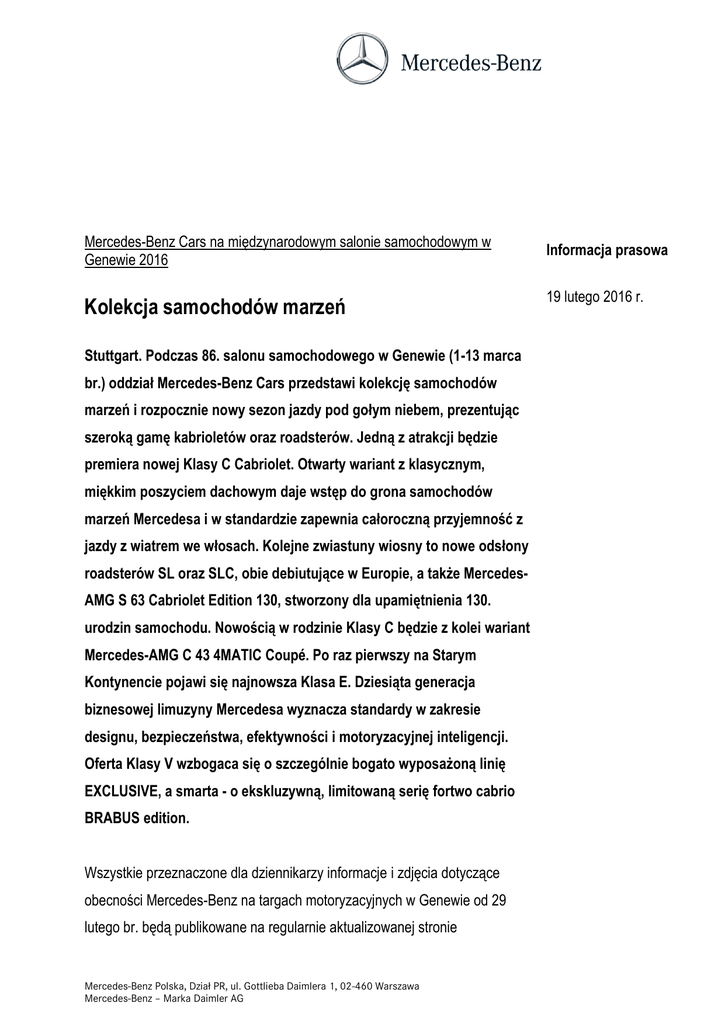Mercedes-Benz Cars na międzynarodowym salonie samochodowym w Genewie 2016 Kolekcja samochodów marzeń Stuttgart. Podczas 86. salonu samochodowego w Genewie (1-13 marca br.) oddział Mercedes-Benz Cars przedstawi kolekcję samochodów marzeń i rozpocznie nowy sezon jazdy pod gołym niebem, prezentując szeroką gamę kabrioletów oraz roadsterów. Jedną z atrakcji będzie premiera nowej Klasy C Cabriolet. Otwarty wariant z klasycznym, miękkim poszyciem dachowym daje wstęp do grona samochodów marzeń Mercedesa i w standardzie zapewnia całoroczną przyjemność z jazdy z wiatrem we włosach. Kolejne zwiastuny wiosny to nowe odsłony roadsterów SL oraz SLC, obie debiutujące w Europie, a także MercedesAMG S 63 Cabriolet Edition 130, stworzony dla upamiętnienia 130. urodzin samochodu. Nowością w rodzinie Klasy C będzie z kolei wariant Mercedes-AMG C 43 4MATIC Coupé. Po raz pierwszy na Starym Kontynencie pojawi się najnowsza Klasa E. Dziesiąta generacja biznesowej limuzyny Mercedesa wyznacza standardy w zakresie designu, bezpieczeństwa, efektywności i motoryzacyjnej inteligencji. Oferta Klasy V wzbogaca się o szczególnie bogato wyposażoną linię EXCLUSIVE, a smarta - o ekskluzywną, limitowaną serię fortwo cabrio BRABUS edition. Wszystkie przeznaczone dla dziennikarzy informacje i zdjęcia dotyczące obecności Mercedes-Benz na targach motoryzacyjnych w Genewie od 29 lutego br. będą publikowane na regularnie aktualizowanej stronie Mercedes-Benz Polska, Dział PR, ul. Gottlieba Daimlera 1, 02-460 Warszawa Mercedes-Benz – Marka Daimler AG Informacja prasowa 19 lutego 2016 r. Strona 2 www.mercedes-benz.com/geneva. Impreza dla mediów „Mercedes-Benz Media Night”, rozpoczynająca się w poniedziałek 29 lutego o 19.30, oraz czwartkowa konferencja prasowa (1 marca, od 8.15) będą transmitowane na żywo na stronie www.daimler.gomexlive.com. „Srebrny przepływ” - motyw stoiska Mercedes-Benz w Genewie Prezentowanej w Genewie kolekcji samochodów marzeń Mercedes-Benz towarzyszy fascynująca sceneria: dynamicznie ukształtowana rzeźba ze swobodnie zawieszonych srebrnych listew tworzy doskonałą oprawę dla premier nowych modeli. Instalacja „Srebrny przepływ” zdaje się unosić w powietrzu ponad obszernym stoiskiem o powierzchni 3120 m kw. i wspólnie z centralną przestrzenią medialną tworzy przestronną scenę dla premier nowych modeli. W sumie podczas dni dla publiczności Mercedes-Benz pokaże w Genewie 37 aut. Innowacyjna tematyka prezentowana jest po przeciwnej stronie, na interaktywnych stanowiskach pośrodku stoiska. W strefie „E-Mobilności” będzie można zobaczyć imponującą gamę hybrydowych Mercedesów, w tym Klasę E, GLE oraz GLC, jak również w pełni elektryczną Klasę B oraz panującego Mistrza Świata Formuły 1 - bolid Mercedes-AMG Petronas F1 W06 Hybrid. Dynamiczna forma „Srebrnego przepływu” prowadzi gości za główne stoisko, do sekcji Mercedes-AMG i Mercedes me - nowej marki usług Mercedes-Benz. W osobnej strefie odwiedzający mogą dowiedzieć się więcej na temat szerokiej gamy opcji Mercedes me i licznych możliwości ich indywidualizacji - Mercedes-Benz Polska, Dział PR, ul. Gottlieba Daimlera 1, 02-460 Warszawa Mercedes-Benz – Marka Daimler AG Strona 3 od połączenia samochodu ze smartfonem przez innowacyjne rozwiązania z zakresu mobilności do inspirujących ofert finansowych i serwisowych oraz tych spoza tematyki motoryzacyjnej. Koncepcja „Srebrnego przepływu” Mercedes-Benz świętowała swoją premierę w 2014 roku, podczas targów motoryzacyjnych w Paryżu. Rok później była wykorzystana na salonie we Frankfurcie. Dzięki swojej elastyczności strukturę można łatwo dostosowywać do odmiennych warunków architektonicznych w różnych halach targowych, zachowując przy tym jej efektowny wygląd. Czas świętowania: 10. urodziny Muzeum Mercedes-Benz Otwarty design sprawia, że z kawiarni na poziomie 1 goście mają fascynujący widok na całe stoisko. W kawiarni odbędzie się także impreza urodzinowa dla przyjaciół i fanów marki z okazji 10. rocznicy uruchomienia Muzeum Mercedes-Benz. Otwarte w 2006 roku, muzeum prezentuje historię samochodu od samych jego narodzin, a przy okazji daje również wgląd w przyszłość motoryzacji. W ciągu 10 lat odwiedziło je ponad 7,1 mln osób. Kontakt: Aleksander Rzepecki Tel. +22 / 312 72 23 [email protected] Mercedes-Benz Polska, Dział PR, ul. Gottlieba Daimlera 1, 02-460 Warszawa Mercedes-Benz – Marka Daimler AG
