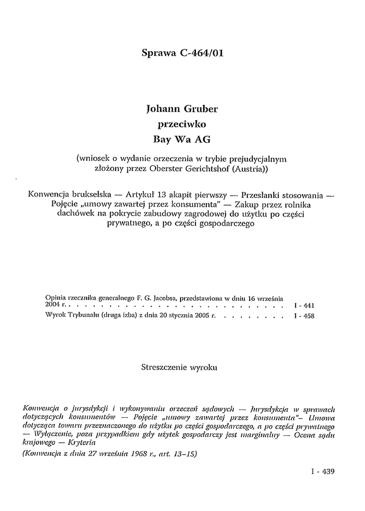 Sprawa C-464/01 Johann Gruber przeciwko Bay Wa AG (wniosek o wydanie orzeczenia w trybie prejudycjalnym złożony przez Oberster Gerichtshof (Austria)) Konwencja brukselska — Artykuł 13 akapit pierwszy — Przesłanki stosowania — Pojęcie „umowy zawartej przez konsumenta" — Zakup przez rolnika dachówek na pokrycie zabudowy zagrodowej do użytku po części prywatnego, a po części gospodarczego Opinia rzecznika generalnego F. G. Jacobsa, przedstawiona w dniu 16 września 2004 r Wyrok Trybunatu (druga izba) z dnia 20 stycznia 2005 r I-441 I - 458 Streszczenie wyroku Konwencja o jurysdykcji i wykonywaniu orzecze s dowych — Jurysdykcja w sprawach dotycz cych konsumentów — Poj cie „umowy zawartej przez konsumenta"- Umowa dotycz ca towaru przeznaczonego do u ytku po cz ci gospodarczego, a po cz ci prywatnego — Wy czenie, poza przypadkiem gdy u ytek gospodarczy jest marginalny — Ocena s du krajowego — Kryteria (Konwencja z dnia 27 wrze nia 1968 r., art. 13-15) I - 439 STRESZCZENIE - Przepisy jurysdykcyjne ustanowione w Konwencji z dnia 27 września 1968 r. o jurysdykcji i wykonywaniu orzeczeń sądo wych w sprawach cywilnych i handlowych, w brzmieniu zmienionym przez Konwencję z dnia 9 października 1978 r. w sprawie przystąpienia Królestwa Danii, Irlandii i Zjednoczonego Królestwa Wielkiej Brytanii i Irlandii Północnej, przez Konwencję z dnia 25 października 1982 r. w sprawie przystą pienia Republiki Greckiej, przez Konwencję z dnia 26 maja 1989 r. w sprawie przystą pienia Królestwa Hiszpanii i Republiki Por tugalii oraz przez Konwencję z dnia 29 listopada 1996 r. w sprawie przystąpienia Republiki Austrii, Republiki Finlandii i Królestwa Szwecji powinny być interpreto wane w następujący sposób: — osoba, która zawiera umowę dotyczącą towaru przeznaczonego do użytku po części gospodarczego, a po części niezwiązanego z jej działalnością gospodar czą, nie ma prawa powoływania się na dobrodziejstwo przepisów art. 13-15 tej konwencji, z wyjątkiem sytuacji, gdy użytek gospodarczy jest na tyle margi nalny, iż odgrywa jedynie nikłą rolę w ogólnym kontekście danej transakcji, przy czym bez znaczenia pozostaje fakt, iż pozagospodarczy aspekt ma charakter dominujący; I - 440 SPRAWA C-464/01 — zadaniem sądu, przed którym zawisł spór, jest rozstrzygnięcie kwestii, czy dana umowa została zawarta w celu zaspokojenia — w niepomijalnym zakresie — potrzeb wynikających z działalności gospodarczej danej osoby, czy raczej użytek gospodarczy odgrywał zaledwie nieznaczącą rolę; — w tym celu sąd powinien wziąć pod uwagę całość istotnych okoliczności faktycznych wynikających w sposób obiektywny z akt sprawy; jednocześnie nie należy brać pod uwagę okoliczności ani faktów, o których kontrahent umowy mógł wiedzieć podczas zawierania umowy, chyba że osoba powołująca się na swój status konsumenta zachowała się w taki sposób, iż swym zachowaniem wywołała w świadomości drugiej strony umowy uzasadnione wrażenie, iż działała w celach gospodarczych. (por. pkt 54 i sentencja)